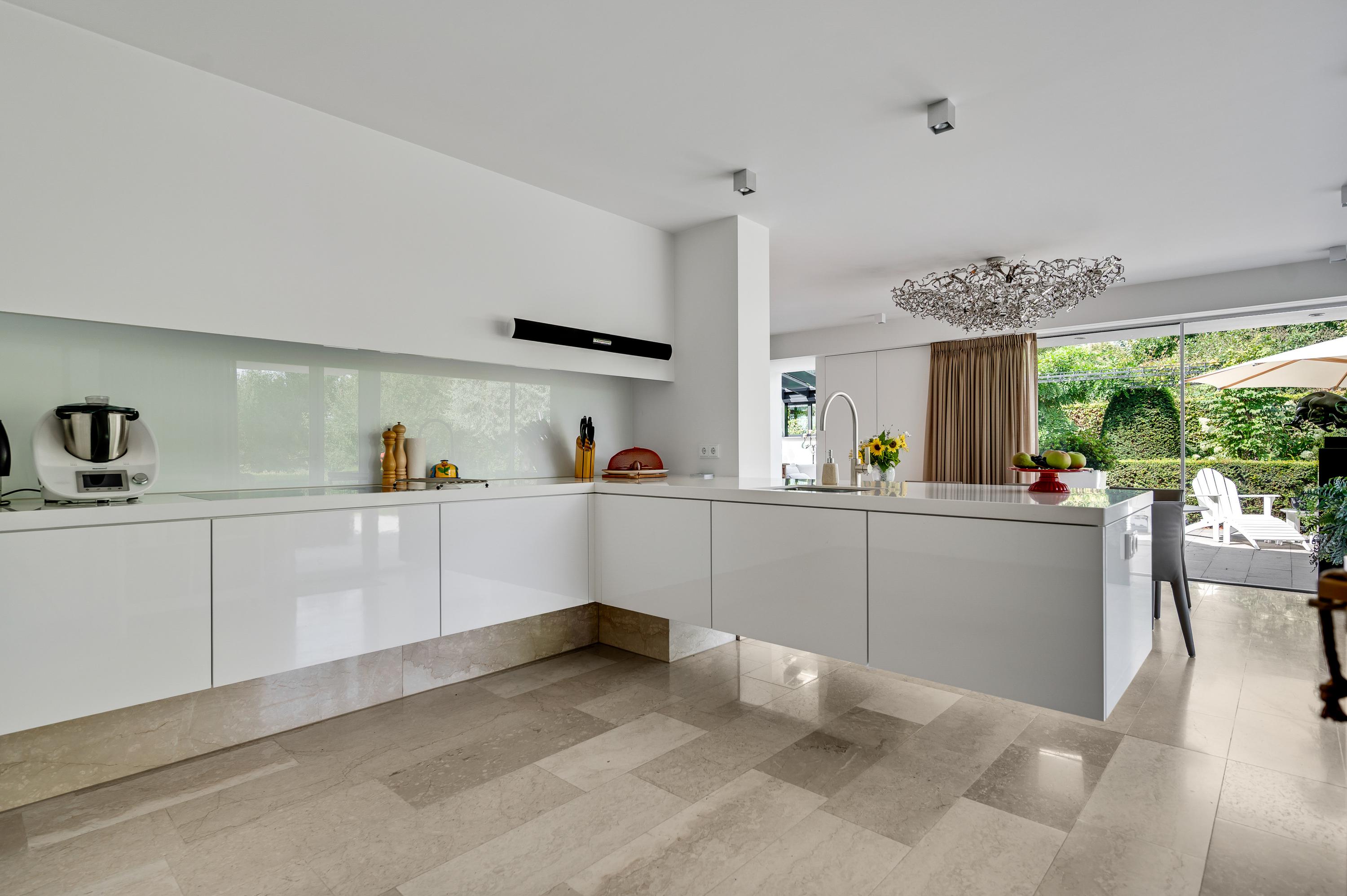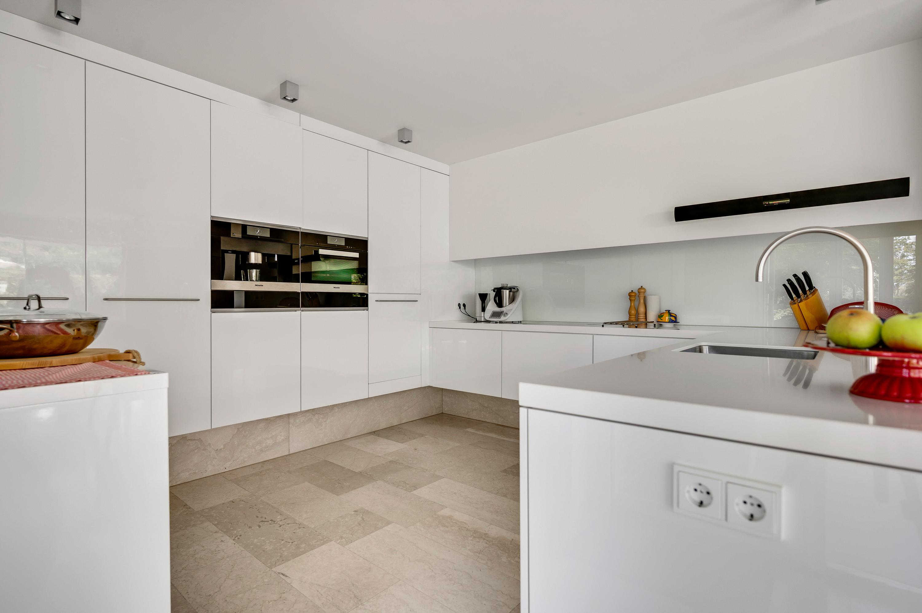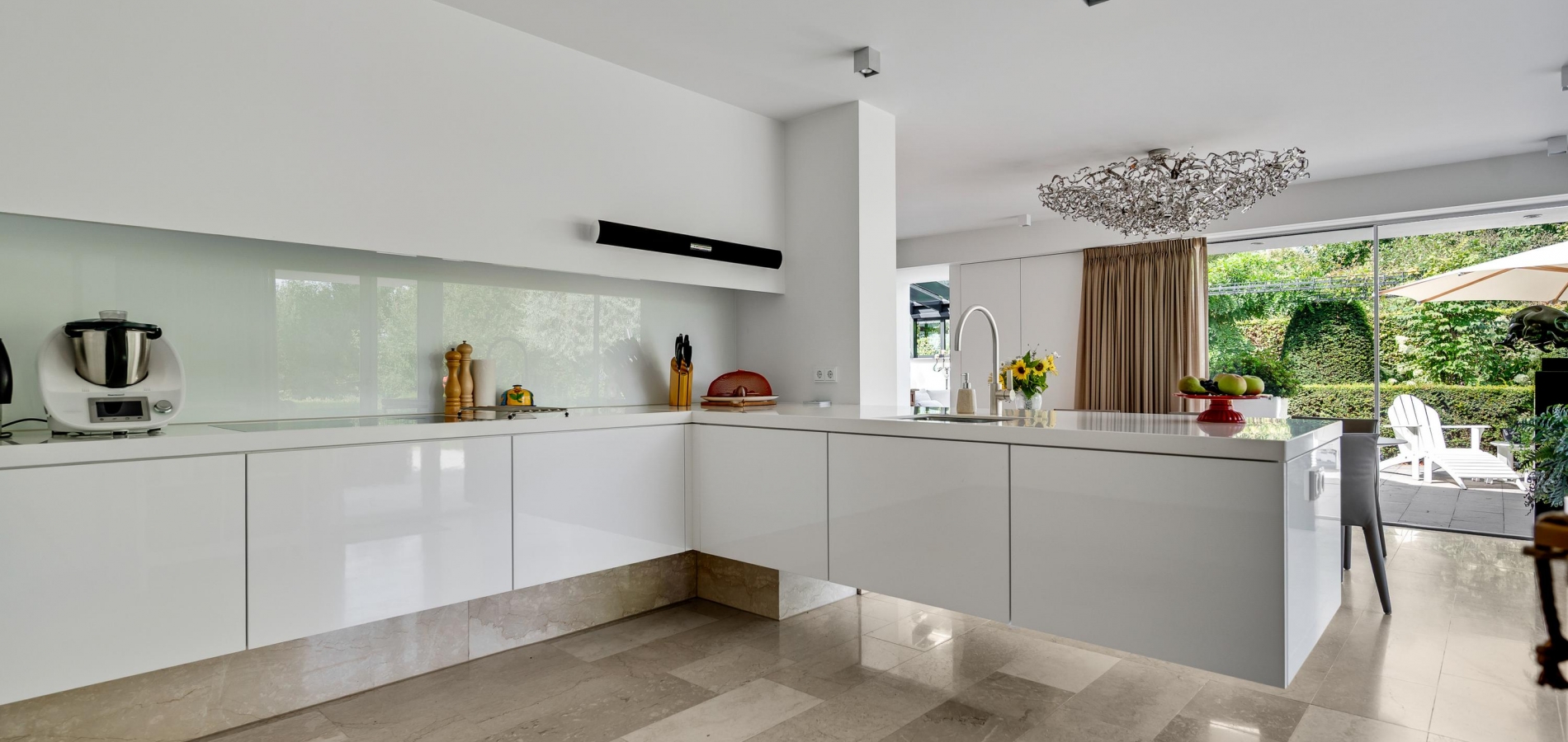 Vlak naast de eetkamer is de keuken (circa 13 m2), waar design de boventoon voet. De maatwerkkeuken in een U-vorm is een droomkeuken voor de kook- en bakliefhebber, met inbouwapparatuur van Miele: een inductie kookplaat, afzuigkap, combi-oven, koelkast, vaatwasser en een koffiemachine.
