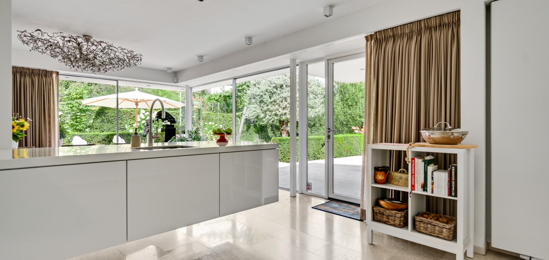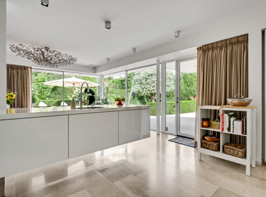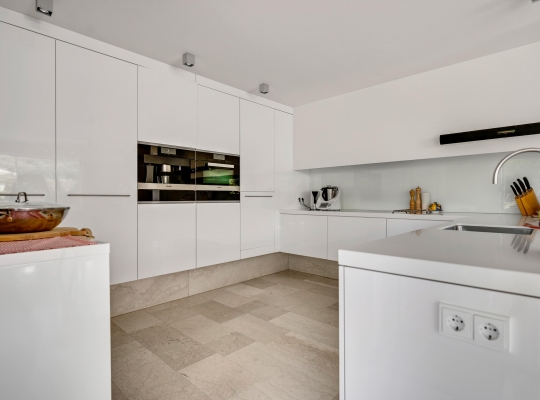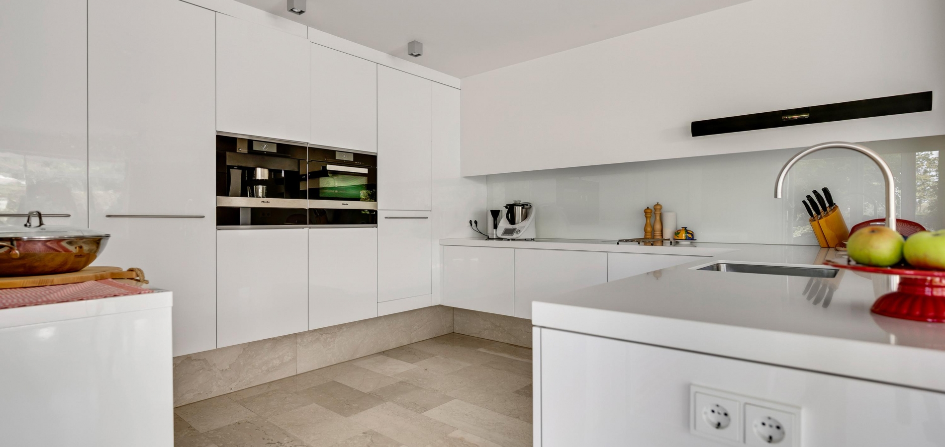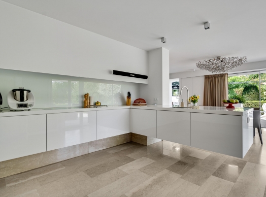 Vlak naast de eetkamer is de keuken (circa 13 m2), waar design de boventoon voet. De maatwerkkeuken in een U-vorm is een droomkeuken voor de kook- en bakliefhebber, met inbouwapparatuur van Miele: een inductie kookplaat, afzuigkap, combi-oven, koelkast, vaatwasser en een koffiemachine.