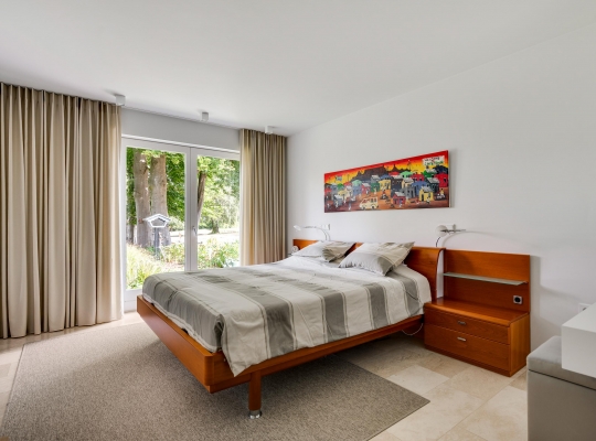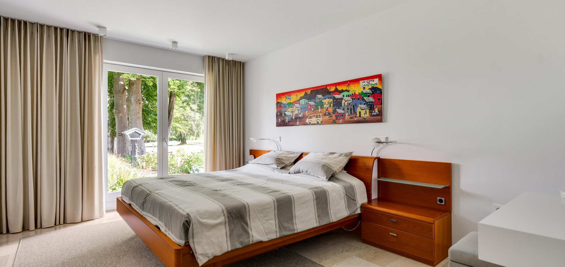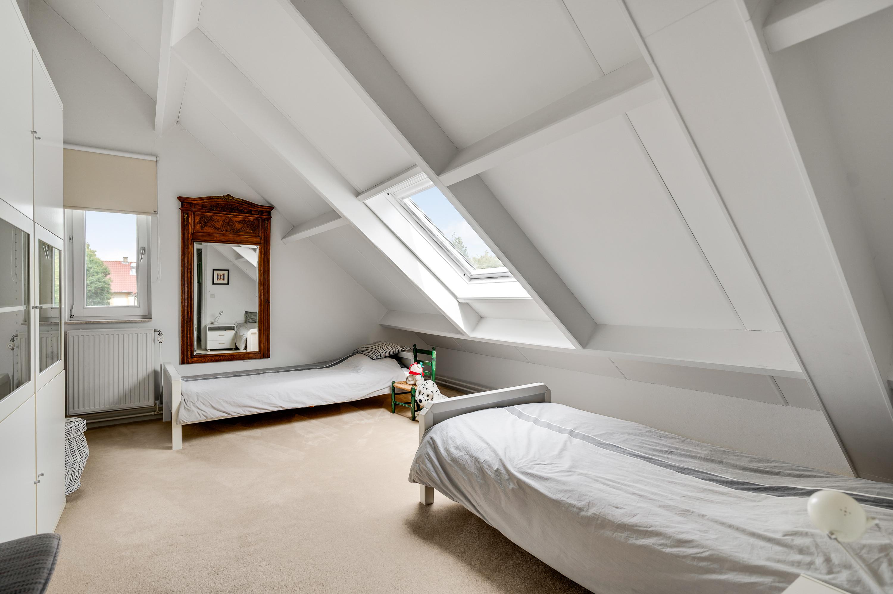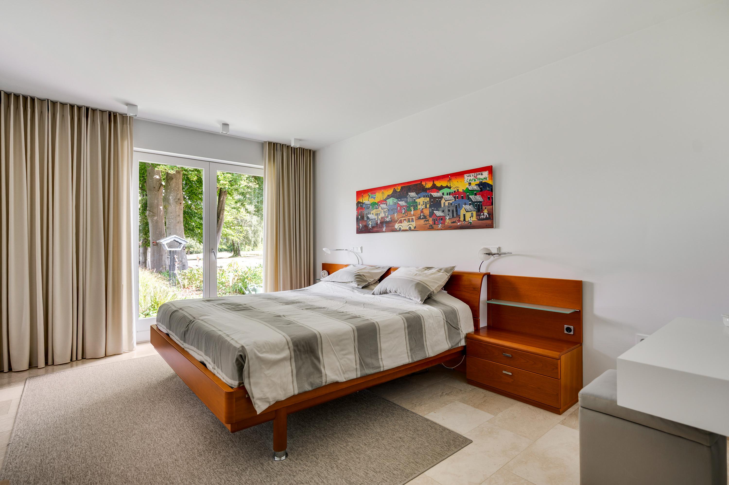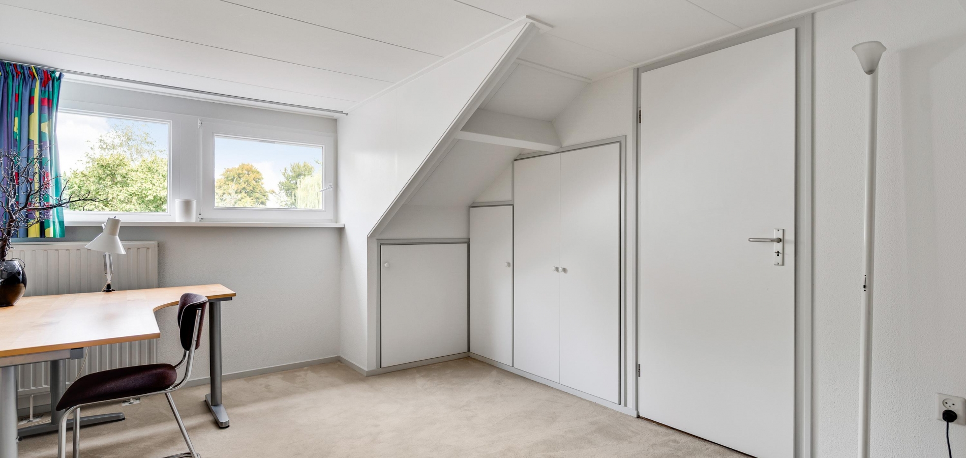 Slaapkamer II (circa 6,30 x 2,69) met een vaste kastenwand bevindt zich aan de voorzijde. Naast deze kamer is slaapkamer III (circa 4,97 x 2,59), met lichtinval aan twee zijden. Slaapkamer IV heeft een bijzondere L-vormige indeling en slaapkamer V (circa 4,87 x 3,18) is aan de achterzijde van deze villa. Deze kamer heeft meerdere inbouwkasten en een berging met de HR-ketel (Atag, huur).