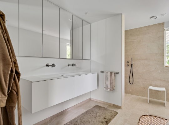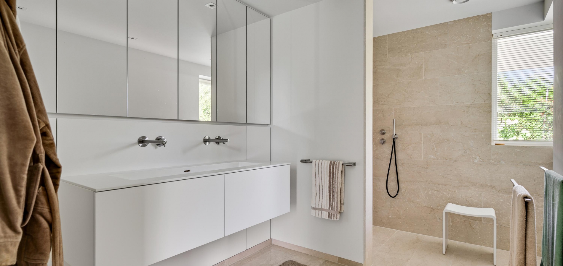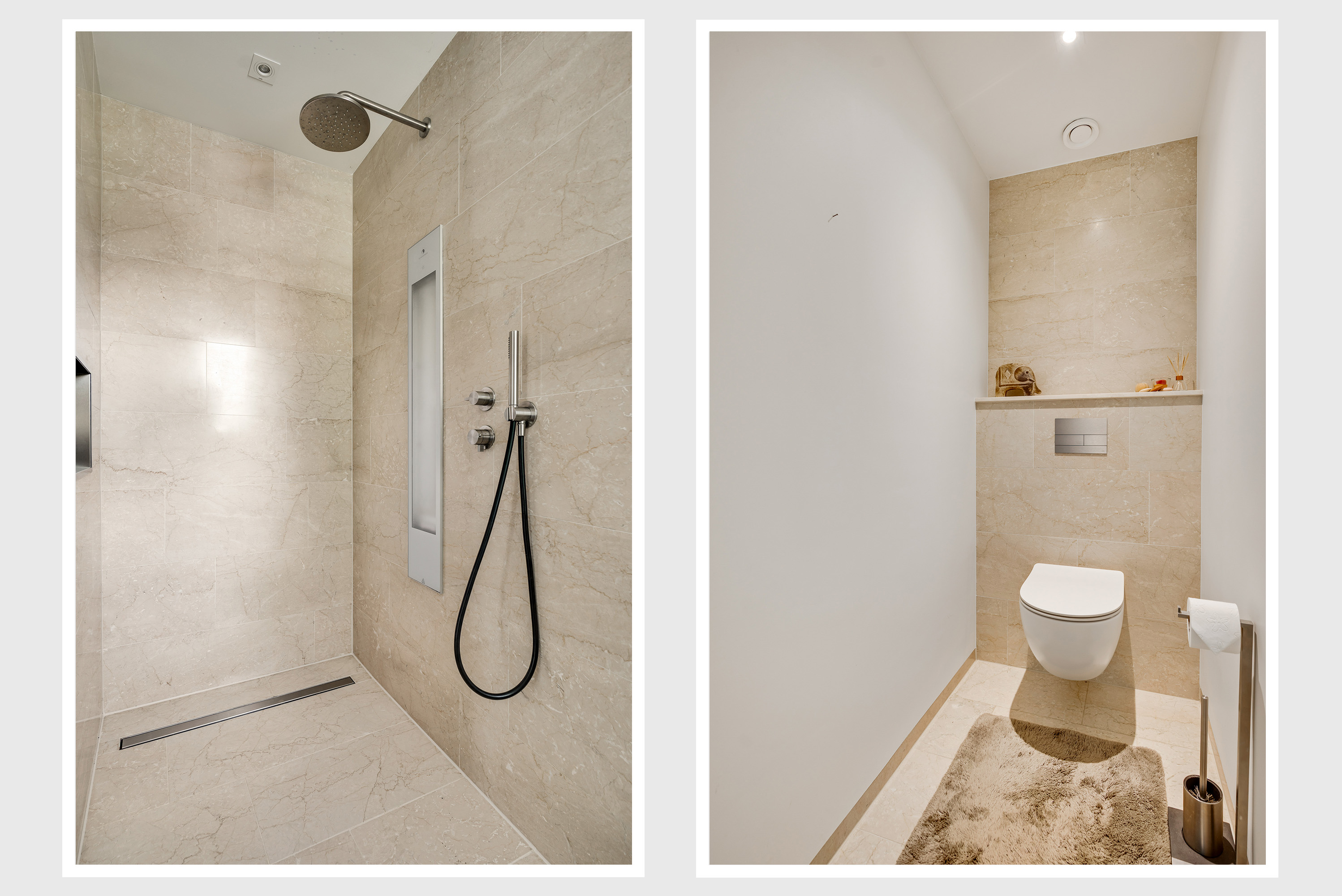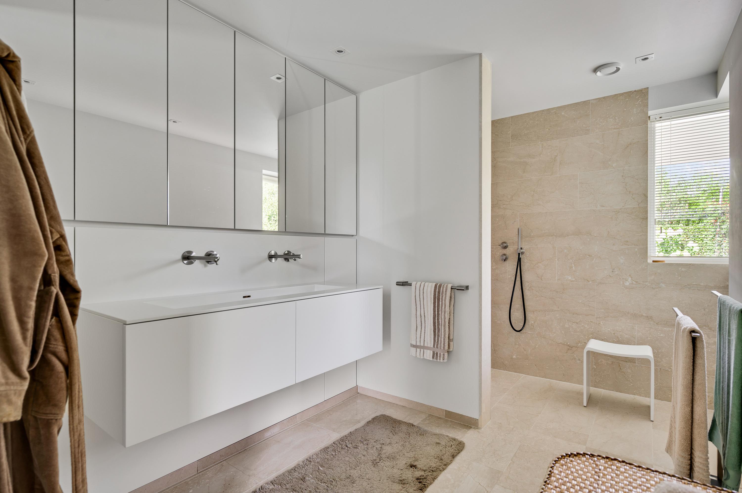 Gelijkvloers wonen is mogelijk dankzij de master bedroom met inloopkast (totaal circa 7,24 x 3,40), met een maatwerk interieur en openslaande deuren naar de achtertuin. De naastgelegen badkamer (circa 3,55 x 2,50) met een inloopdouche met Sunshower, een breed badmeubel en een spiegelkast is het toppunt van luxe en stijl. Om de hoek, bij het portaal naar de hal, is een separate toiletruimte.