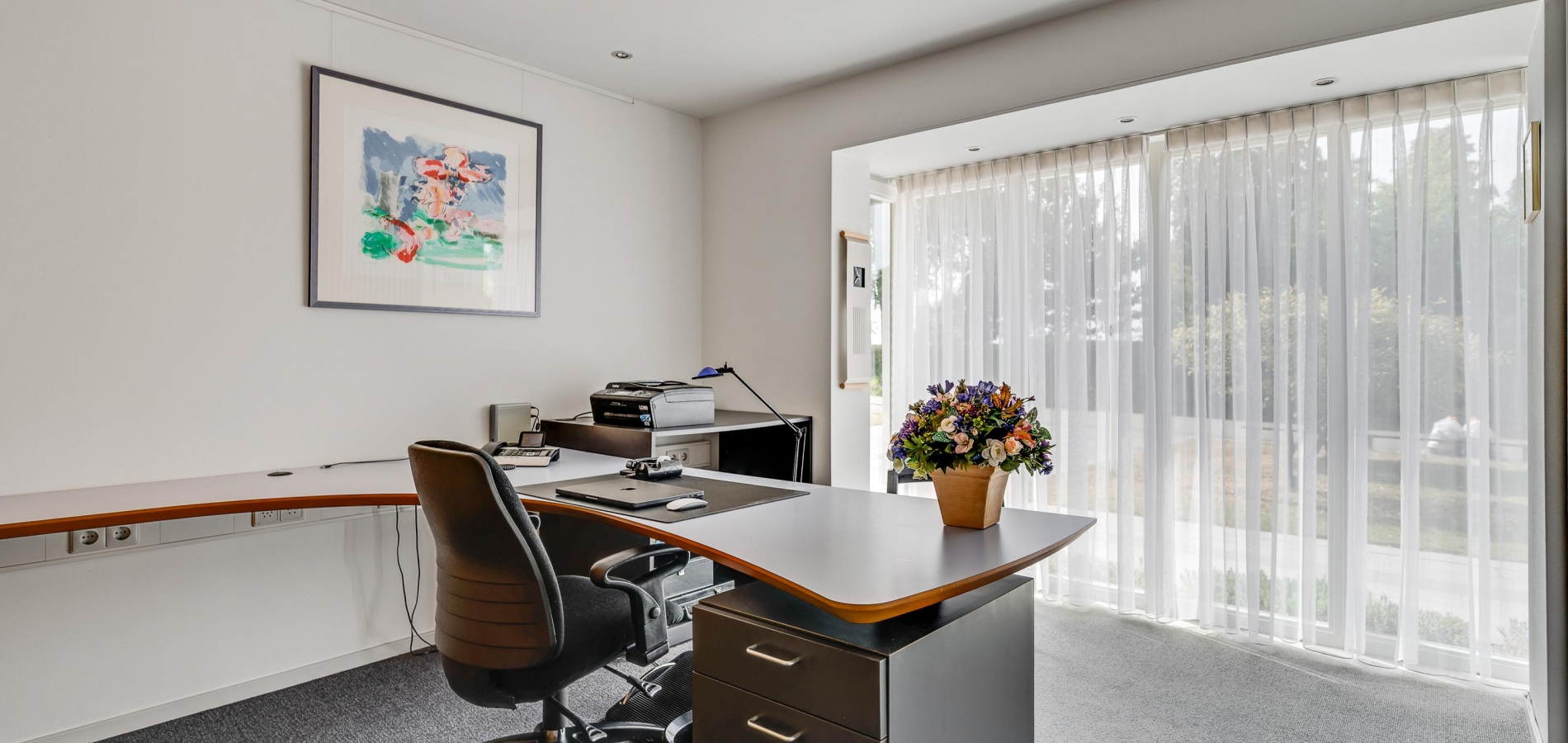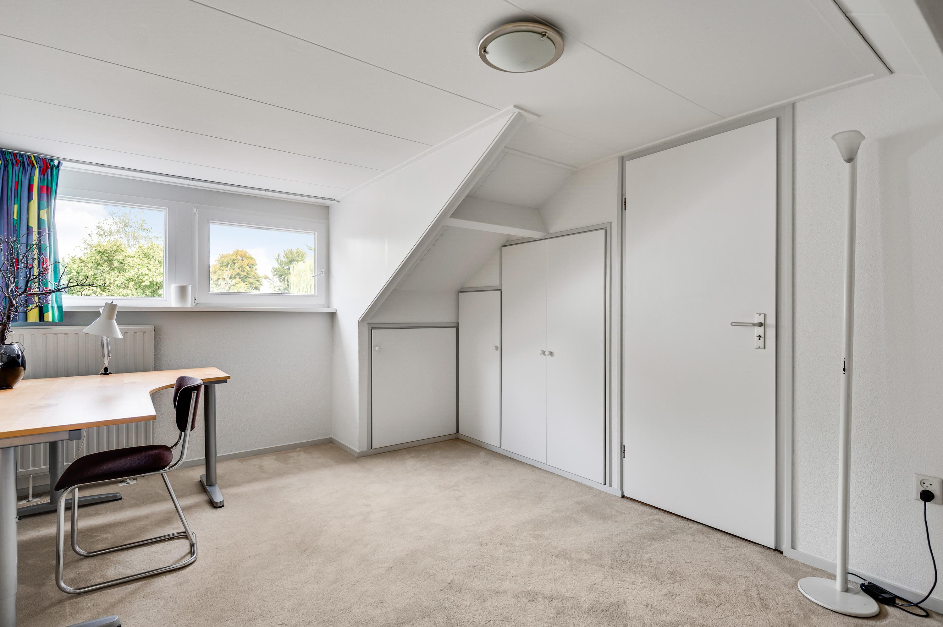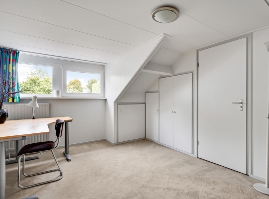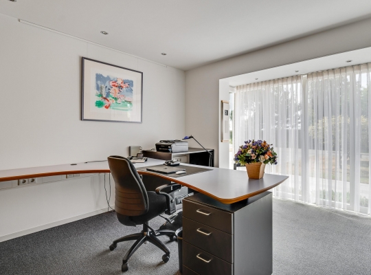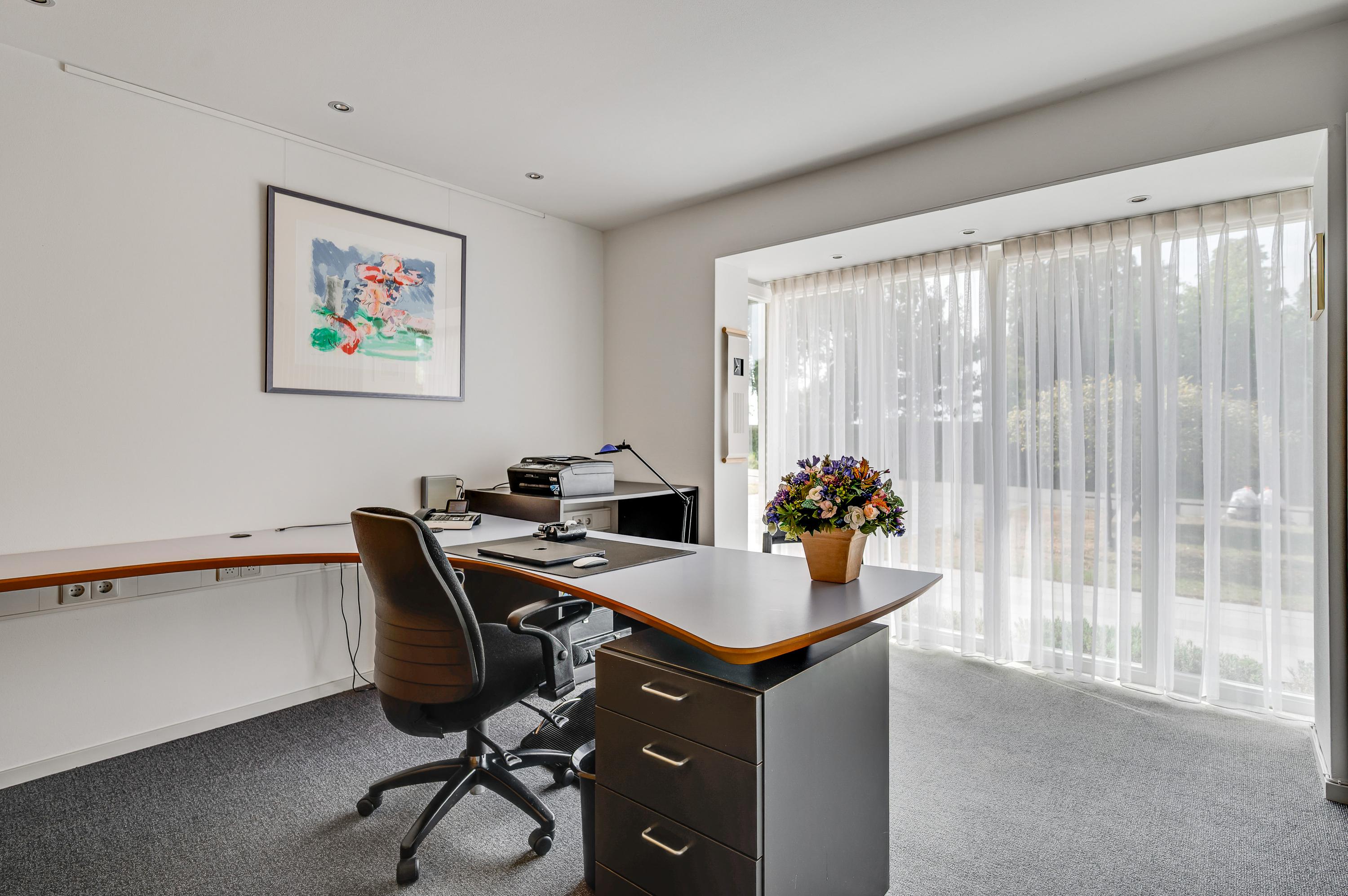 In het rechterdeel van de begane grond is een fraaie kantoorruimte (circa 3,49 x 3,40), met een erker en een maatwerk kastenwand. Tijdens het werken kijkt u naar de mooi aangelegde tuin en de rustige weg. In de naastgelegen bijkeuken (circa 2,61 x 3,40) is volop bergruimte, en er is plek voor een vriezer, de wasmachine en droger.