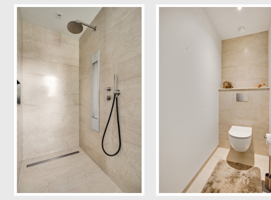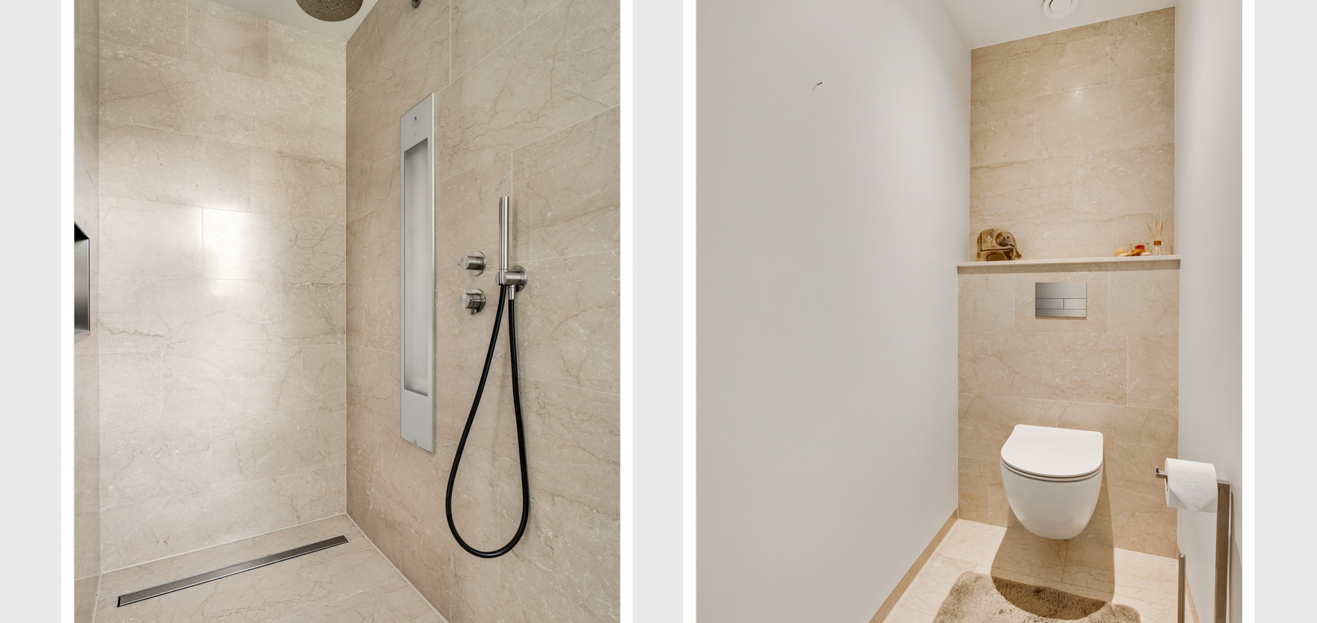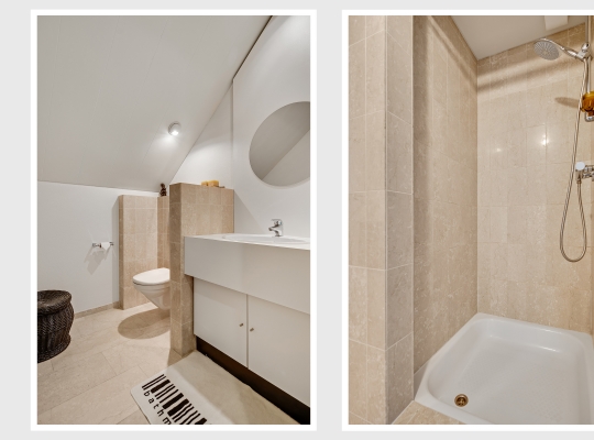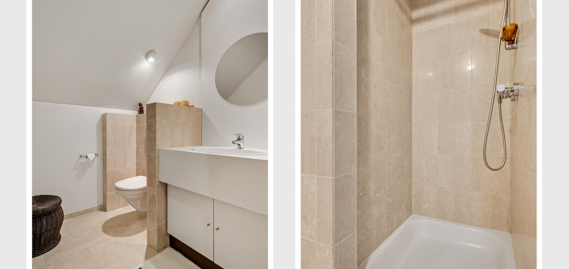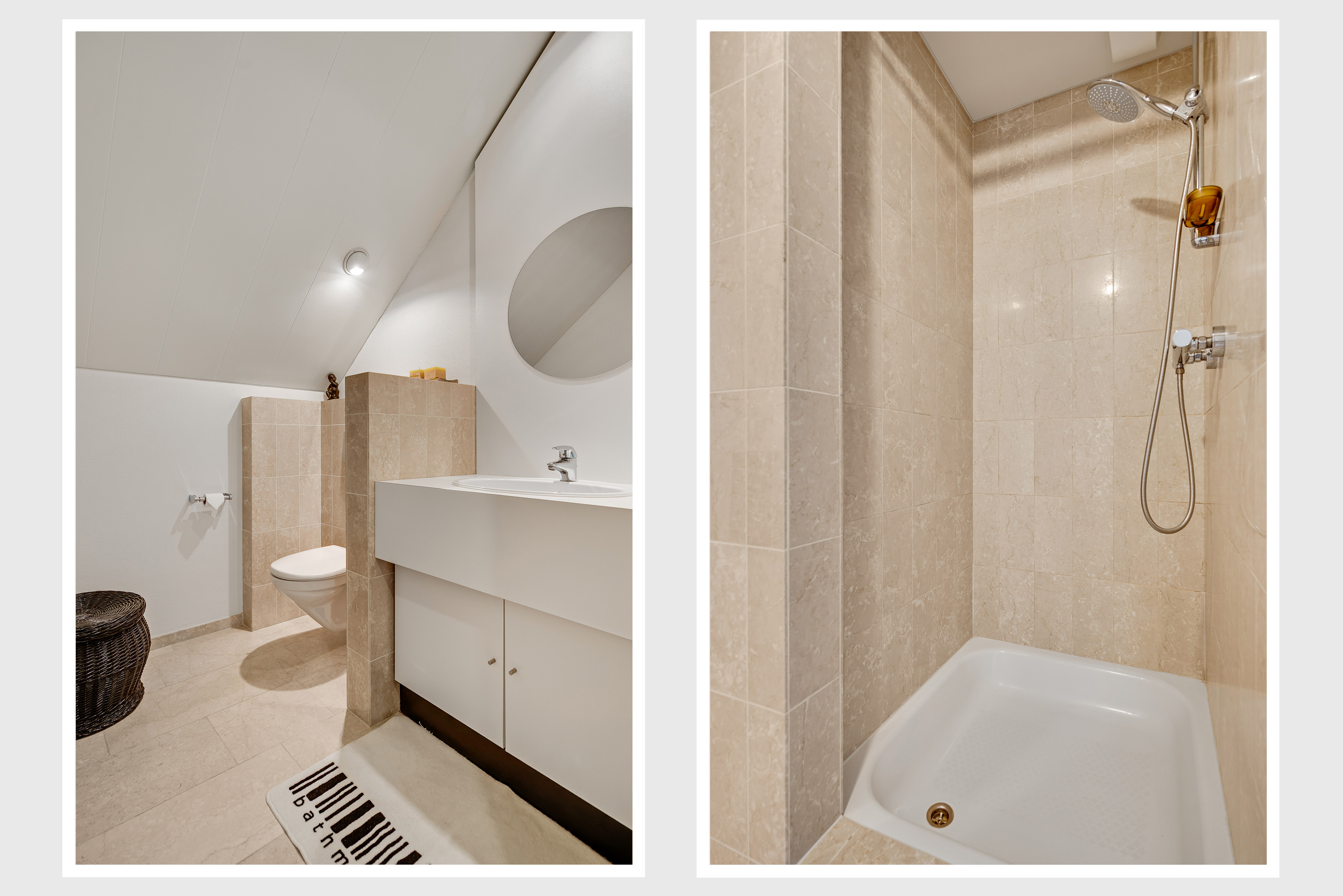 Badkamer II (circa 3,09 x 1,90), voor thuiswonende kinderen en logees, is ingedeeld met een douche, toilet en een wastafelmeubel. Lichte keuren bepalen de sfeer, waardoor de badkamer heel rustig en ruimtelijk oogt.