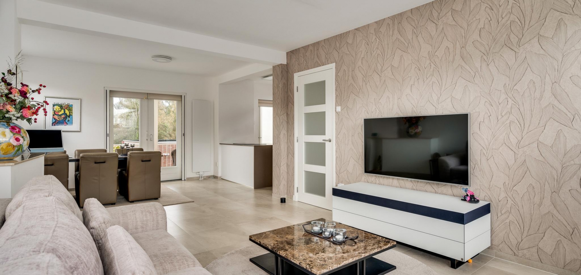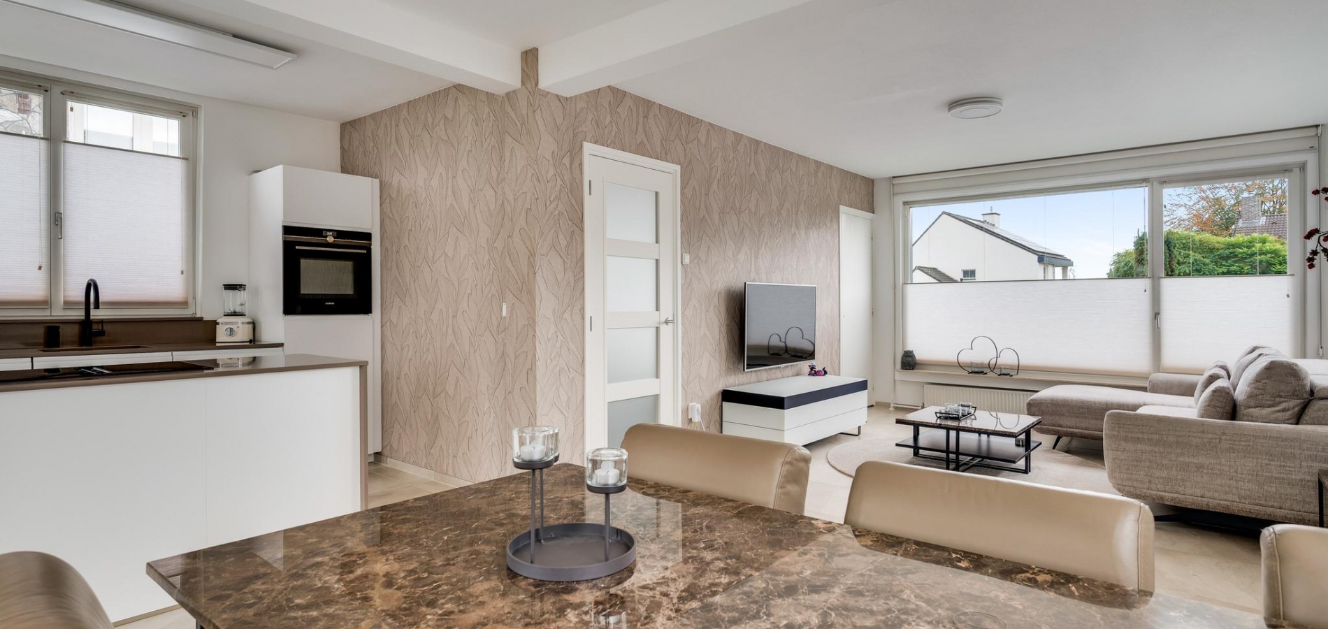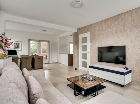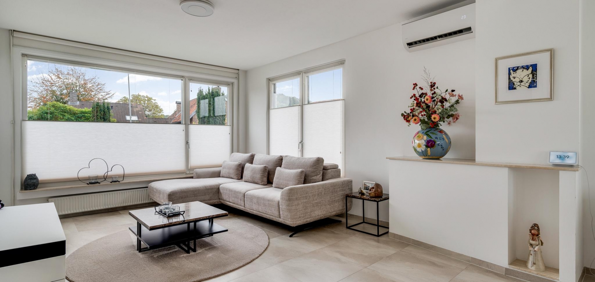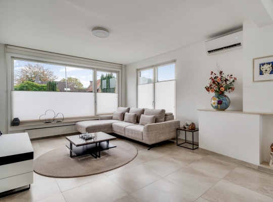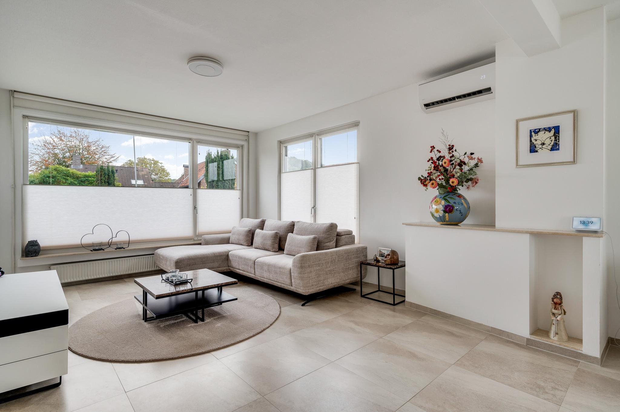 De woonkamer (circa 7,97 x 3,87) is een fantastische leefruimte met grote ramen aan drie zijden en openslaande deuren naar het balkon. Het zitgedeelte is aan de voorzijde en bij de schouw, die niet meer in gebruik is, hangt een airco-unit (koelen en verwarmen). Aan de achterzijde, naast de keuken, is het eetgedeelte met plek voor een grote tafel.