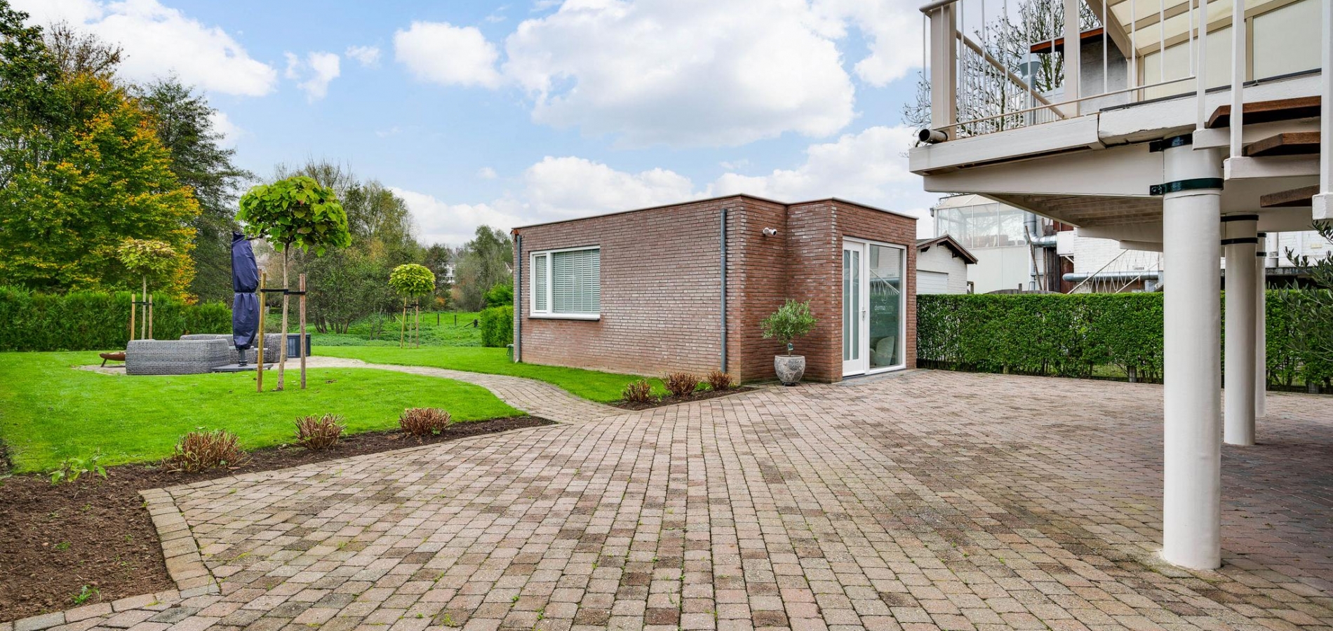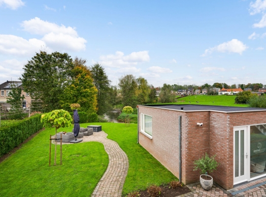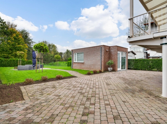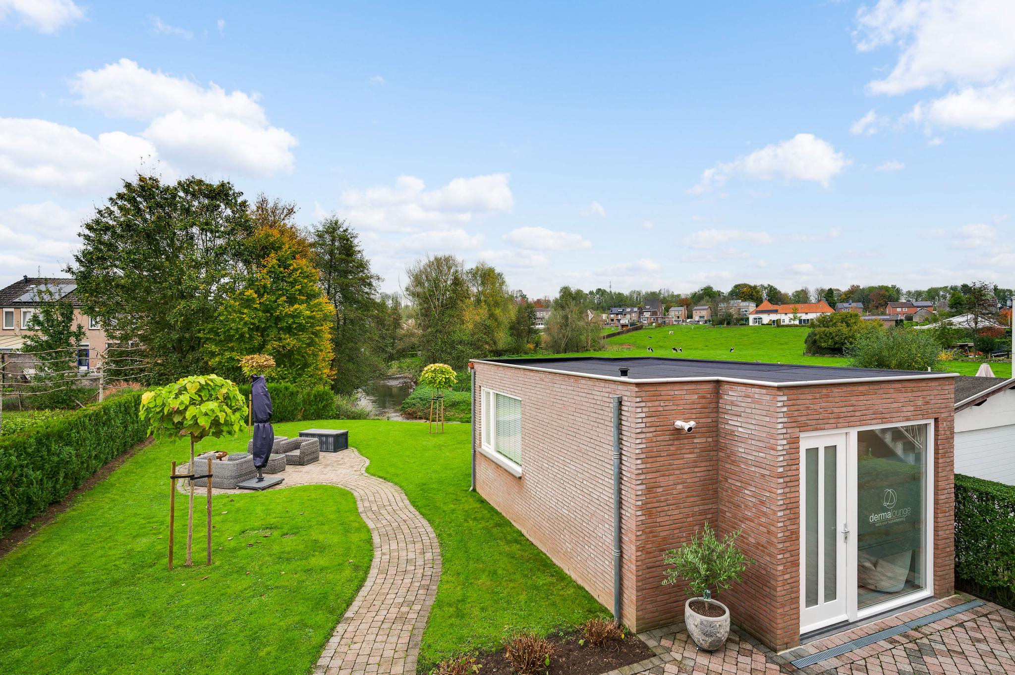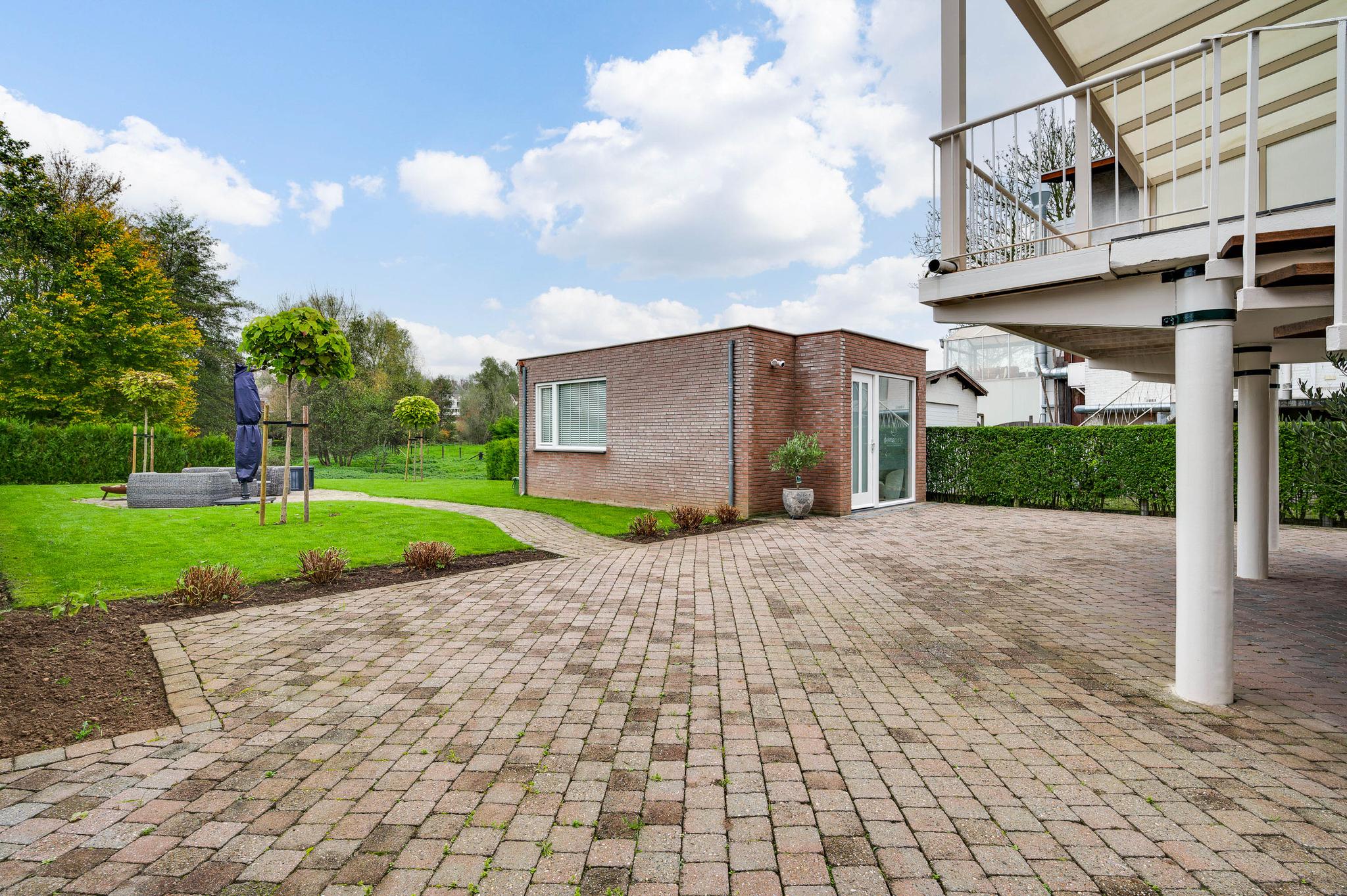 Het bijgebouw staat in de zeer ruime achtertuin, die aan de achterzijde aan de Kleine Geul grenst. Aan het water is een terras gemaakt en in het hart van het gazon is het tweede terras. De bestrating aan drie zijden van het woonhuis kan als groot terras worden gebruikt. Op de oprit, voor en achter de poort, is ruime parkeergelegenheid. Ook op het grind, aan de straatkant, kunnen twee auto’s staan. De mooi aangelegde en goed onderhouden voortuin maakt deze woning meer dan af.