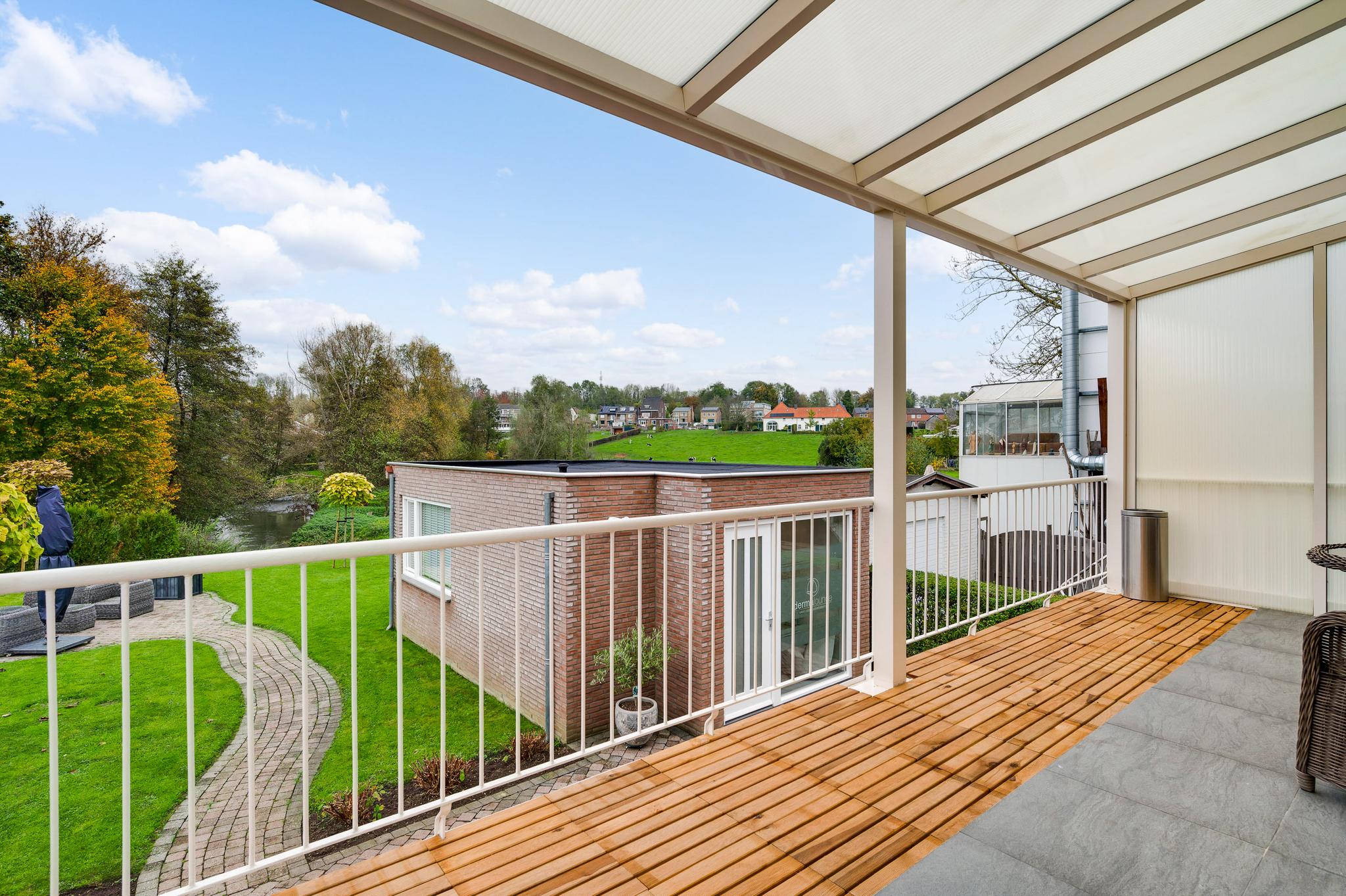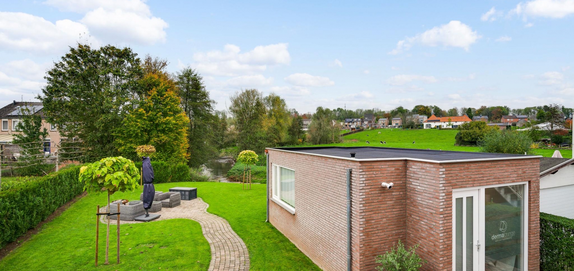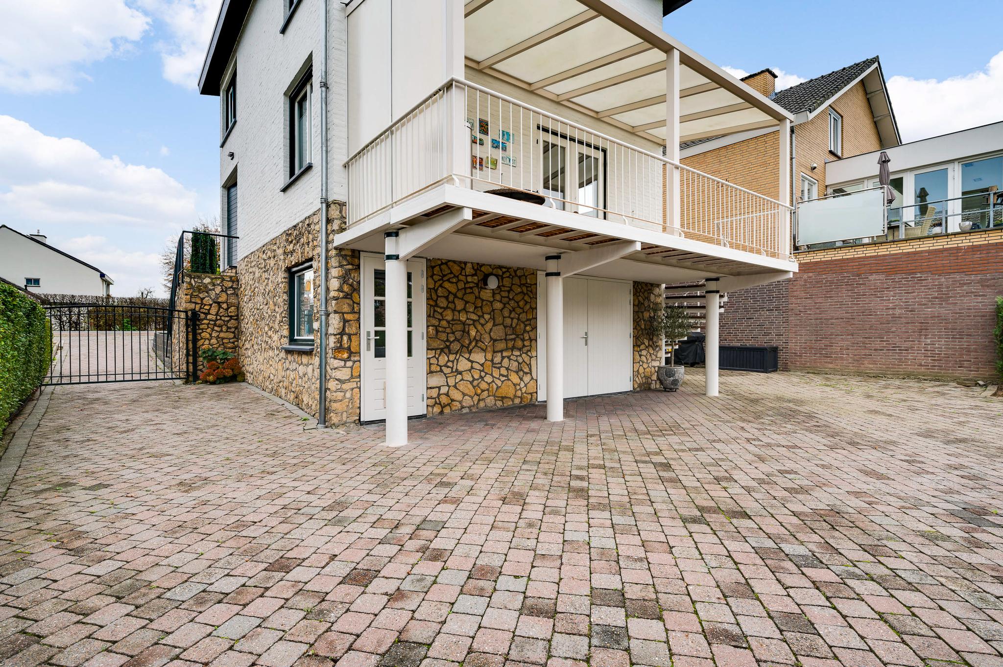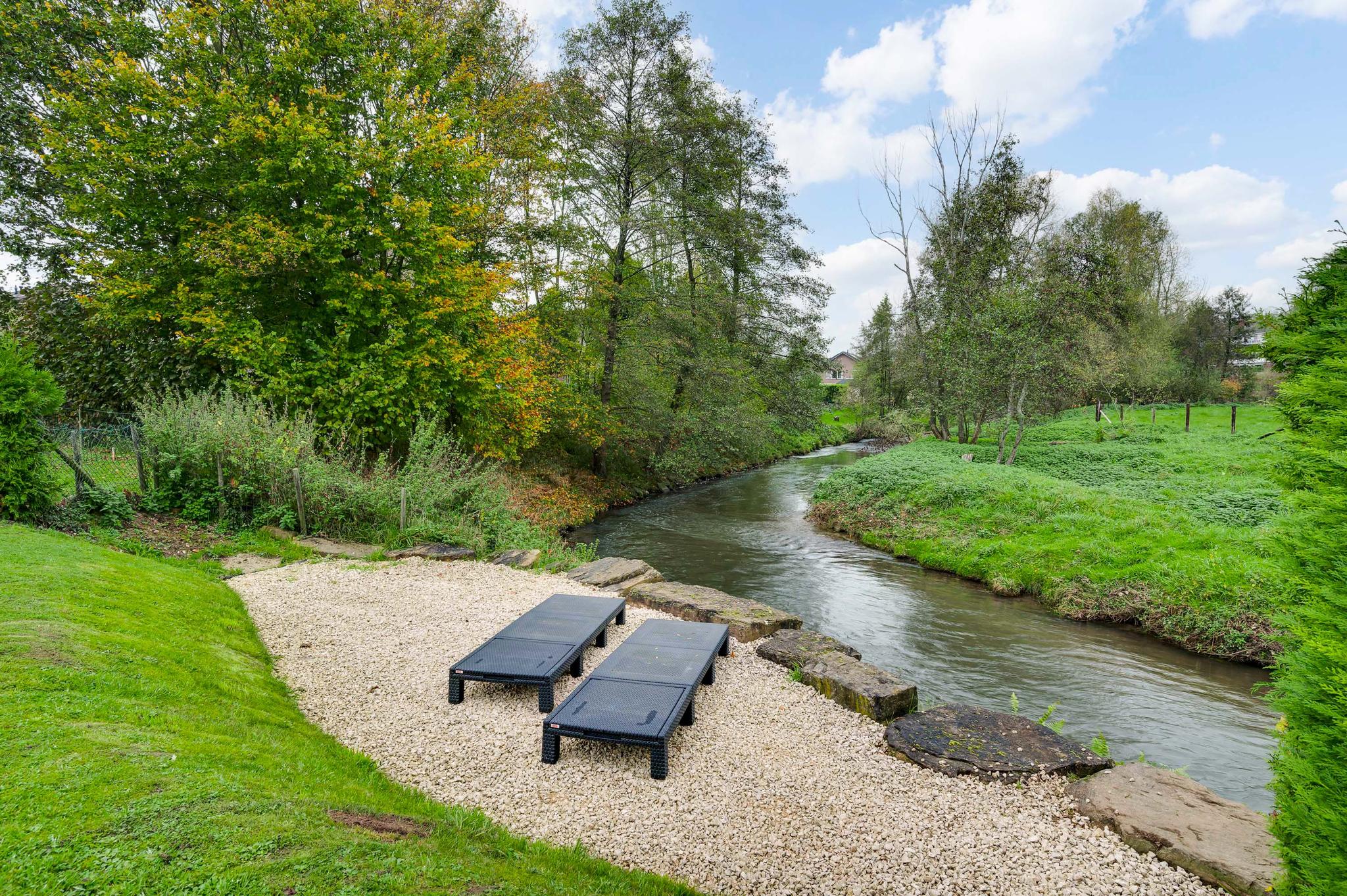Het bijgebouw staat in de zeer ruime achtertuin, die aan de achterzijde aan de Kleine Geul grenst. Aan het water is een terras gemaakt en in het hart van het gazon is het tweede terras. De bestrating aan drie zijden van het woonhuis kan als groot terras worden gebruikt. Op de oprit, voor en achter de poort, is ruime parkeergelegenheid. Ook op het grind, aan de straatkant, kunnen twee auto’s staan. De mooi aangelegde en goed onderhouden voortuin maakt deze woning meer dan af.