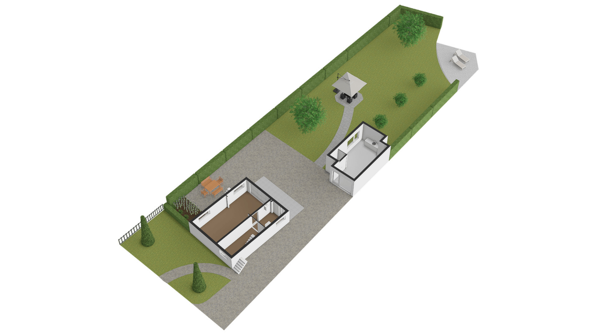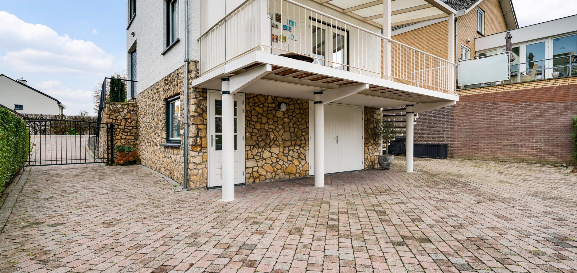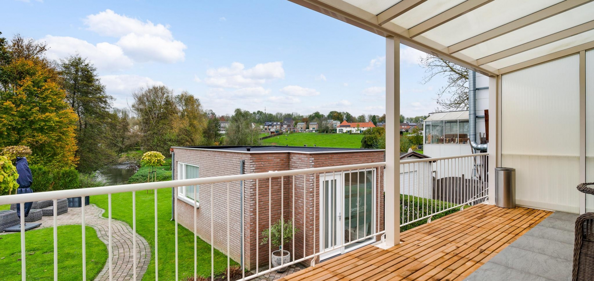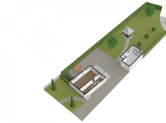Het bijgebouw staat in de zeer ruime achtertuin, die aan de achterzijde aan de Kleine Geul grenst. Aan het water is een terras gemaakt en in het hart van het gazon is het tweede terras. De bestrating aan drie zijden van het woonhuis kan als groot terras worden gebruikt. Op de oprit, voor en achter de poort, is ruime parkeergelegenheid. Ook op het grind, aan de straatkant, kunnen twee auto’s staan. De mooi aangelegde en goed onderhouden voortuin maakt deze woning meer dan af.