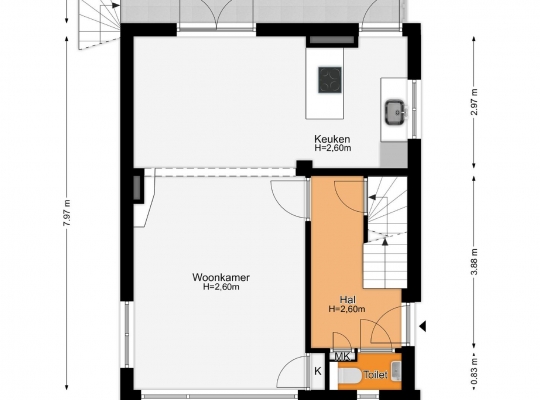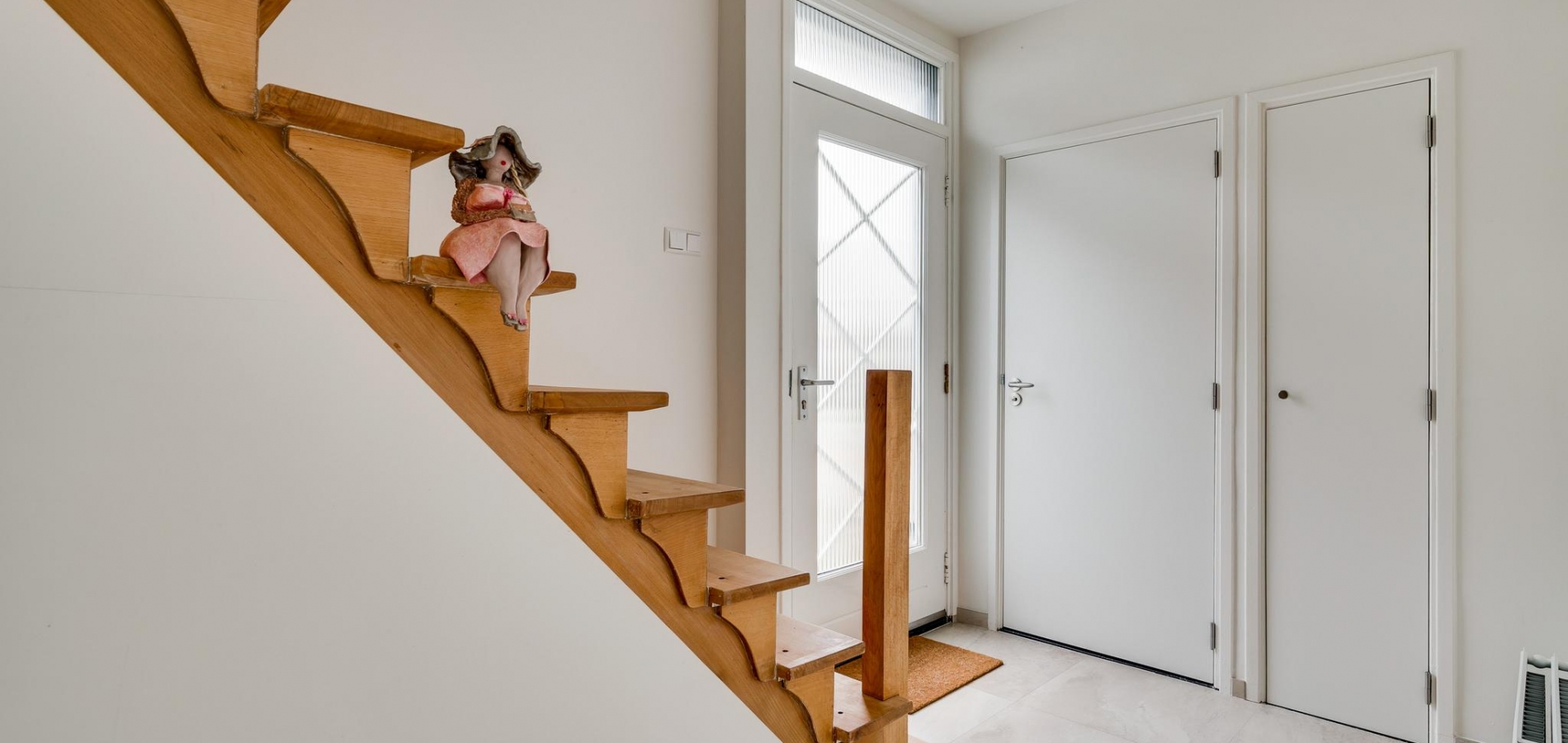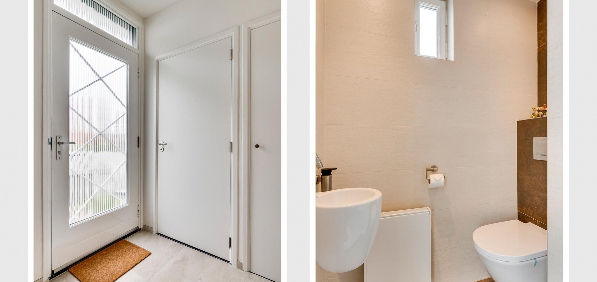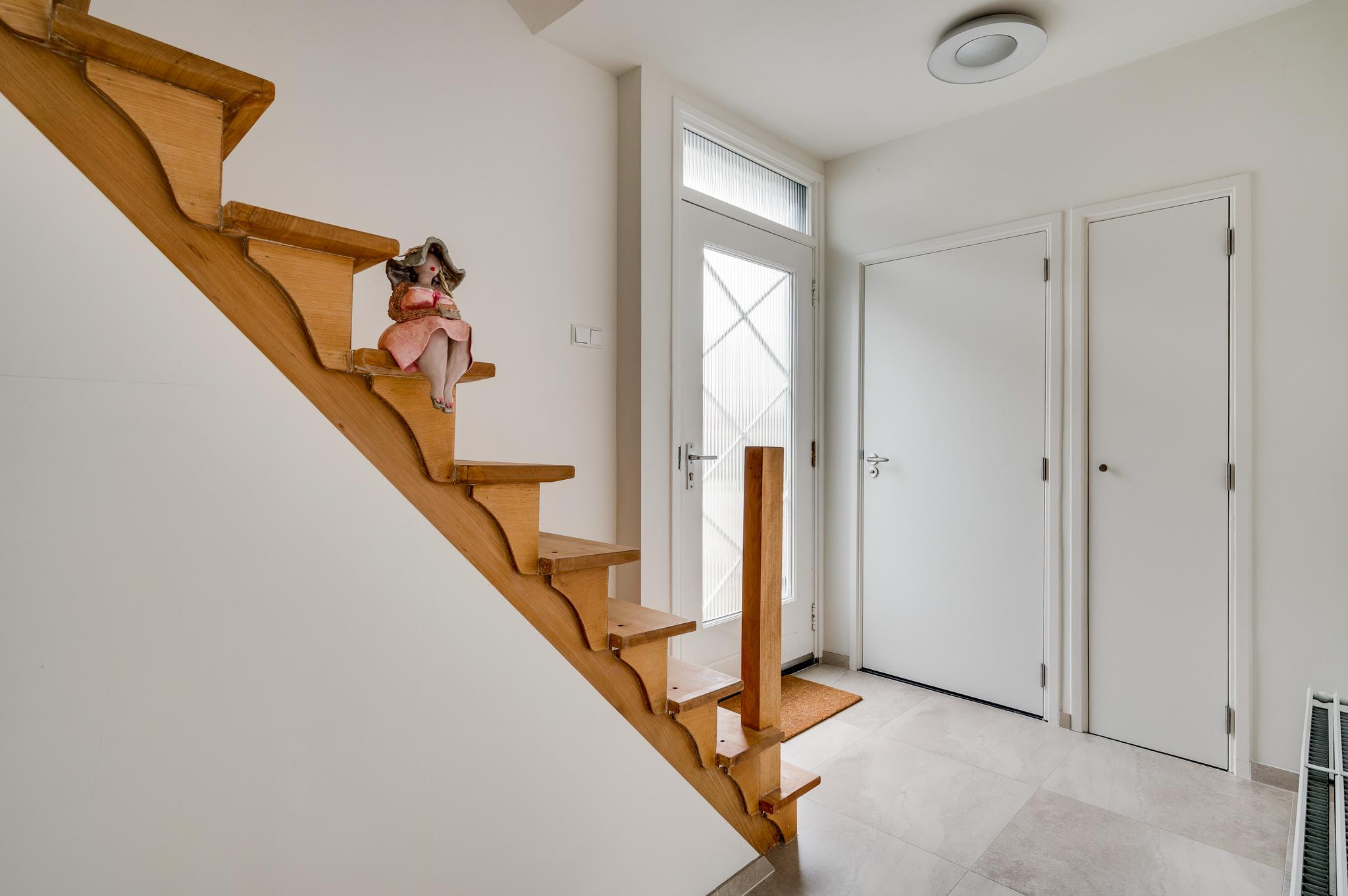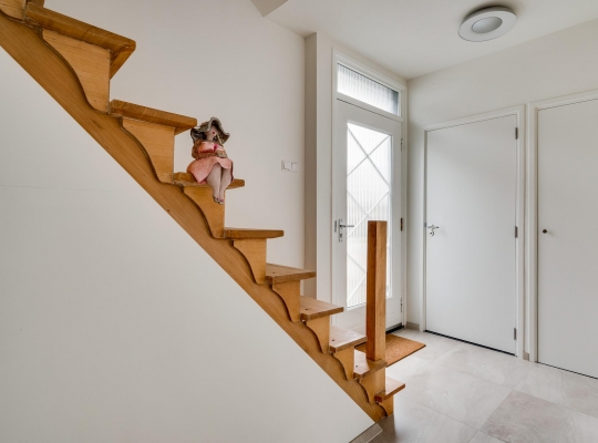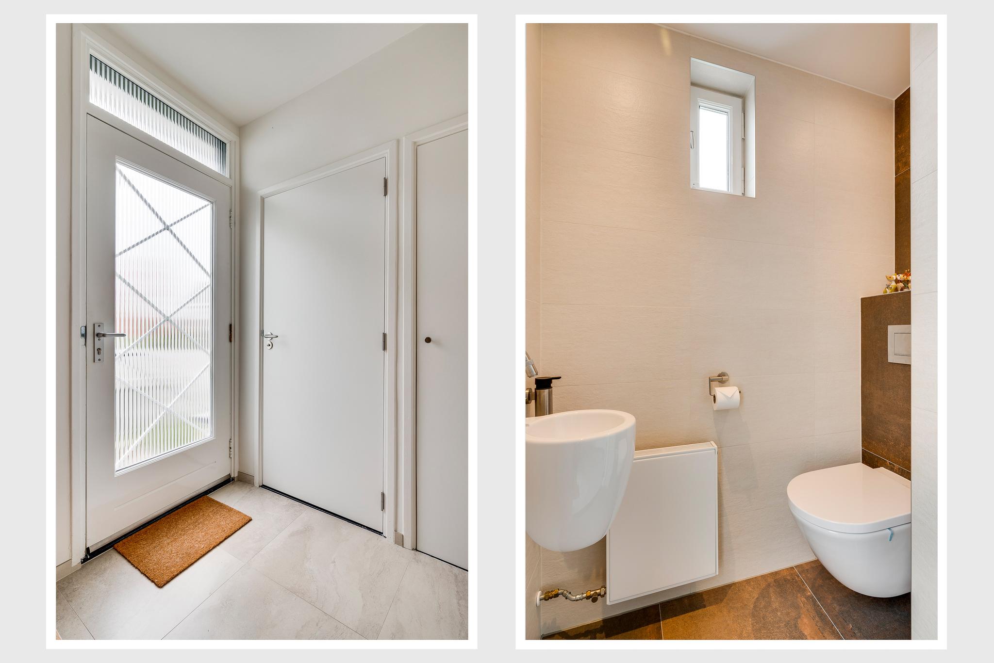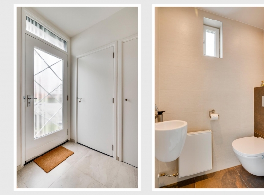 Via de buitentrap loopt u naar de entree van deze geheel verbouwde, instapklare woning. In de ruime ontvangsthal (circa 3,88 x 2,04) ziet u de originele trapopgang en een fraaie, lichte tegelvloer. Naast de meterkast is de moderne toiletruimte met luxe sanitair en mooi tegelwerk.