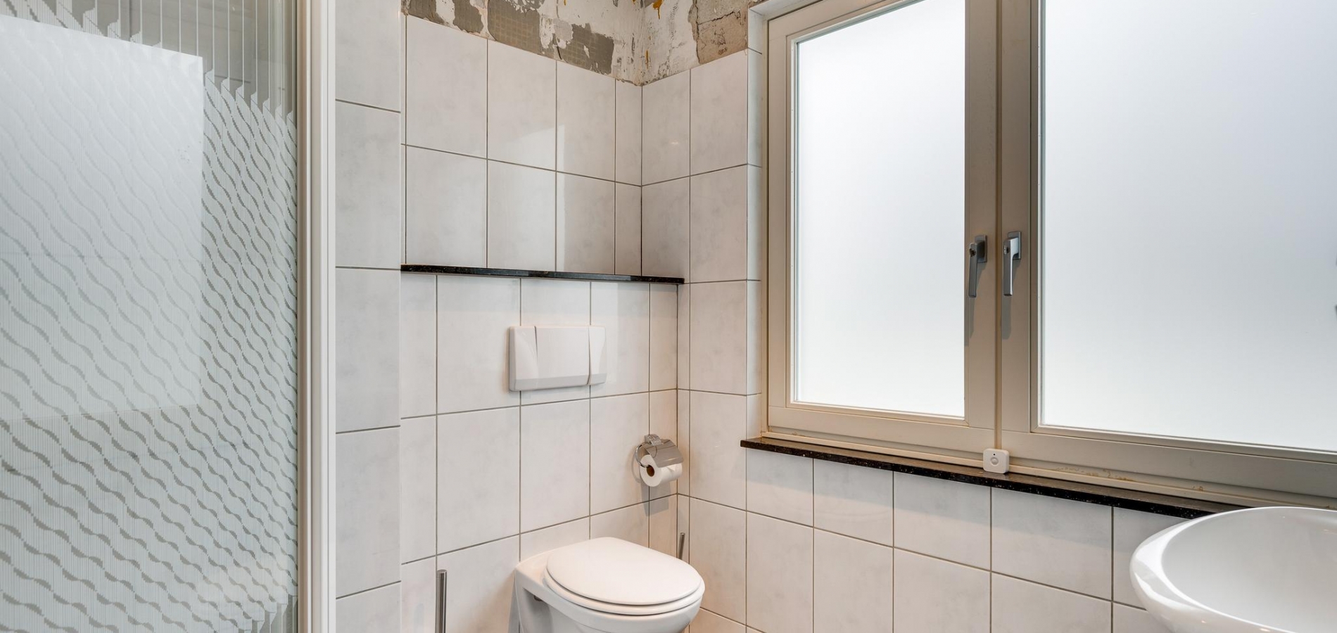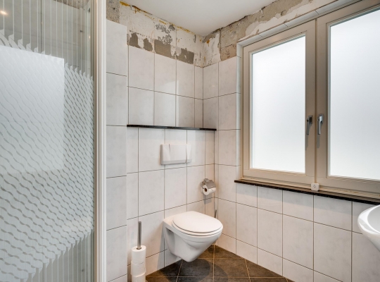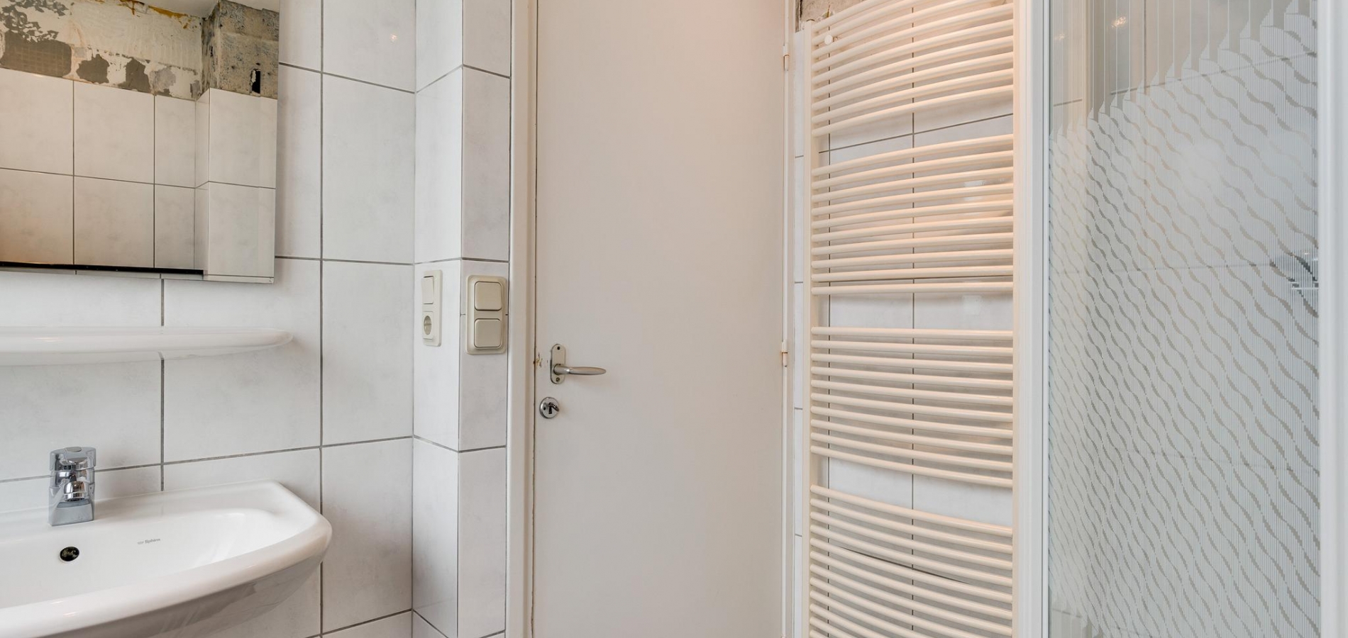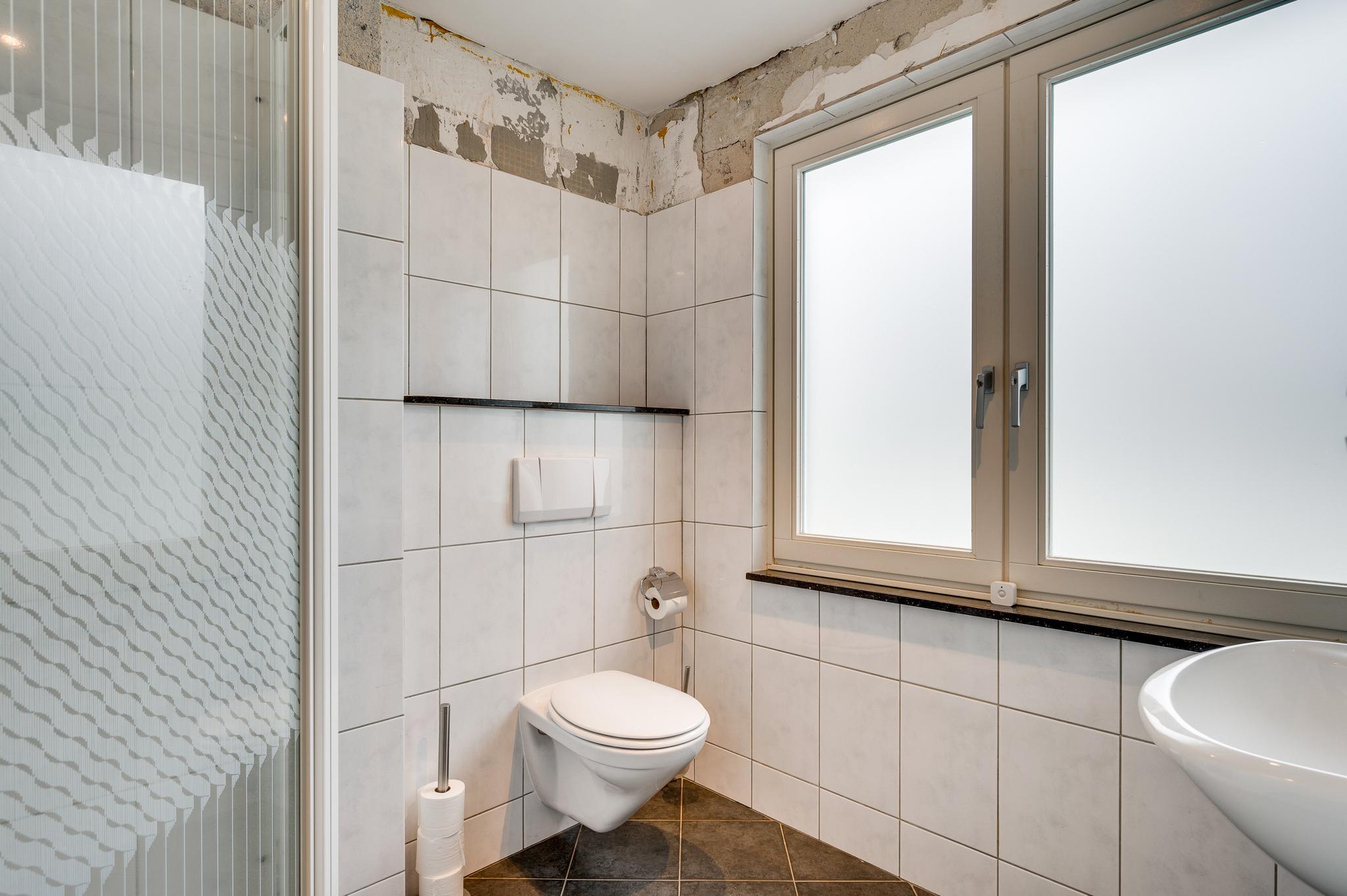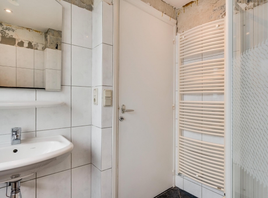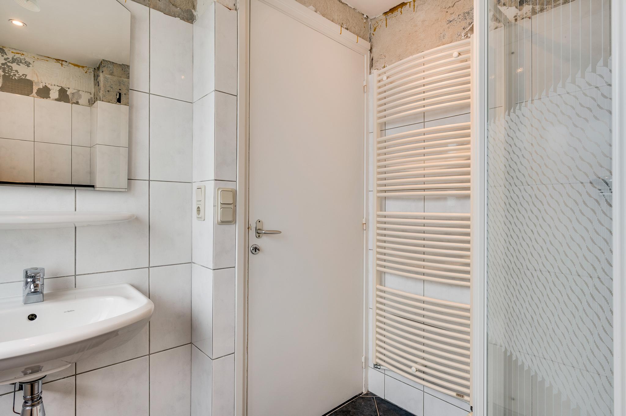 De badkamer (circa 2,14/1,90 x 2,17) met een douche, wandcloset, handdoekenradiator en een wastafel verdient enige aandacht. Het bovenste deel van de wandtegels is verwijderd vanwege het plaatsen van het nieuwe plafond.