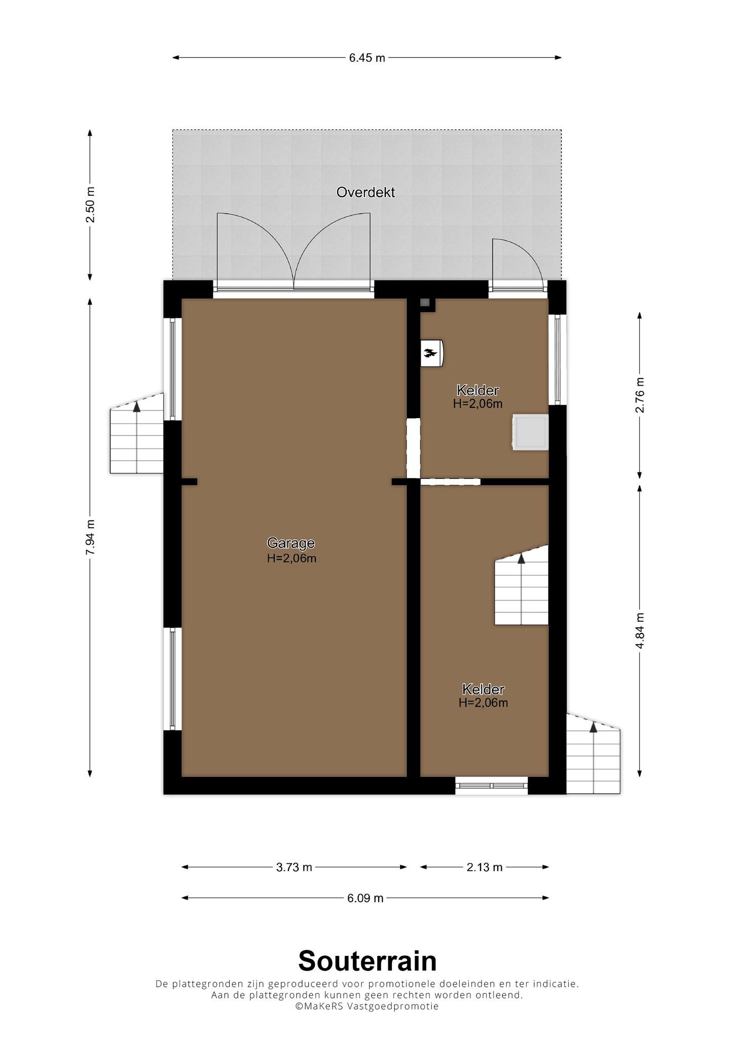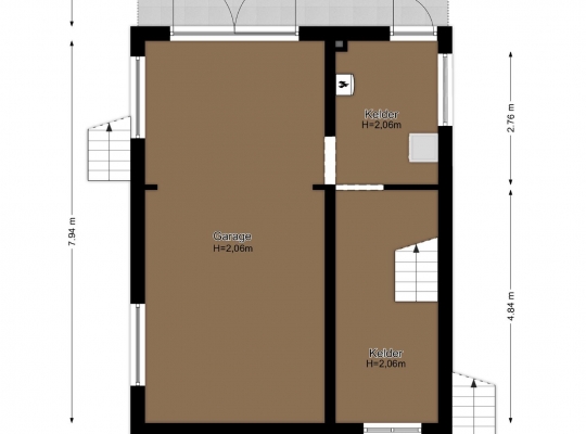 Het grote souterrain van circa 48 m2 heeft een goede stahoogte en is, conform de NEN-richtlijnen, aangemerkt als overige inpandige ruimte. De garage (circa 7,94 x 3,73) is met de auto, fiets en andere voertuigen vanaf de achterzijde toegankelijk. Kelder I (circa 4,84 x 2,13) heeft een trap naar de begane grond en kelder II (circa 2,99 x 2,13) is ook van buitenaf bereikbaar. In kelder II is de opstelling van de wasapparatuur en de HR-ketel (Remeha Avanta, 2018, eigendom). Het hele souterrain is voorzien van een mooie tegelvloer, gestucte muren en een stucplafond.