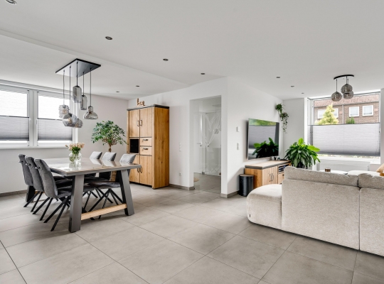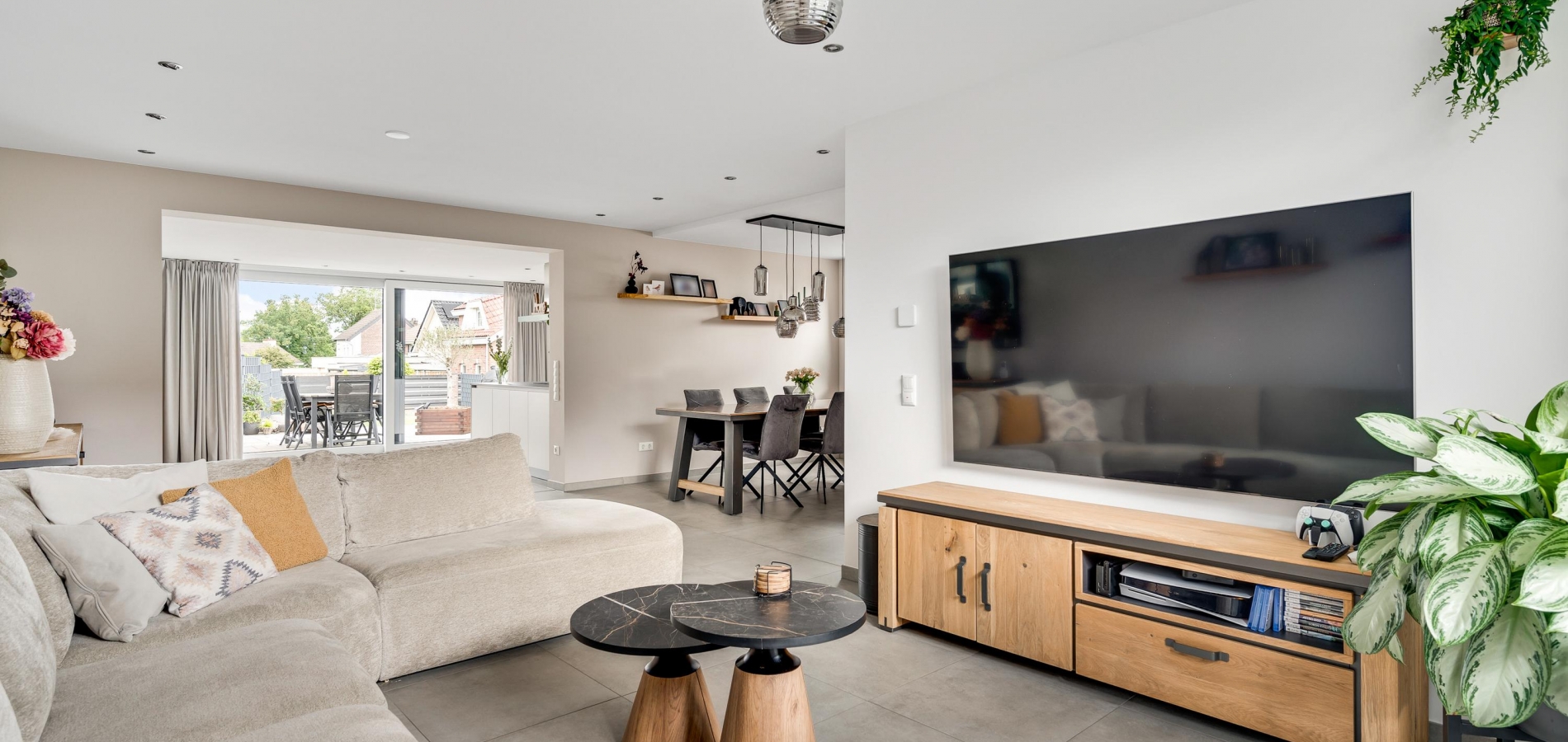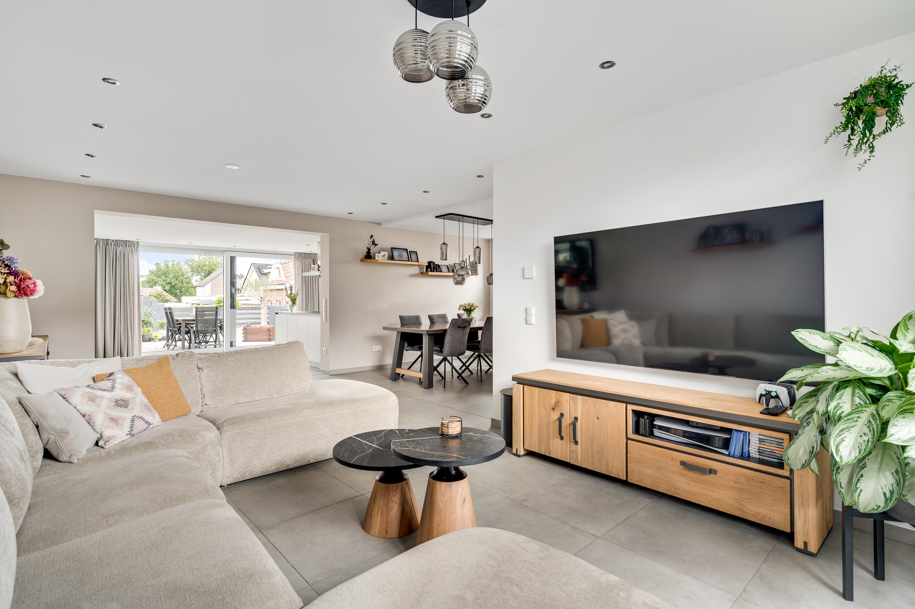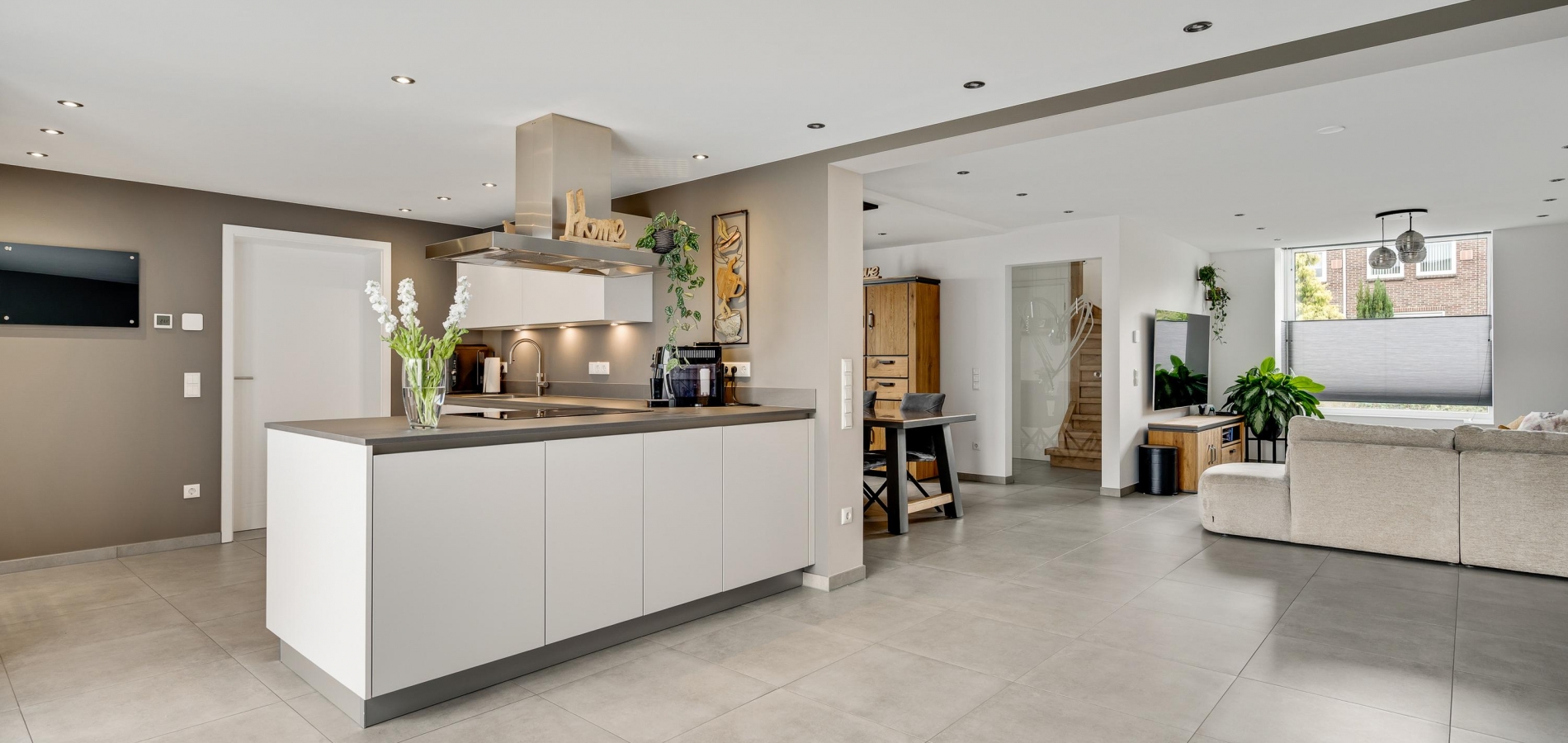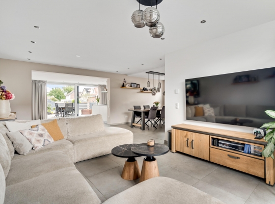 De L-vormige woonkamer, met een erker bij het zitgedeelte, heeft een oppervlakte van circa 37 m2. Er is niet alleen plek voor een grote hoekbank en een tv-meubel, maar ook voor een 6-persoons eettafel en een servieskast in deze fantastische leefruimte.
