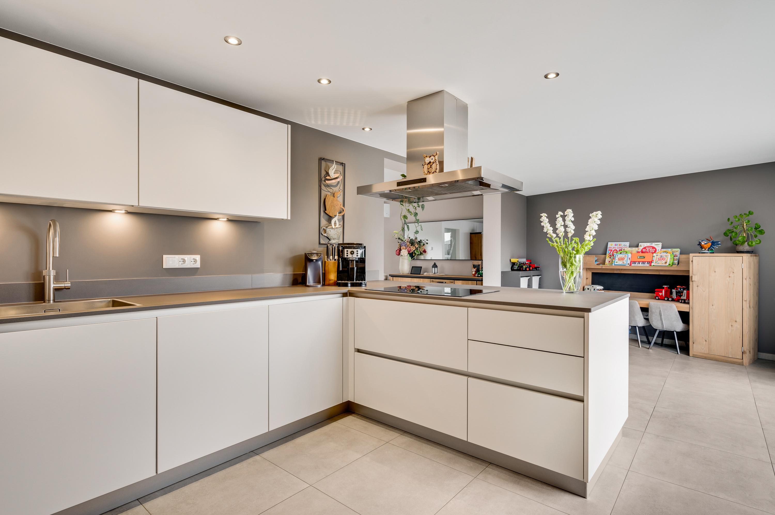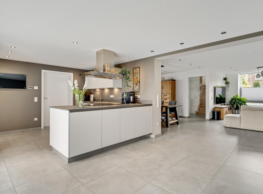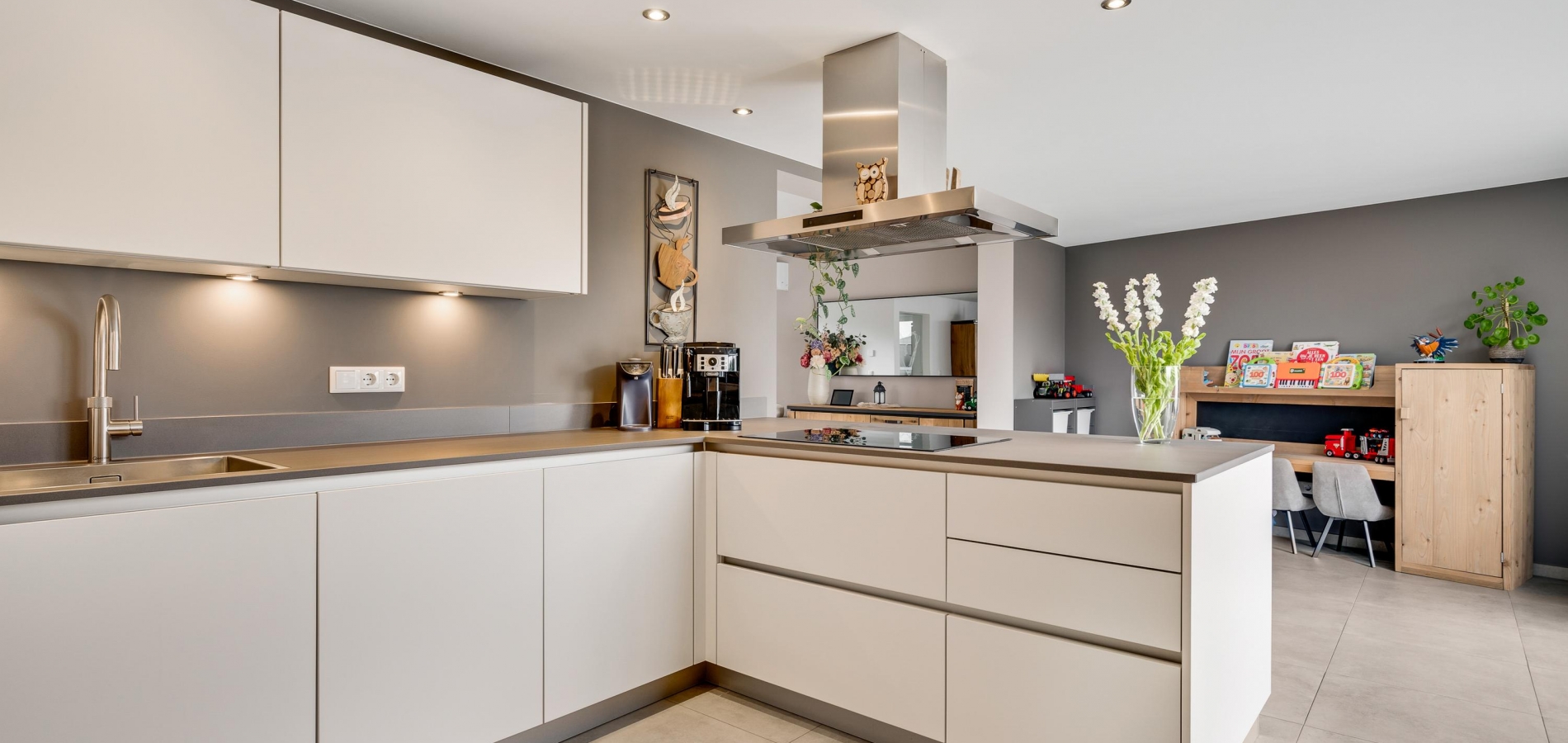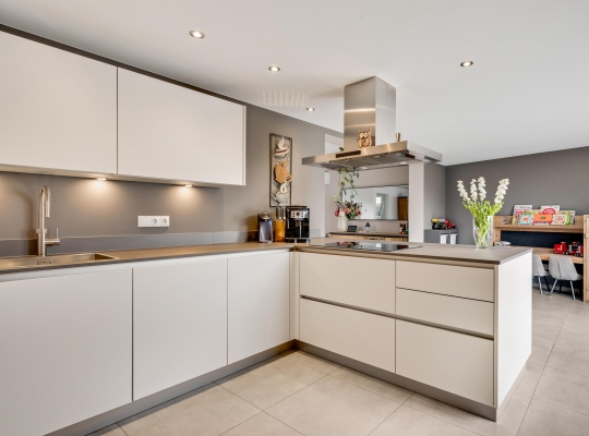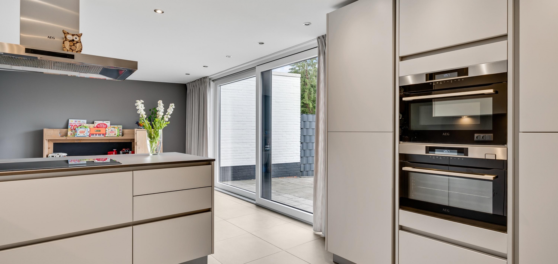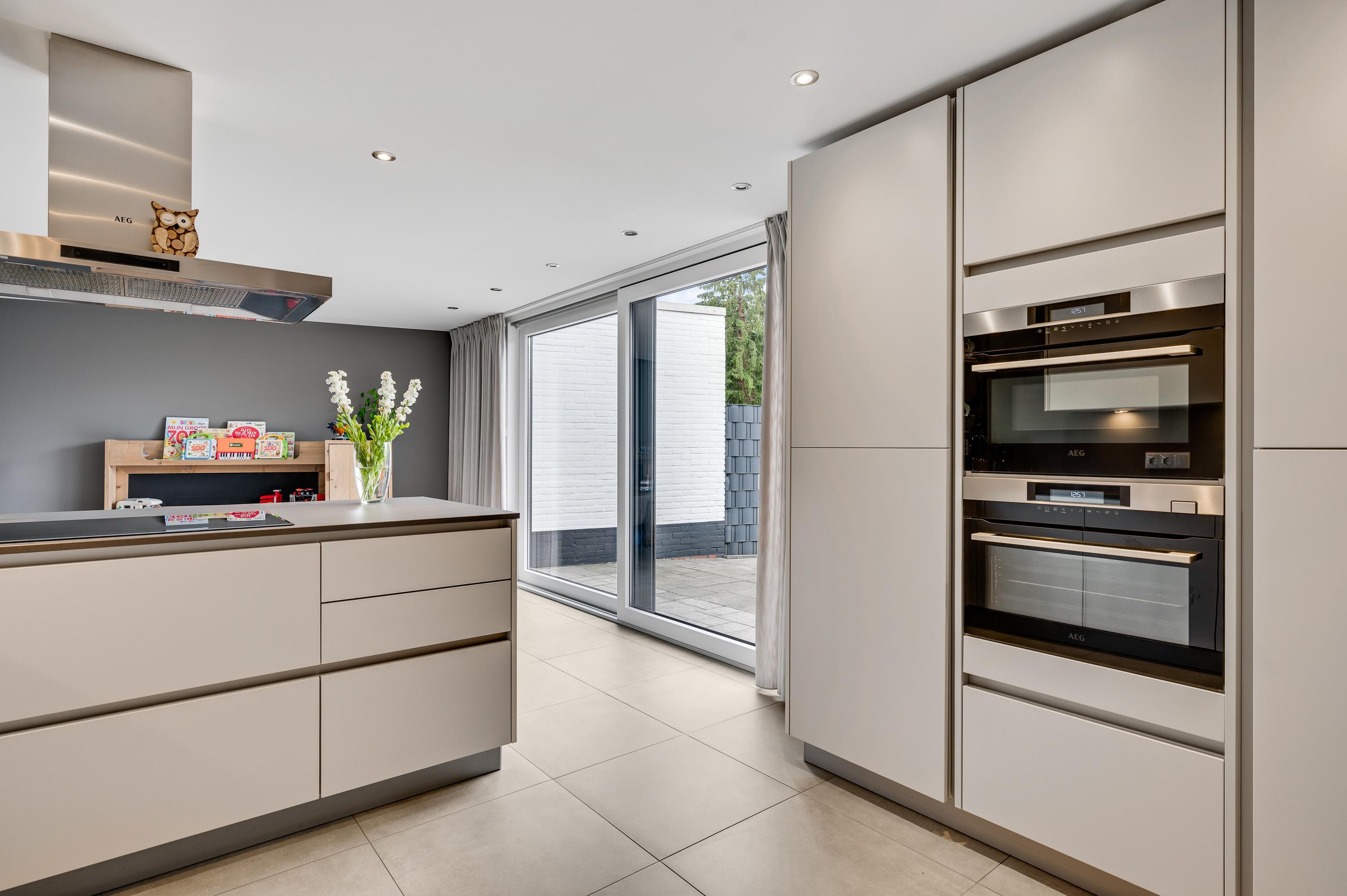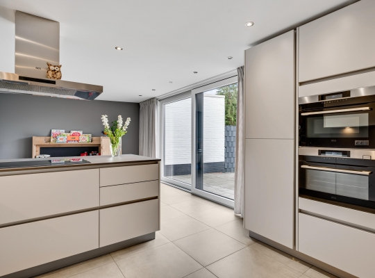 Een brede doorgang verbindt de woonkamer met de leefkeuken van circa 25 m2, met een grote schuifpui naar het terras en de tuin. De moderne, lichte keuken met een hoekopstelling en een kastenwand heeft een fraaie uitstraling, mede dankzij het composiet aanrechtblad en de plint in dezelfde kleur. Alle apparatuur voor de kook- en bakliefhebber is ingebouwd: een inductie kookplaat, afzuigkap, koelkast, vriezer, stoomoven, combimagnetron en een vaatwasser.