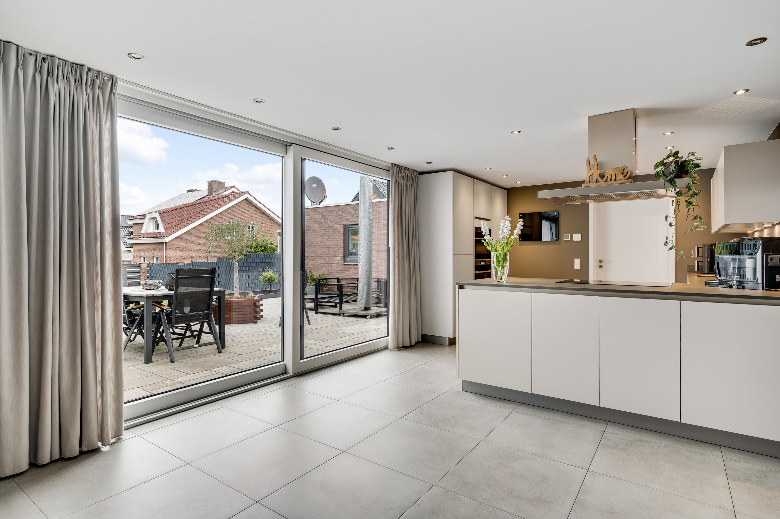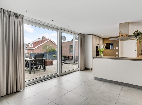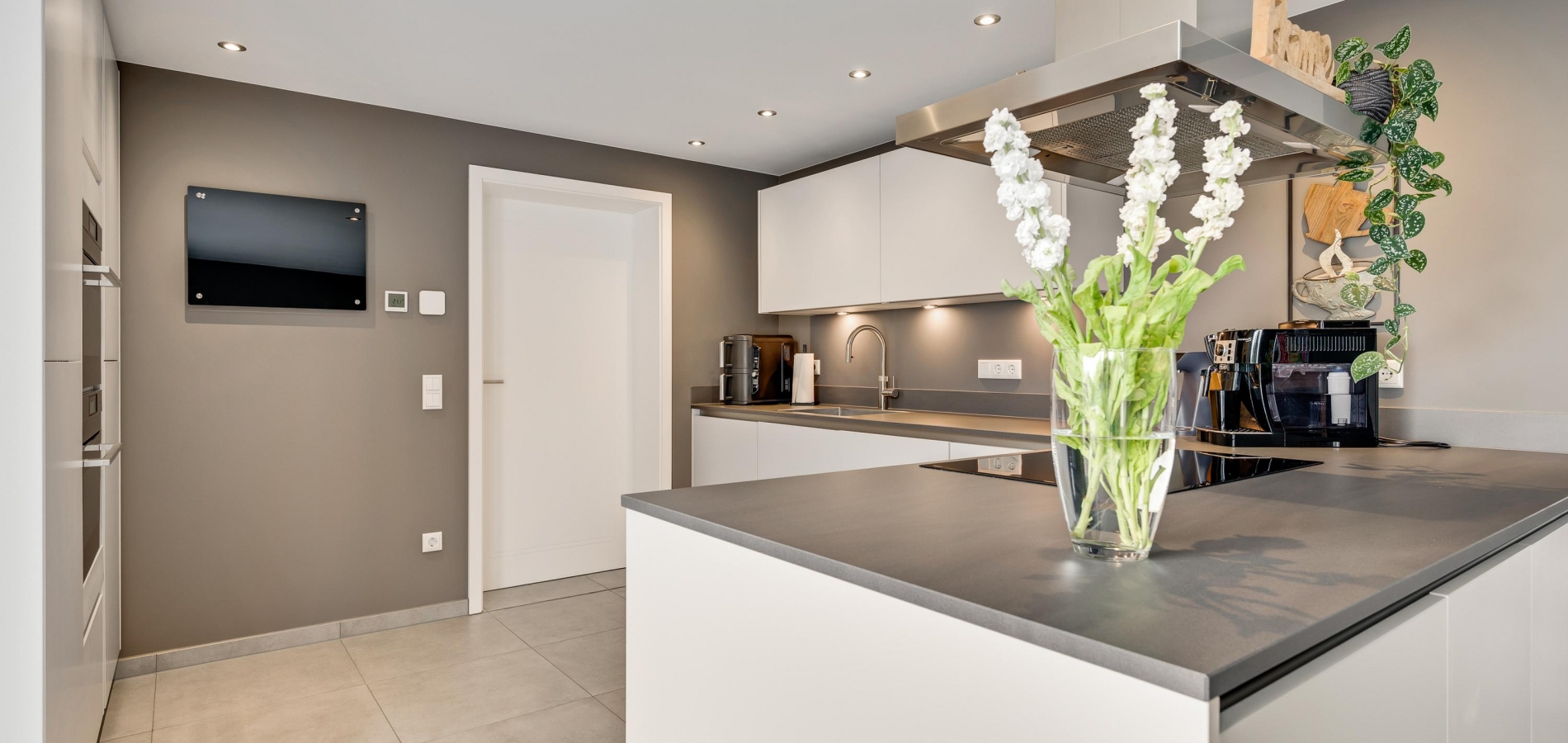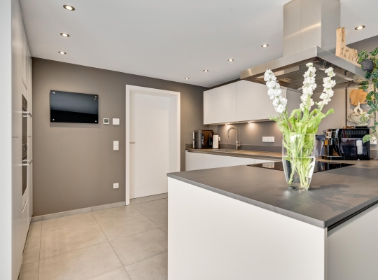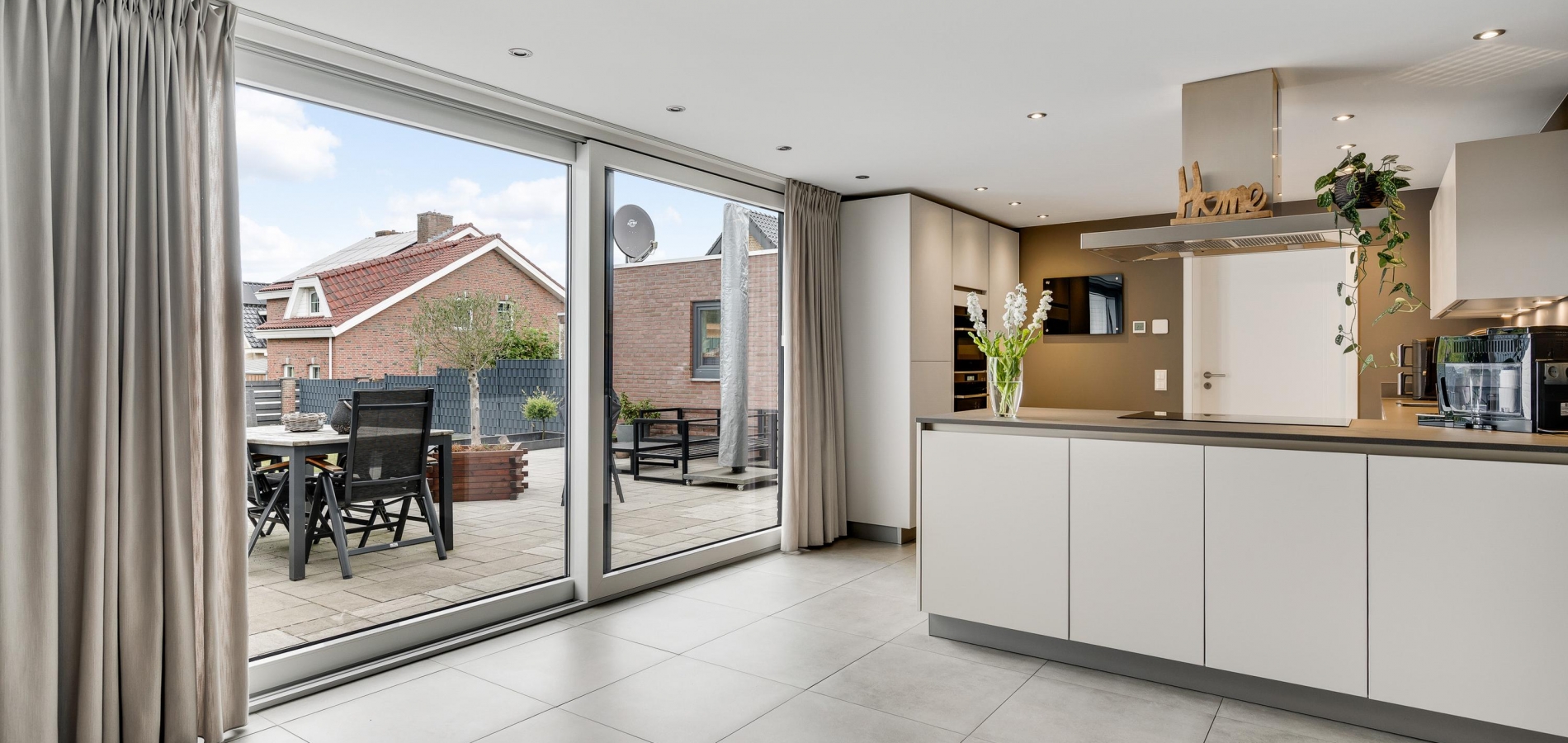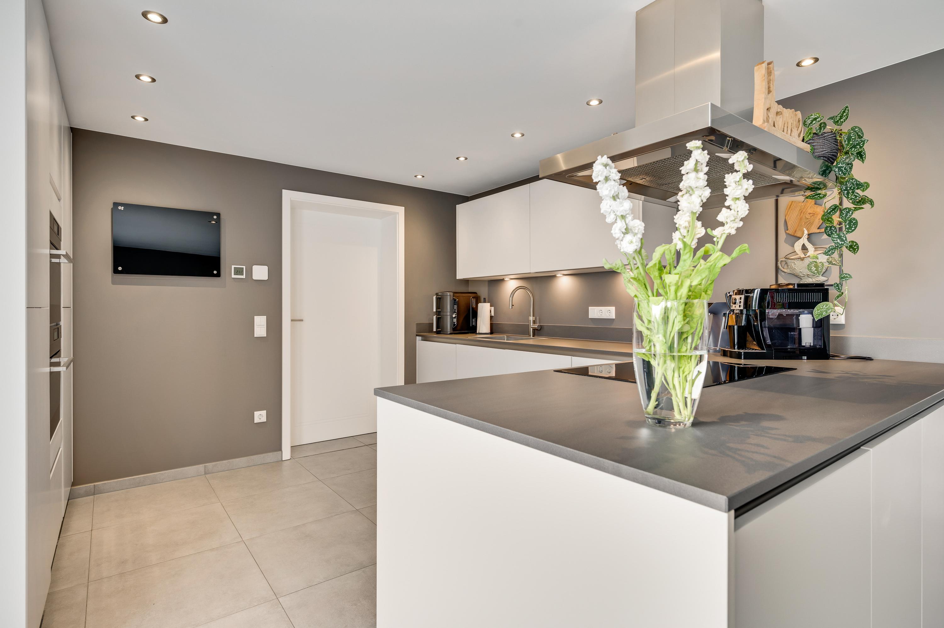 Een brede doorgang verbindt de woonkamer met de leefkeuken van circa 25 m2, met een grote schuifpui naar het terras en de tuin. De moderne, lichte keuken met een hoekopstelling en een kastenwand heeft een fraaie uitstraling, mede dankzij het composiet aanrechtblad en de plint in dezelfde kleur. Alle apparatuur voor de kook- en bakliefhebber is ingebouwd: een inductie kookplaat, afzuigkap, koelkast, vriezer, stoomoven, combimagnetron en een vaatwasser.