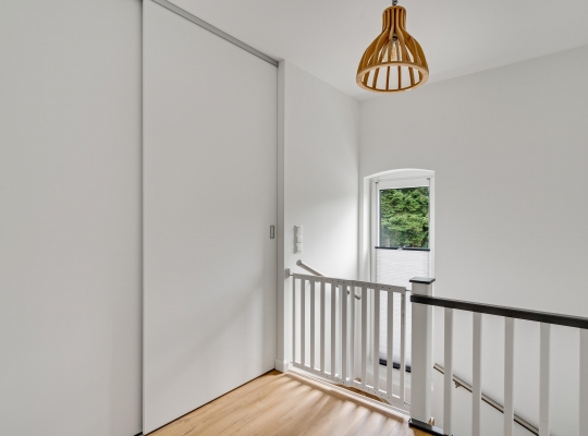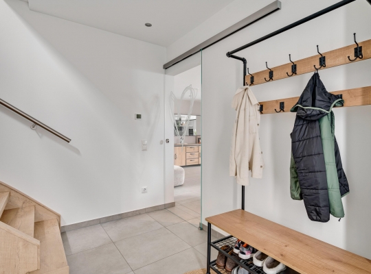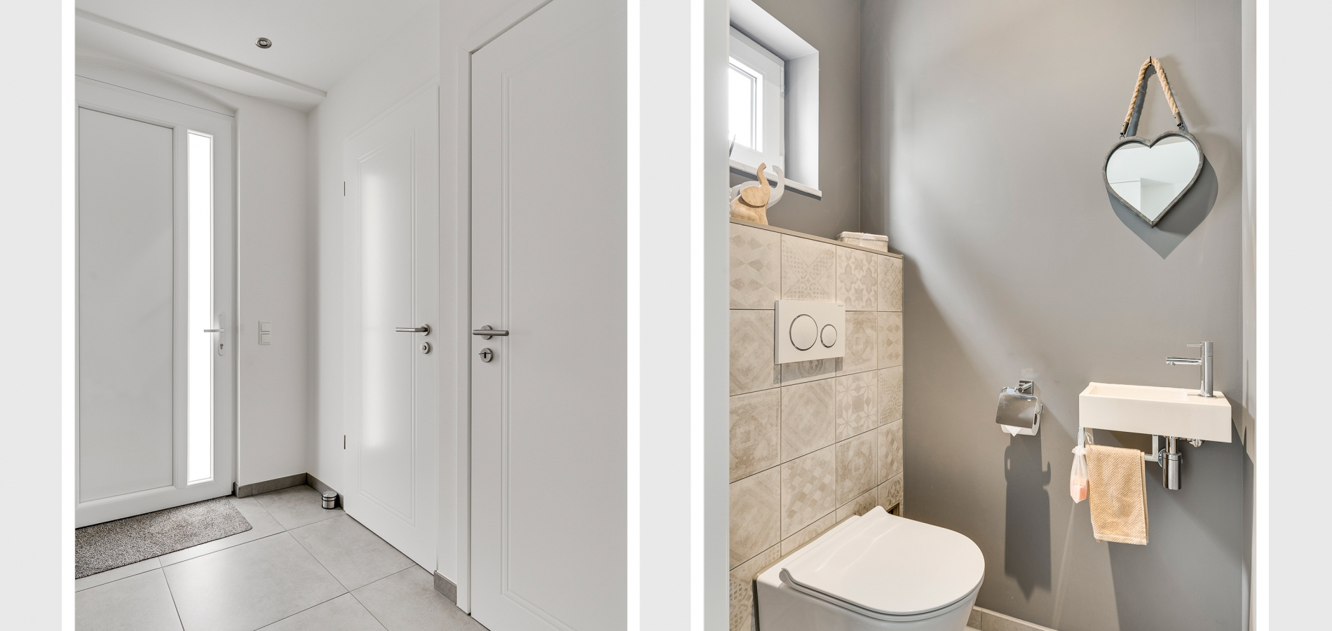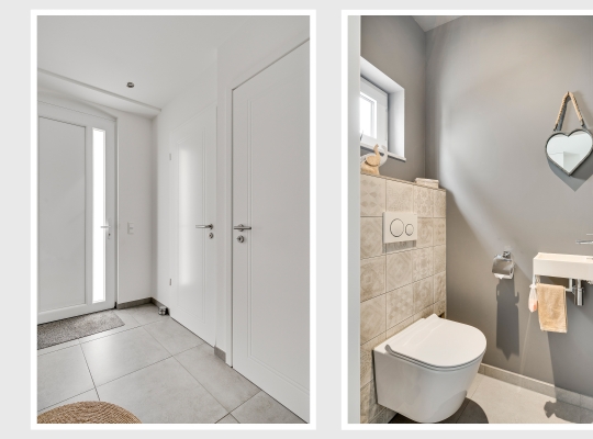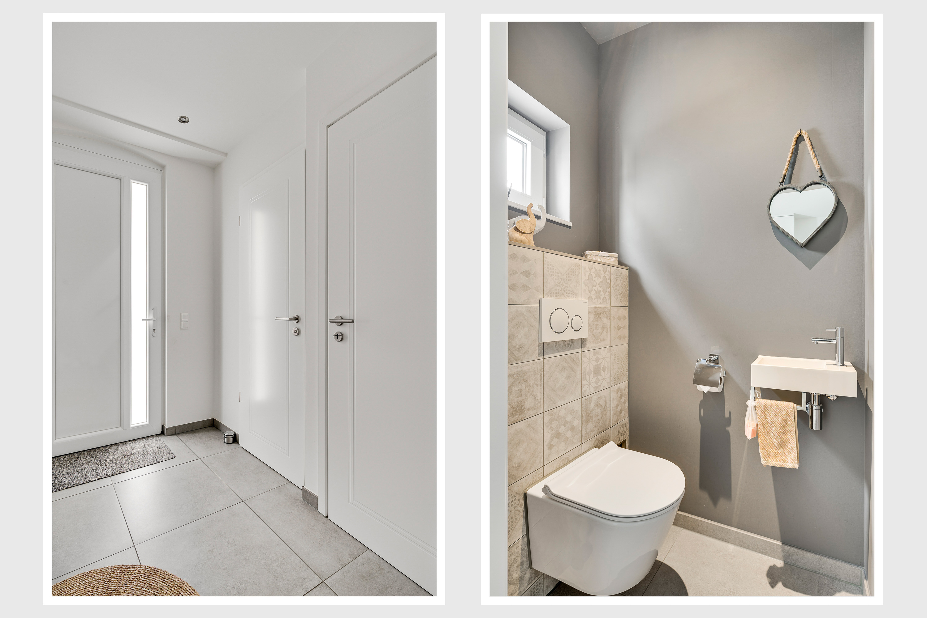In de ruime ontvangsthal zijn de meterkast, toiletruimte, de prachtige trap naar de eerste verdieping en hier is een trap naar de (wijn)kelder van circa 2,89 x 1,98 meter. De hal is, net als de rest van de woning, in 2019 smaakvol verbouwd. Onder de tegelvloer ligt vloerverwarming en de glazen schuifdeur naar de woonkamer maakt de hal heel ruimtelijk.