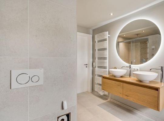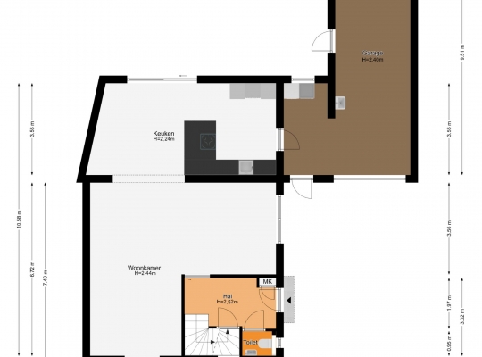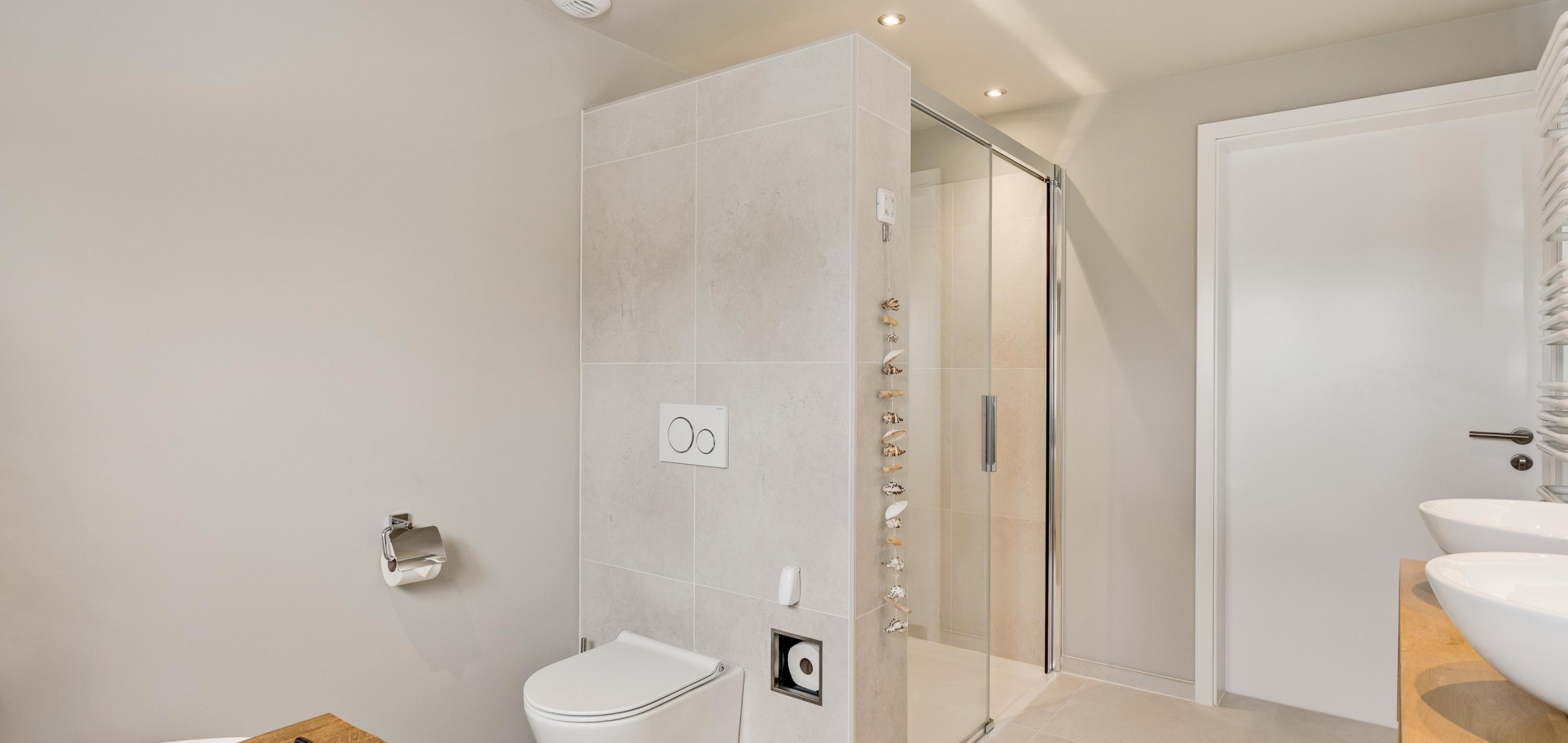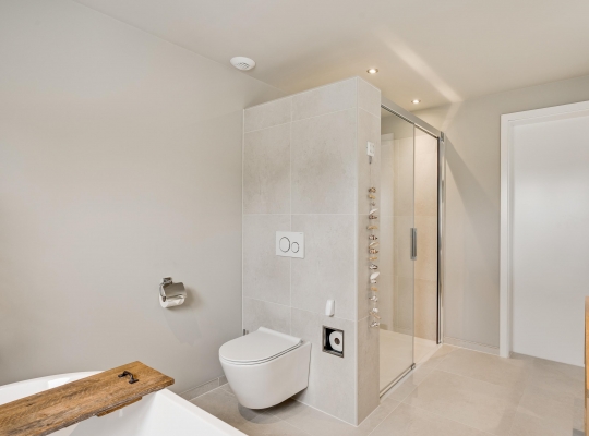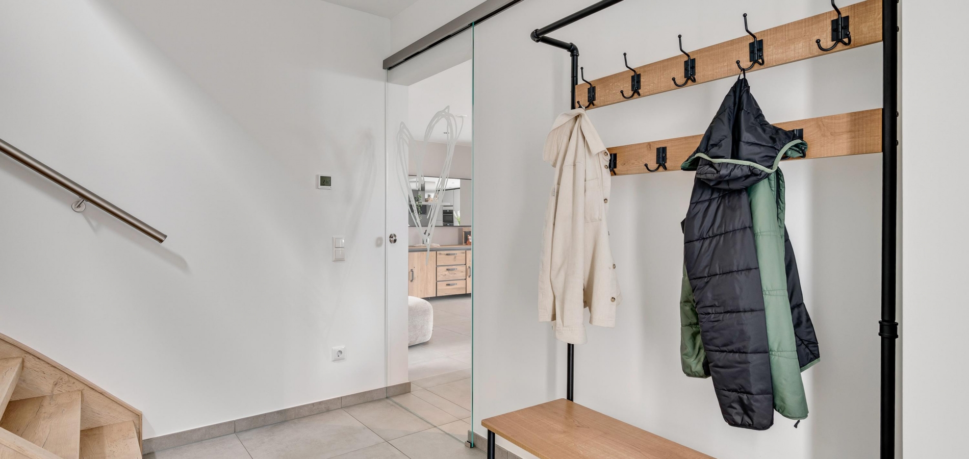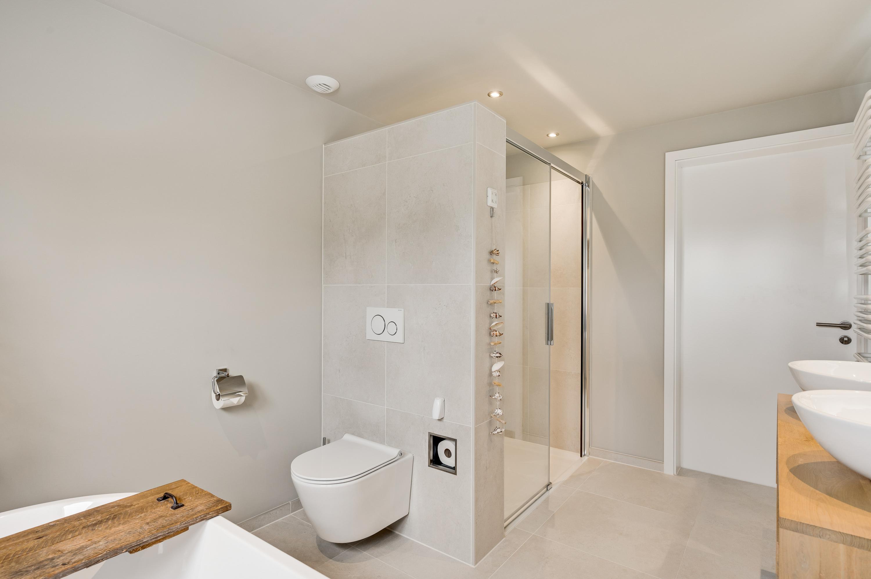 In de ruime ontvangsthal zijn de meterkast, toiletruimte, de prachtige trap naar de eerste verdieping en hier is een trap naar de (wijn)kelder van circa 2,89 x 1,98 meter. De hal is, net als de rest van de woning, in 2019 smaakvol verbouwd. Onder de tegelvloer ligt vloerverwarming en de glazen schuifdeur naar de woonkamer maakt de hal heel ruimtelijk.