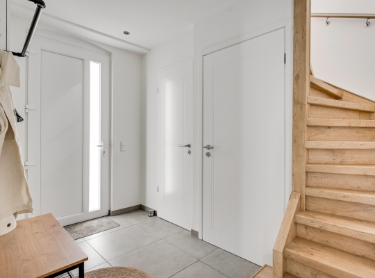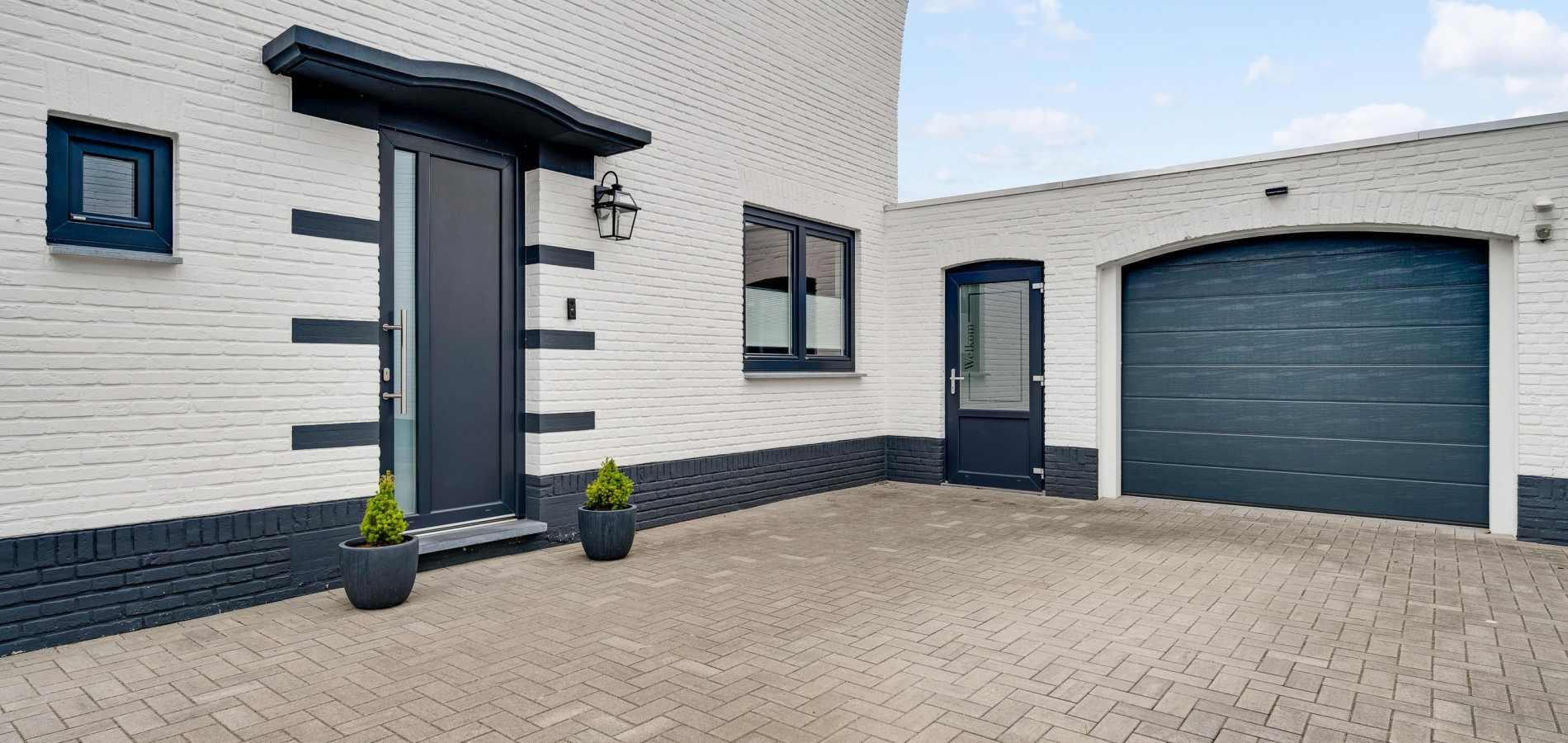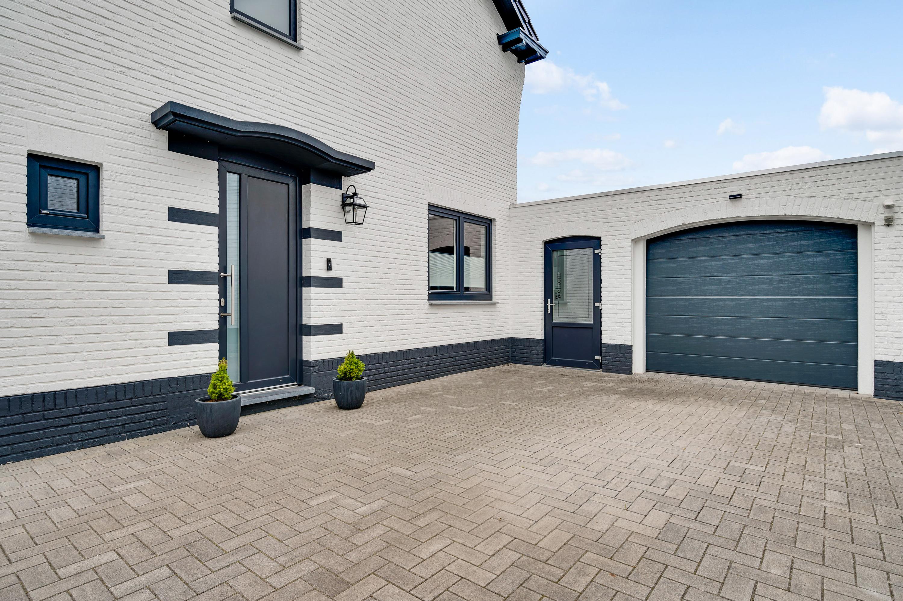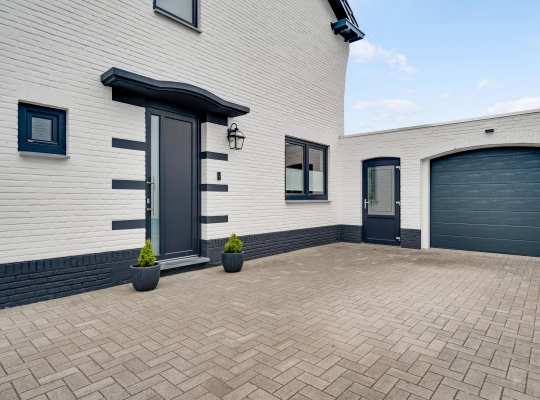 Aan de rechterzijde, bij de oprit voor meerdere auto’s, ziet u de garagepoort, een deur naar de bijkeuken en de fraaie entree. De bewoners, vrienden en familie komen gaan via de bijkeuken naar binnen, maar we gaan via de officiële entree.