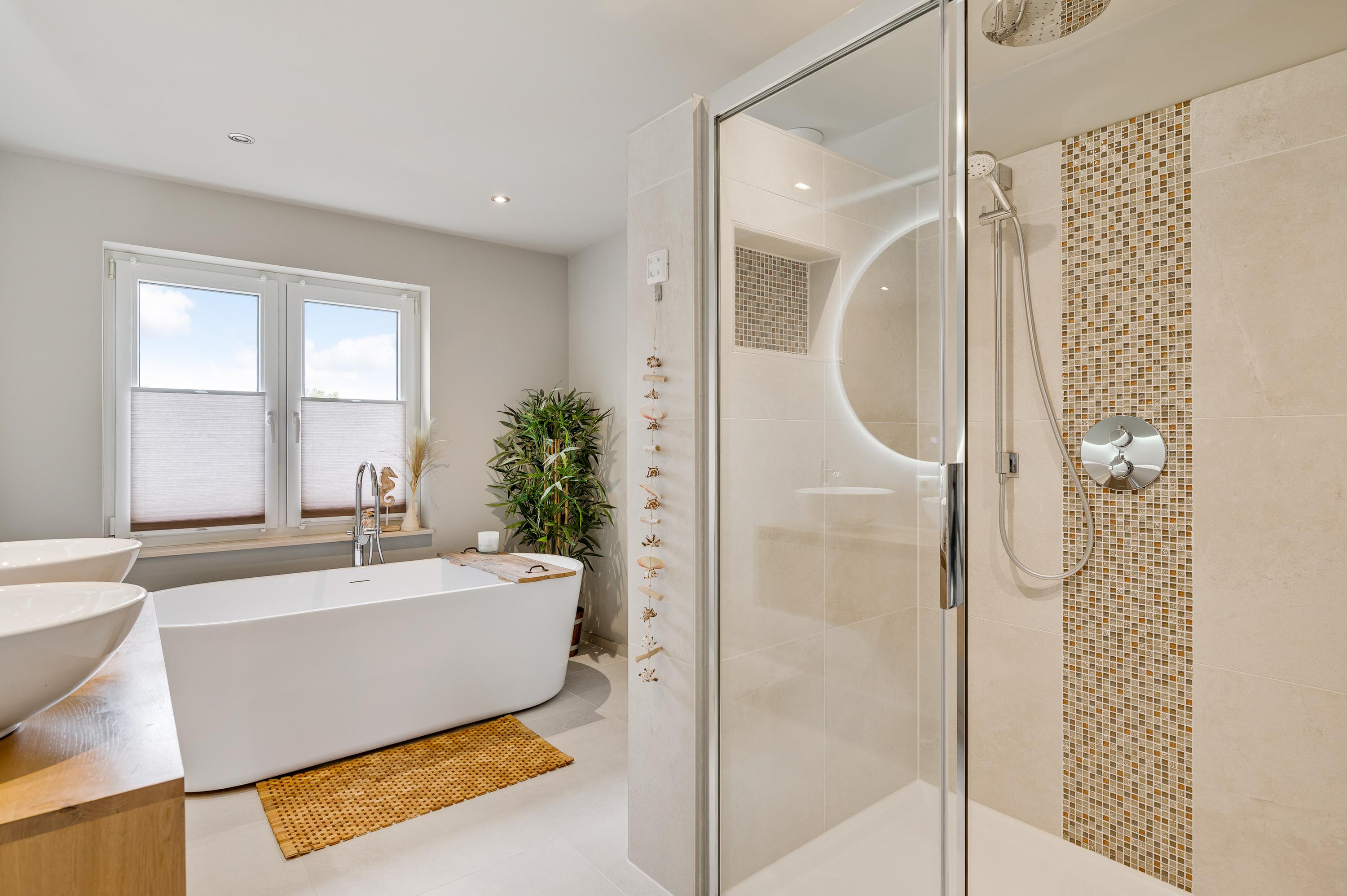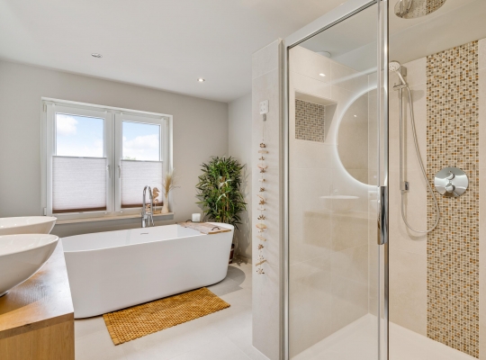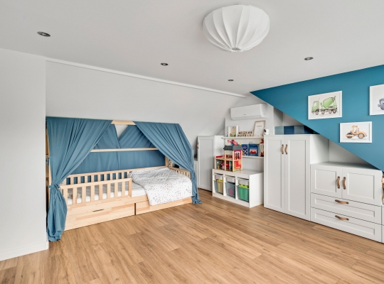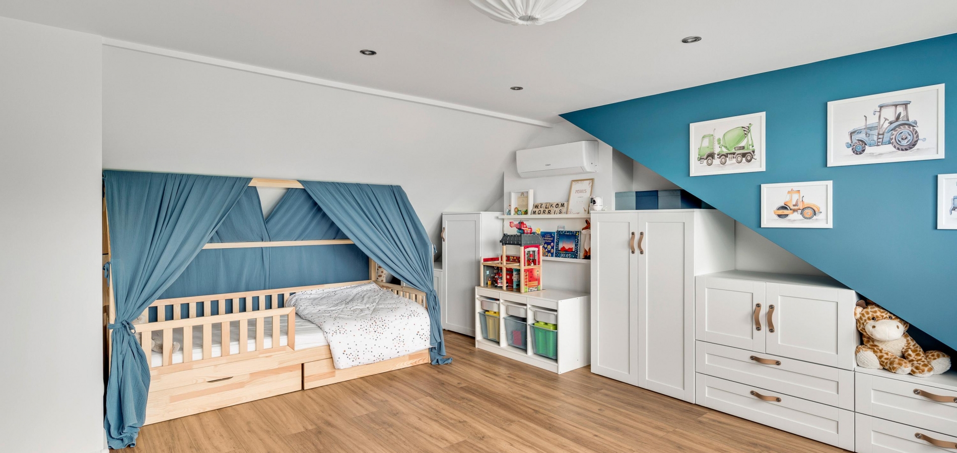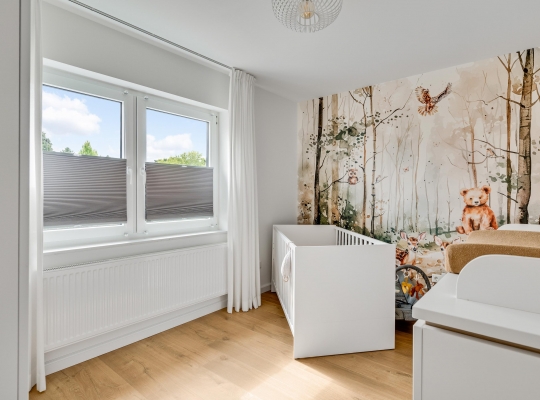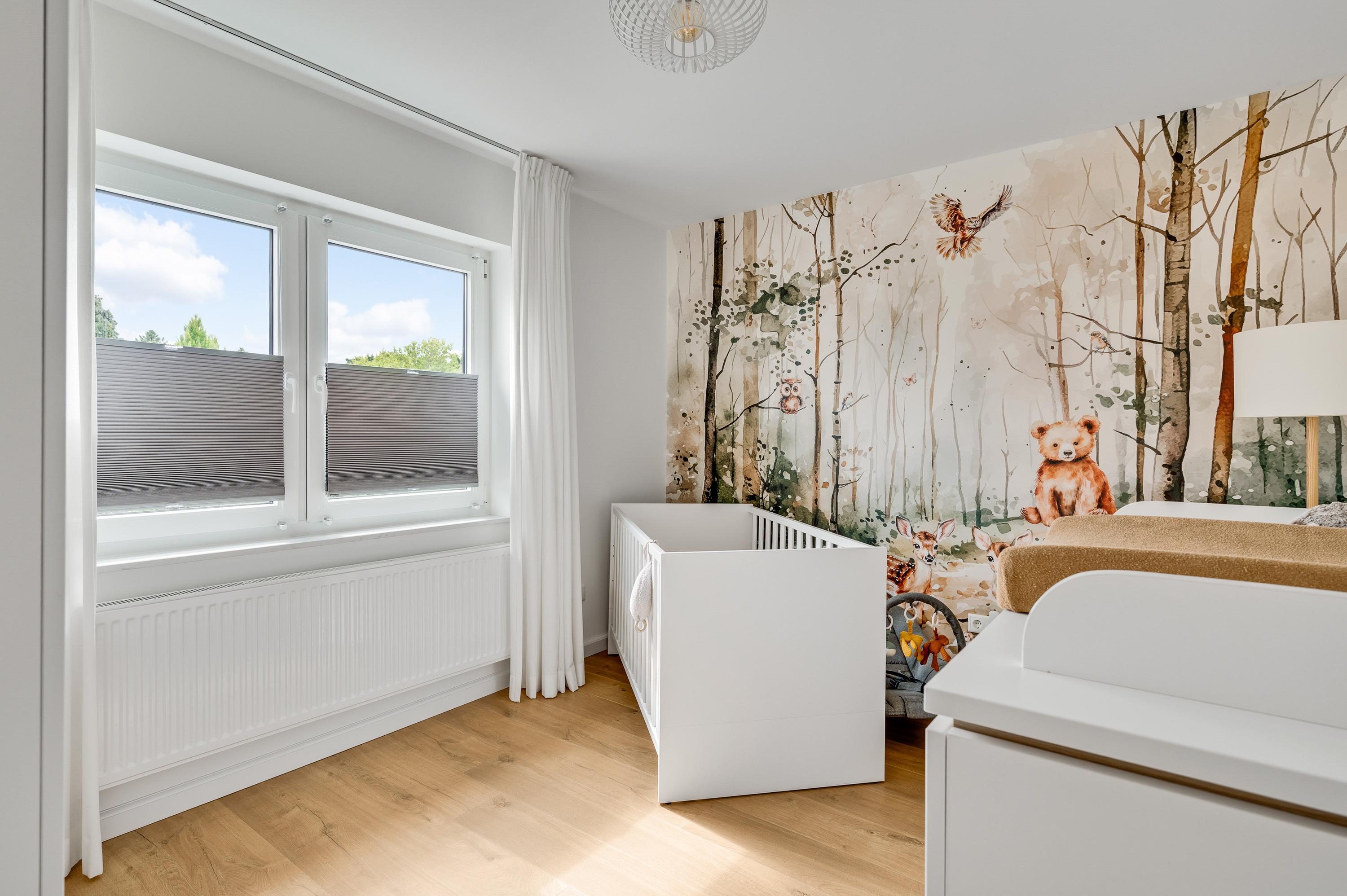 Slaapkamer I (circa 3,55 x 2,95), ingericht als kinderkamer, is aan de voorzijde. Aan de achterzijde is slaapkamer II (circa 4,59 x 3,64). De badkamer (circa 3,59 x 2,48) is het toppunt van luxe, met een vrijstaand bad en een inloopdouche. Verder zijn er een tweede toilet en een houten badmeubel, waarop twee waskommen staan. Aan alles is gedacht: van een kastje voor de toiletrollen tot een handdoekenradiator.