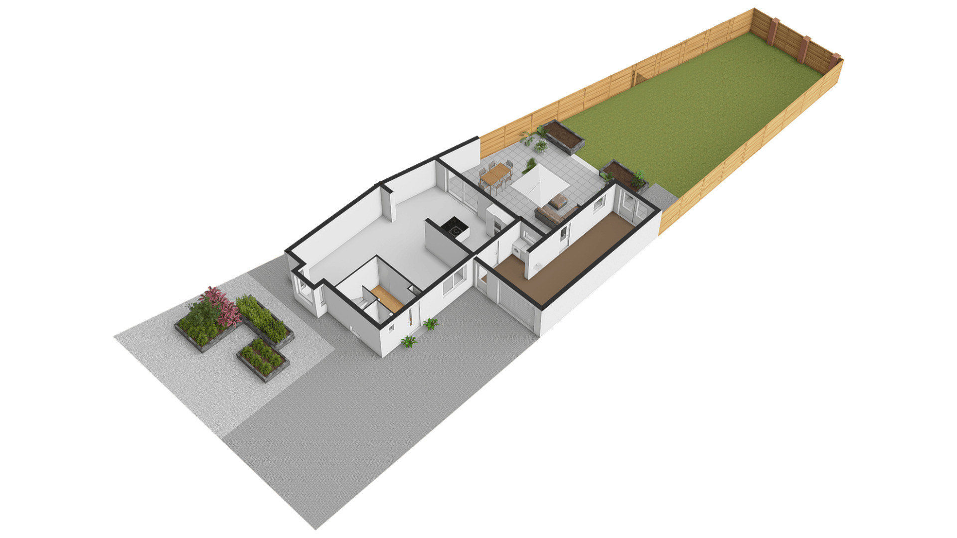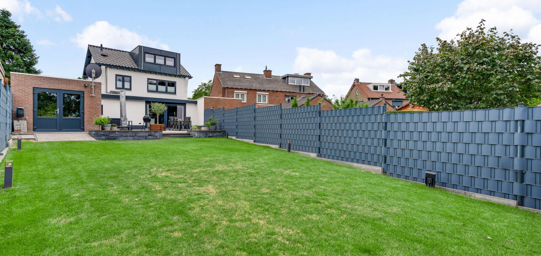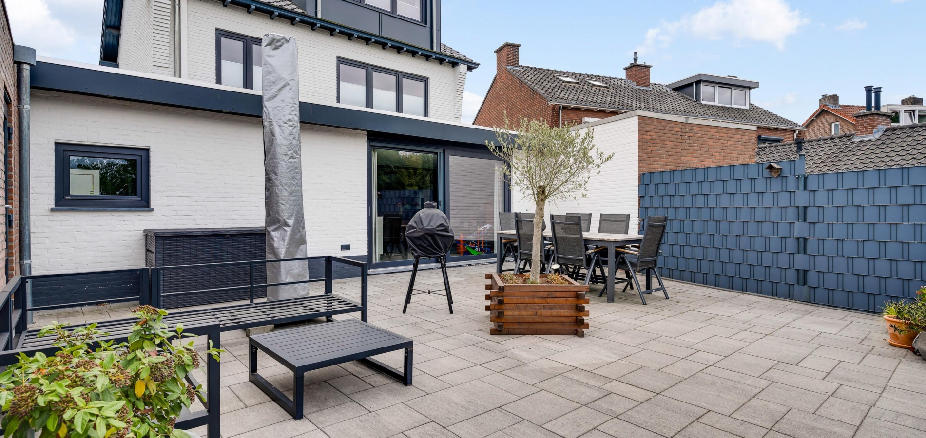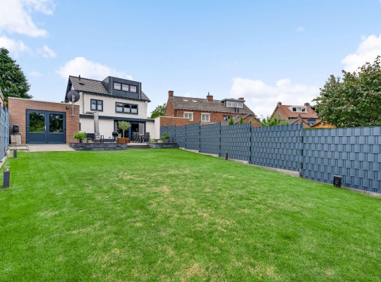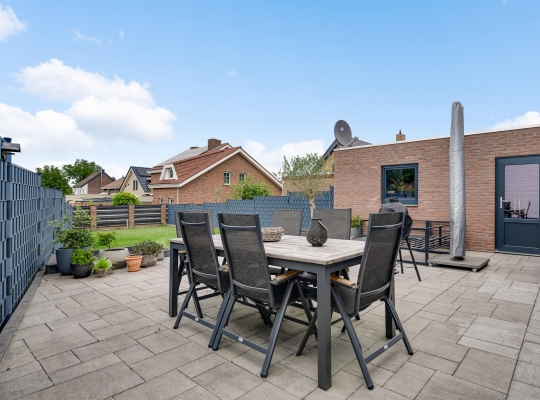 Deze fantastische woning heeft niet zomaar een achtertuin, maar een hele diepe tuin met een groot terras waar genoeg plek is voor een loungeset en een tafel met stoelen. Het achterste deel van de tuin is ingericht met een gazon, en de erfafscheiding aan drie zijden zorgt voor veel privacy. Ook de voortuin is opnieuw aangelegd, met onderhoudsvriendelijke beplanting en grind.