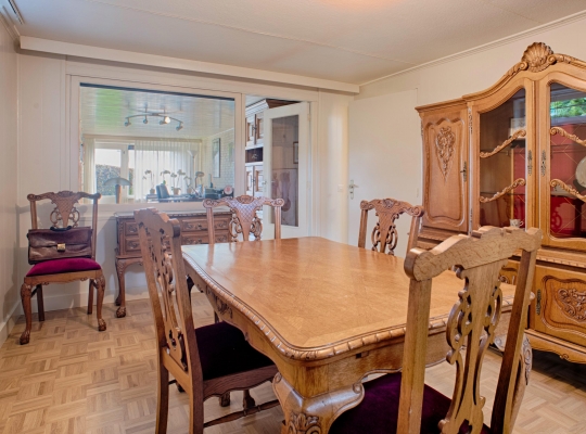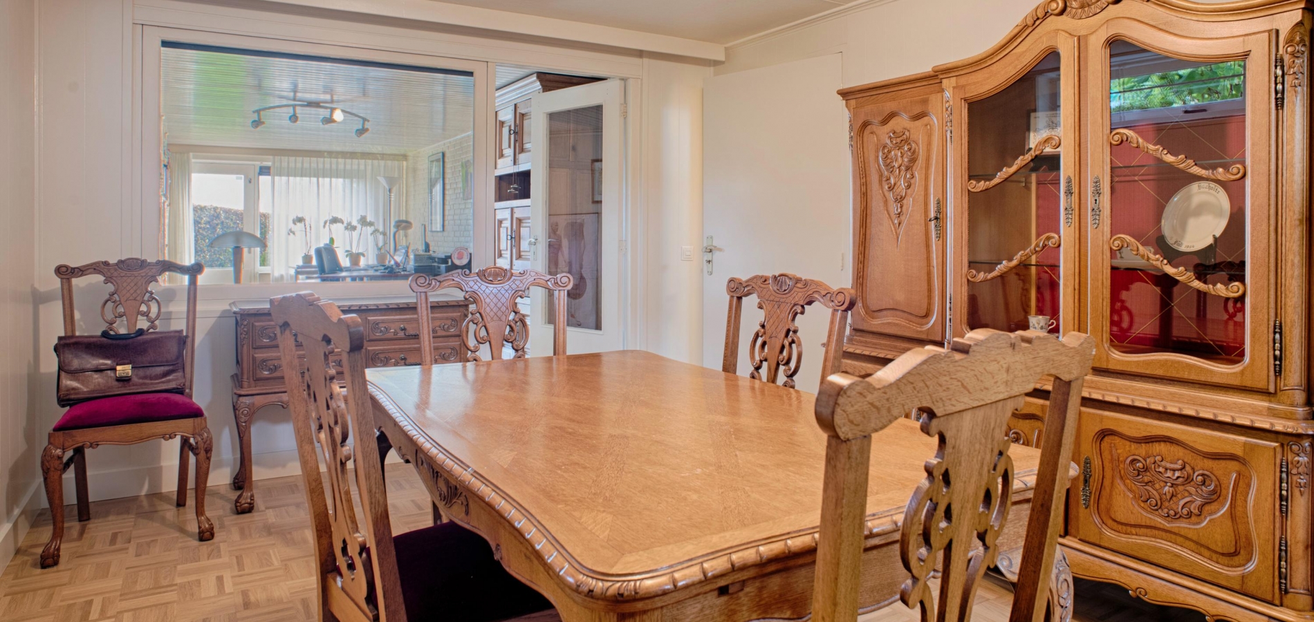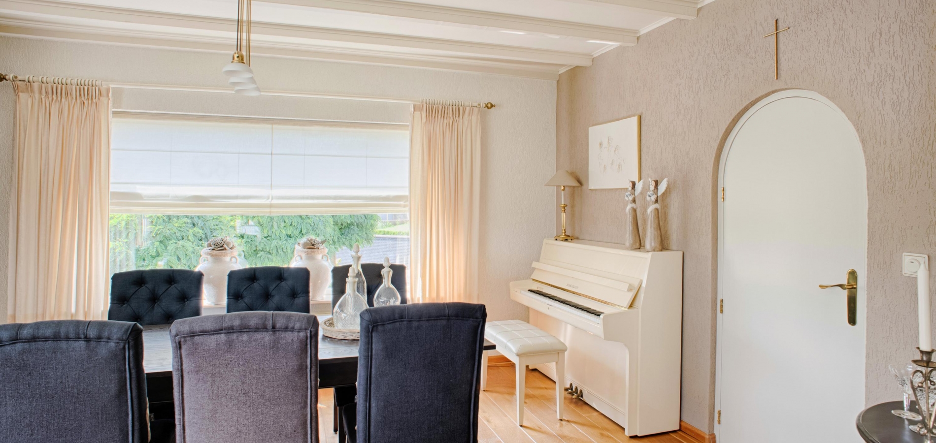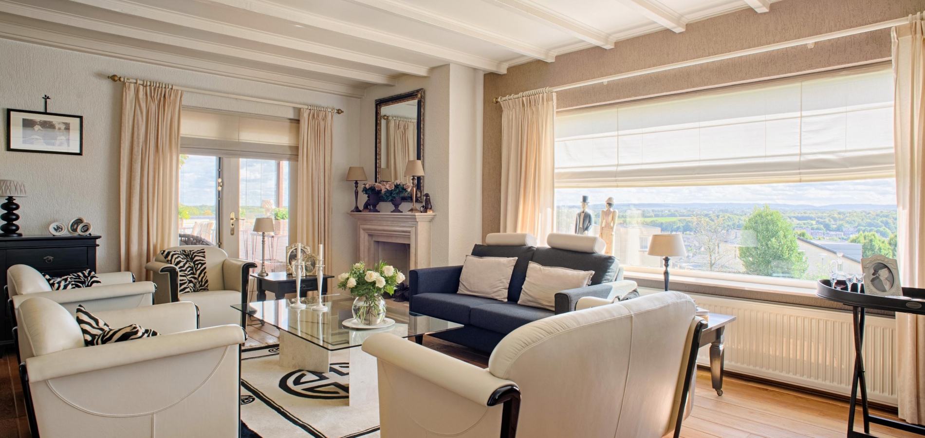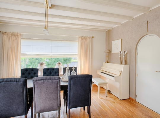 De L-vormige woon-/eetkamer (circa 48 m2) is een stijlvolle leefruimte met een parketvloer en een licht balkenplafond. Uw oog valt op de haard bij het zitgedeelte, maar het allermooiste is het panoramische uitzicht over Simpelveld, het Platte Bos en zelfs tot in Duitsland. Vanuit de woonkamer is er toegang tot én zicht op de wintertuin, waardoor deze een natuurlijk verlengstuk vormt van de leefruimte.