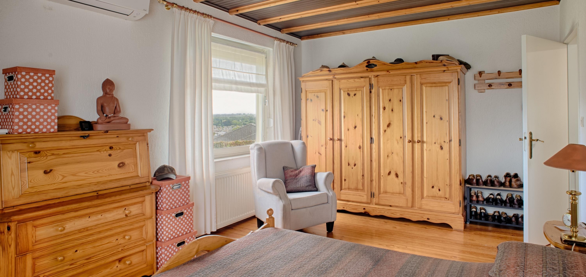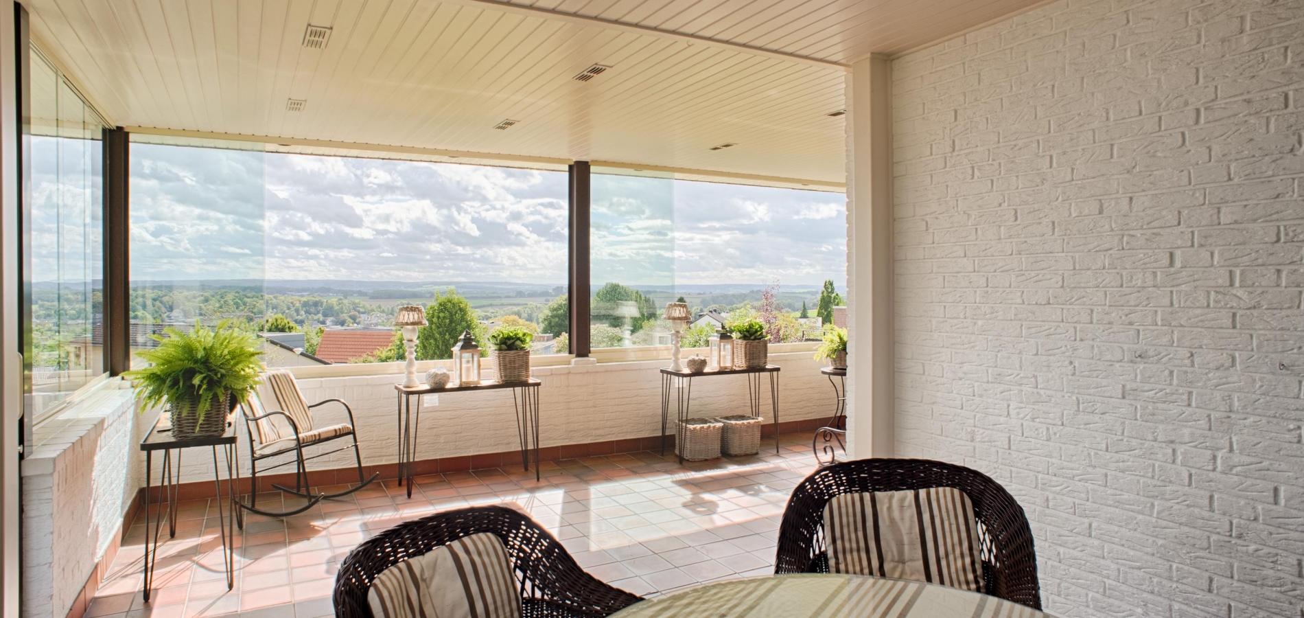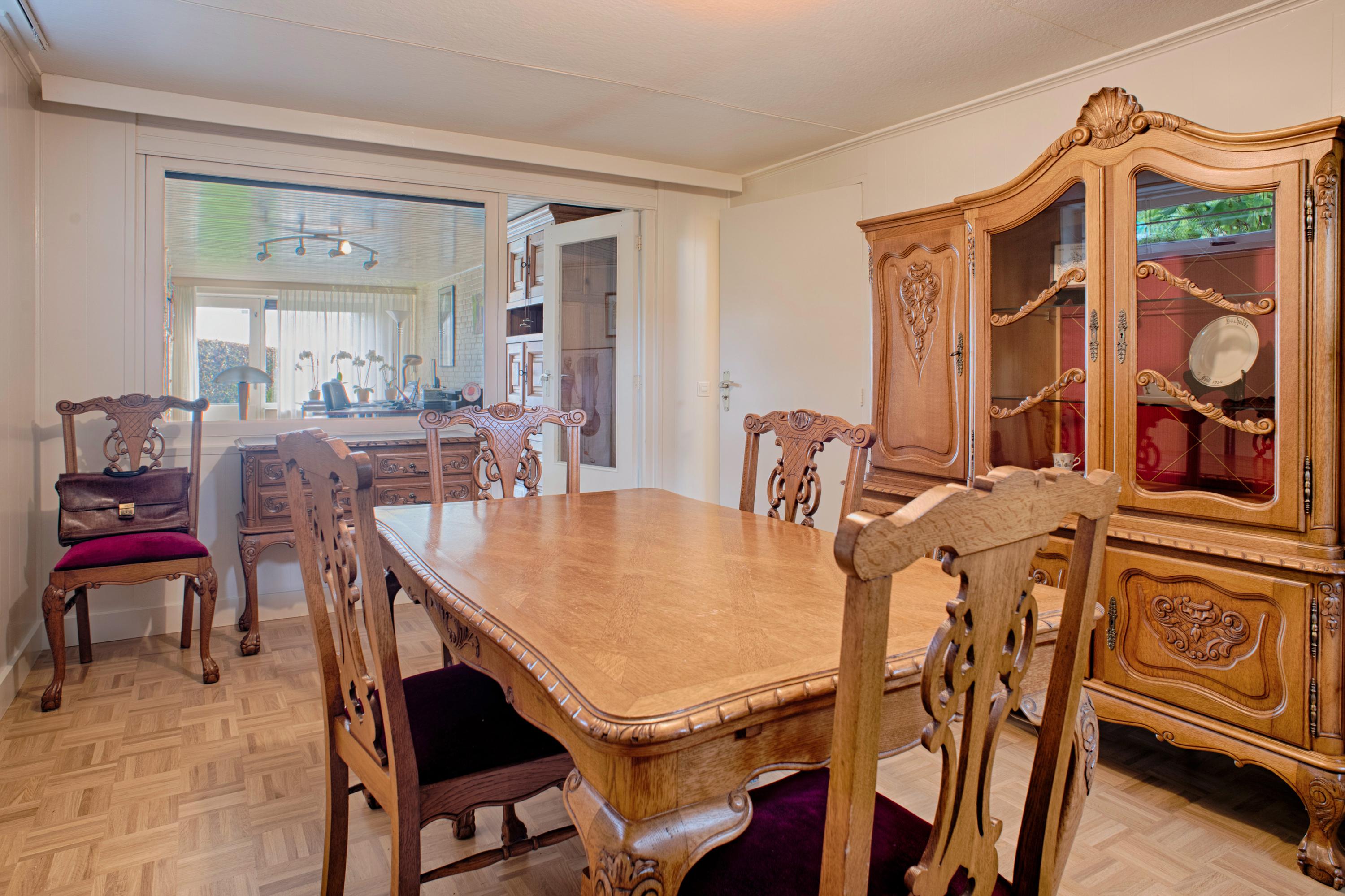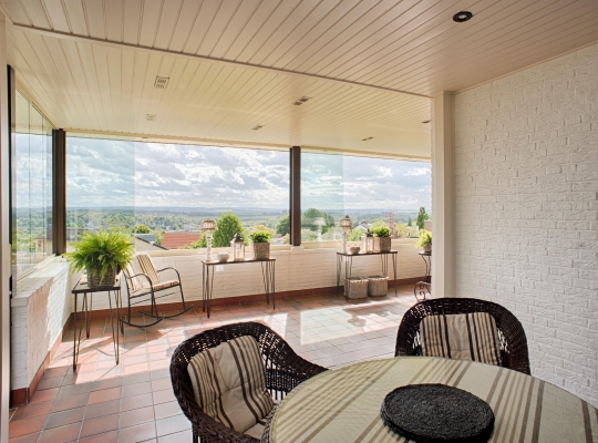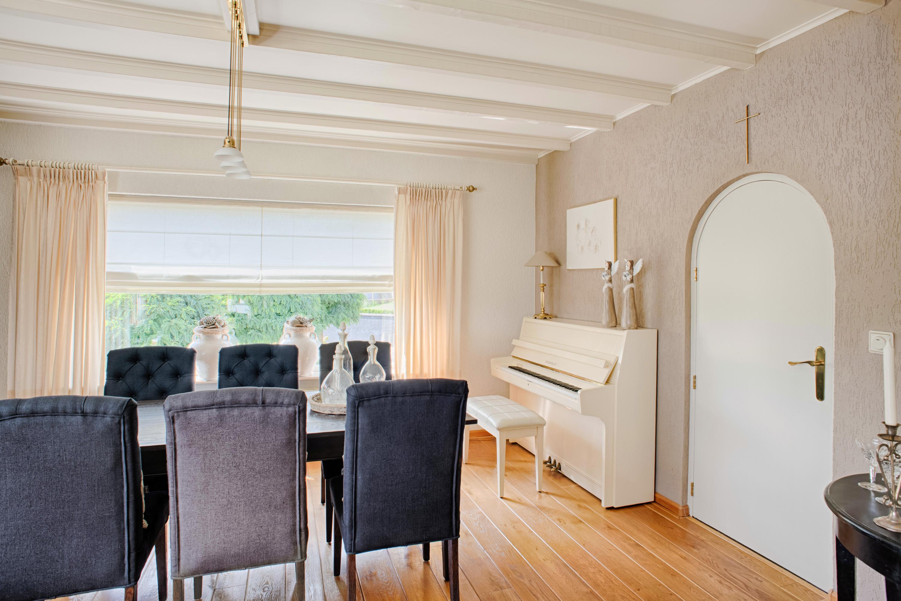 De L-vormige woon-/eetkamer (circa 48 m2) is een stijlvolle leefruimte met een parketvloer en een licht balkenplafond. Uw oog valt op de haard bij het zitgedeelte, maar het allermooiste is het panoramische uitzicht over Simpelveld, het Platte Bos en zelfs tot in Duitsland. Vanuit de woonkamer is er toegang tot én zicht op de wintertuin, waardoor deze een natuurlijk verlengstuk vormt van de leefruimte.