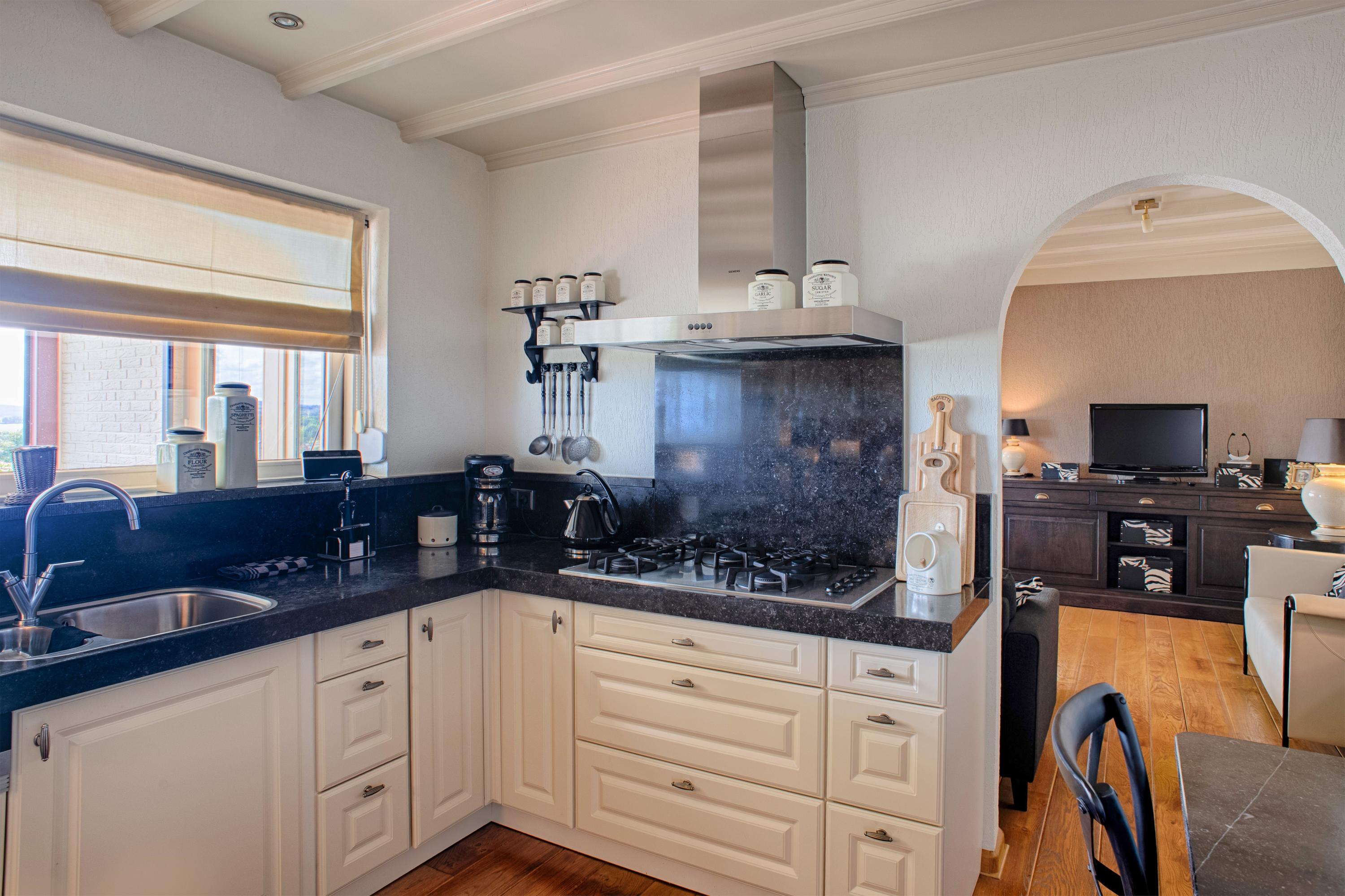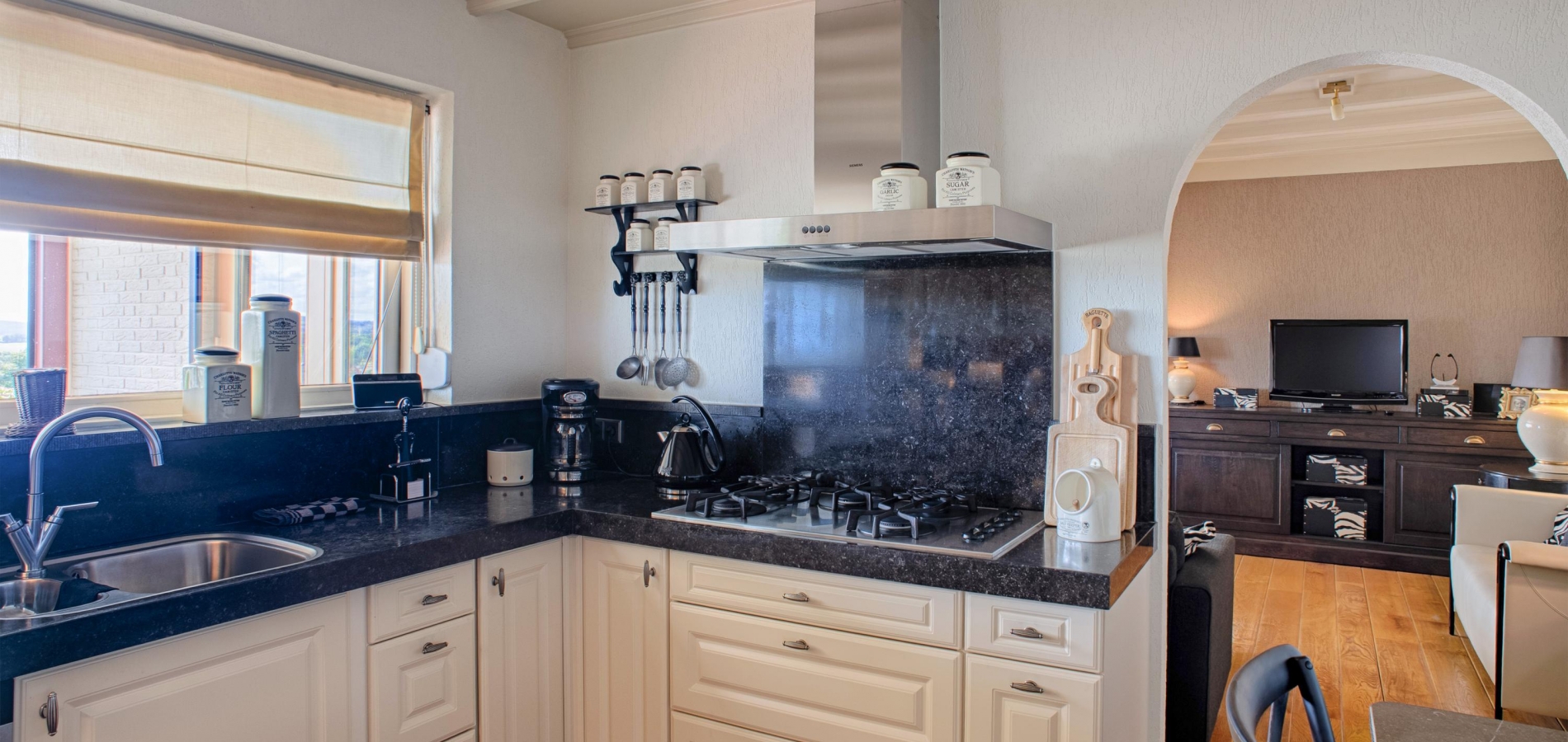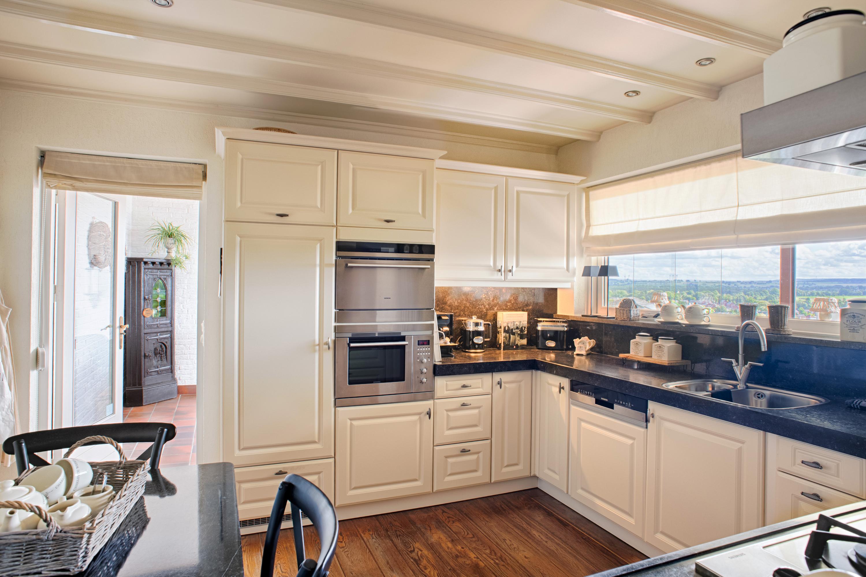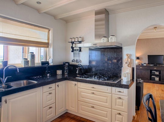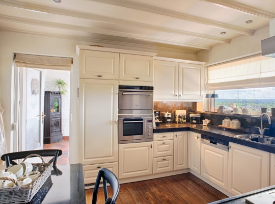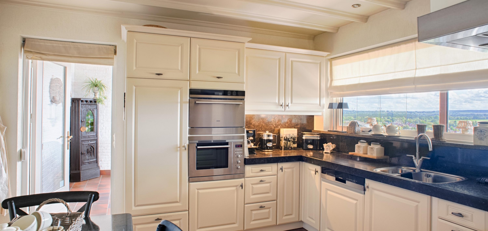 Aansluitend is de keuken (circa 3,40 x 3,68), die ook vanuit de hal bereikbaar is. Er is ruimte voor een ontbijttafel, en ook vanuit hier is het uitzicht van ongekende schoonheid. De hoogwaardige keukenopstelling in een U-vorm, met een aanrechtblad en achterwand van hardsteen, is voorzien van alle benodigde inbouwapparatuur: een gaskookplaat, afzuigkap, vaatwasser, magnetron, stoomoven en een koelkast. Ook vanuit de keuken is er toegang tot de aangrenzende wintertuin.