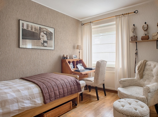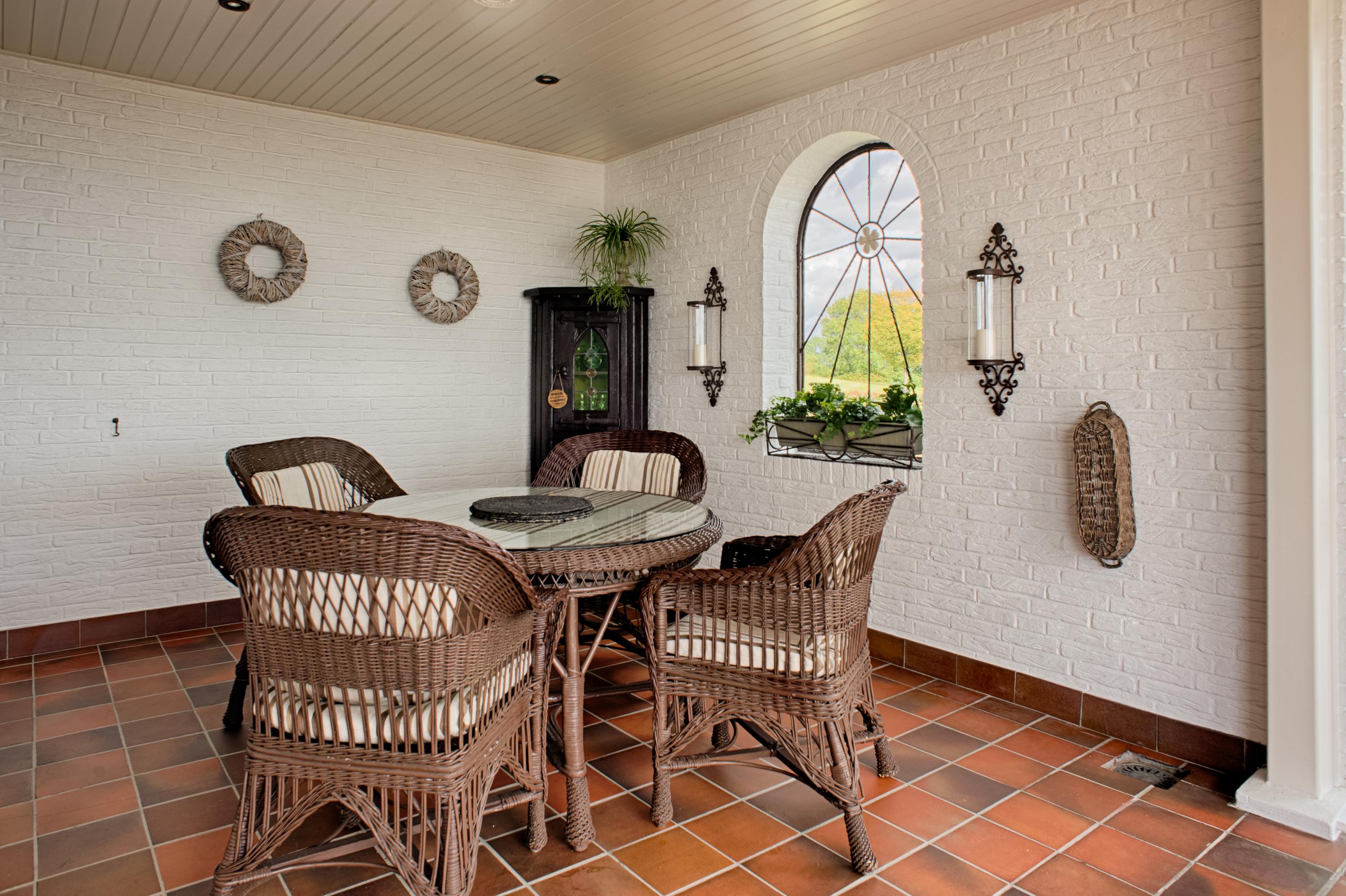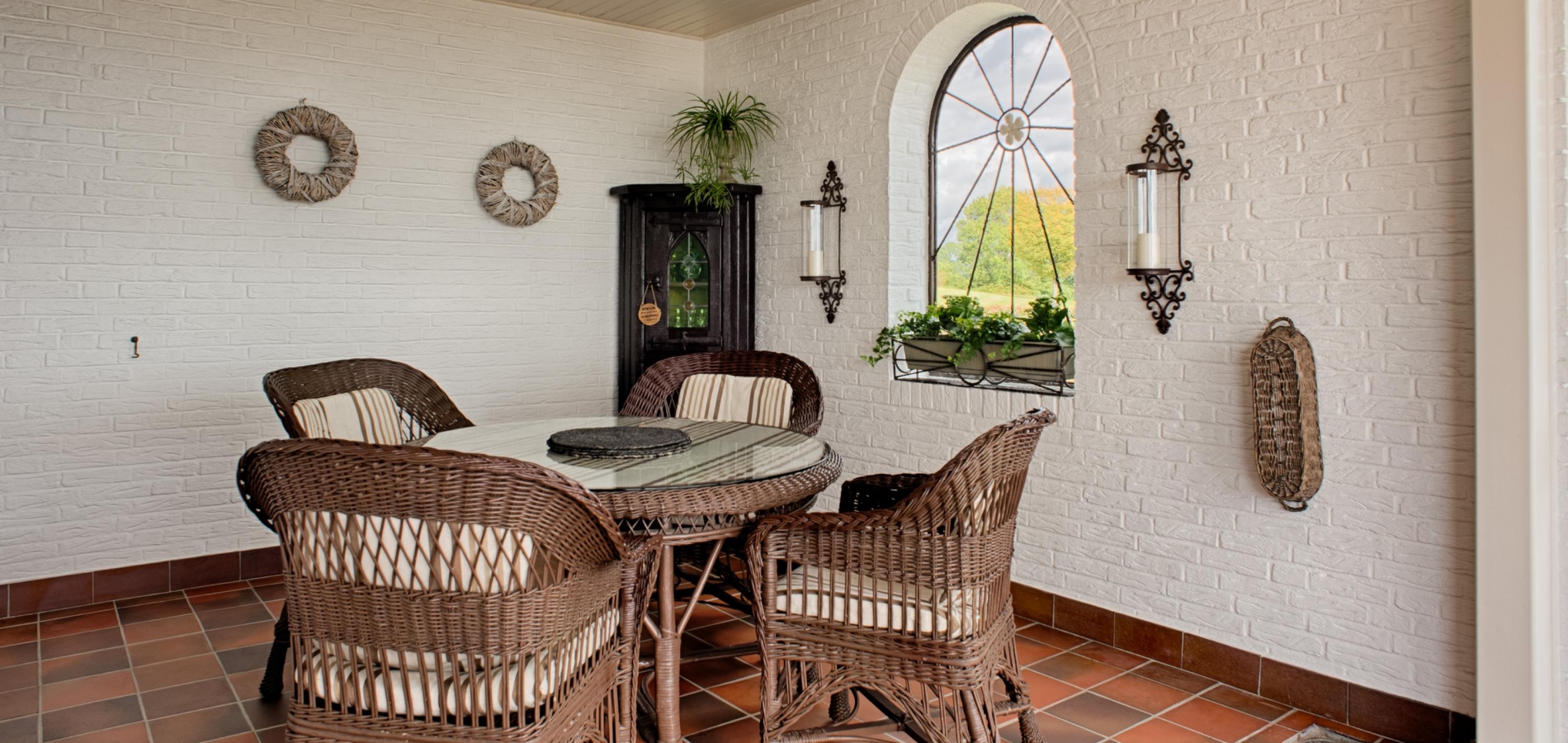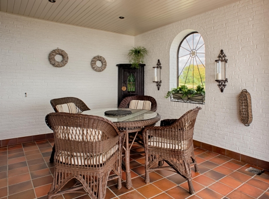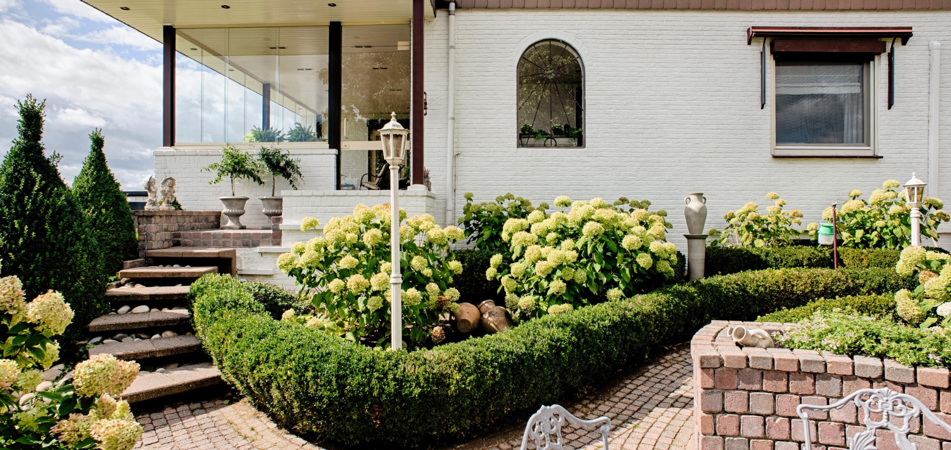 Een geliefde plek is de wintertuin van circa 38 m2, met wellicht het mooiste uitzicht van de regio. Deze lichte ruimte, met grote glazen schuiframen aan drie zijden, biedt de mogelijkheid om zowel binnen als buiten te zitten. Bij de ronde, 4-persoonstafel valt uw oog op het halfronde raam met een bloemvormig motief in het hart.