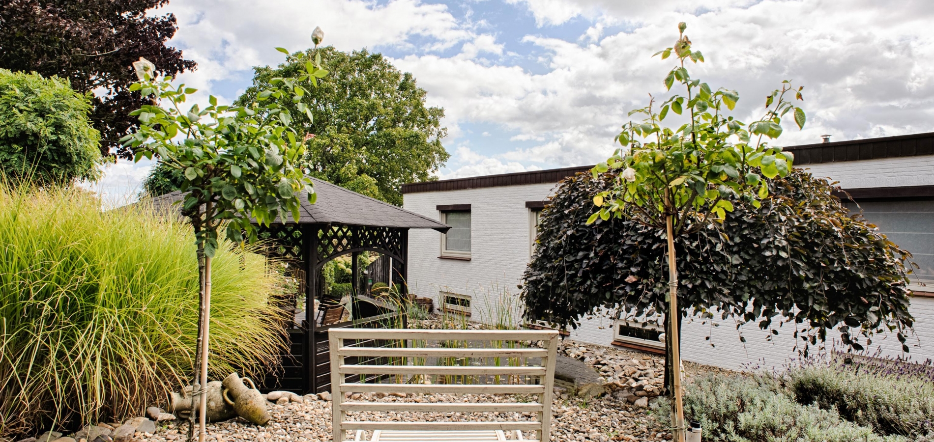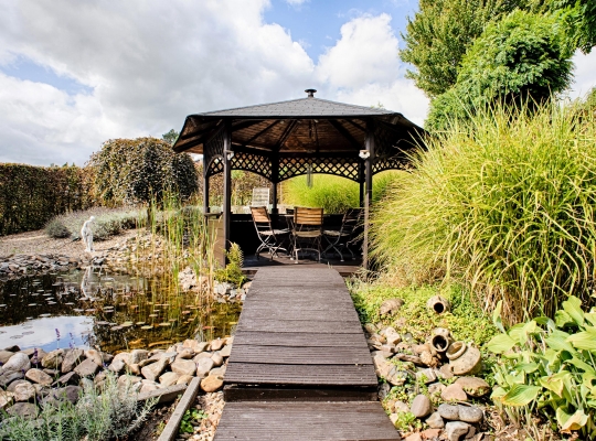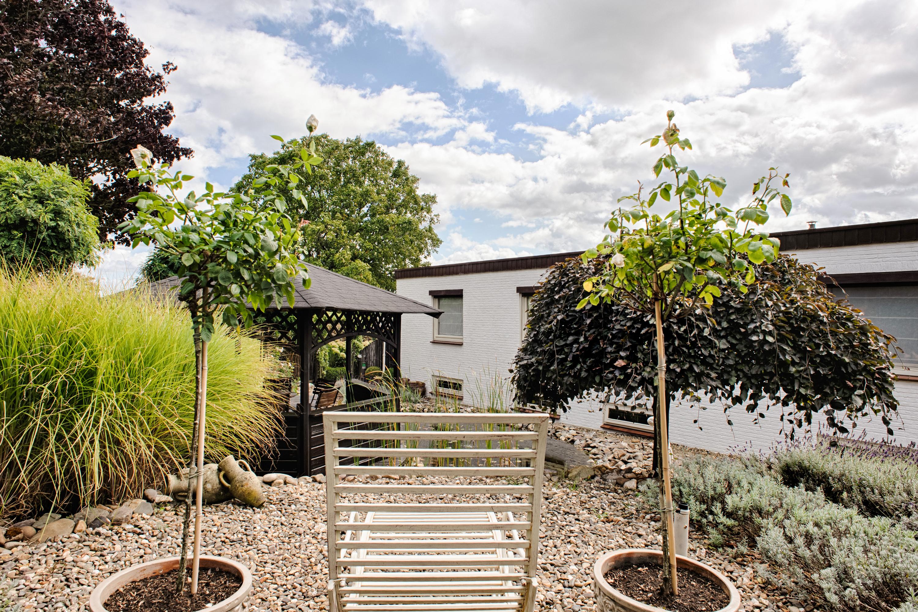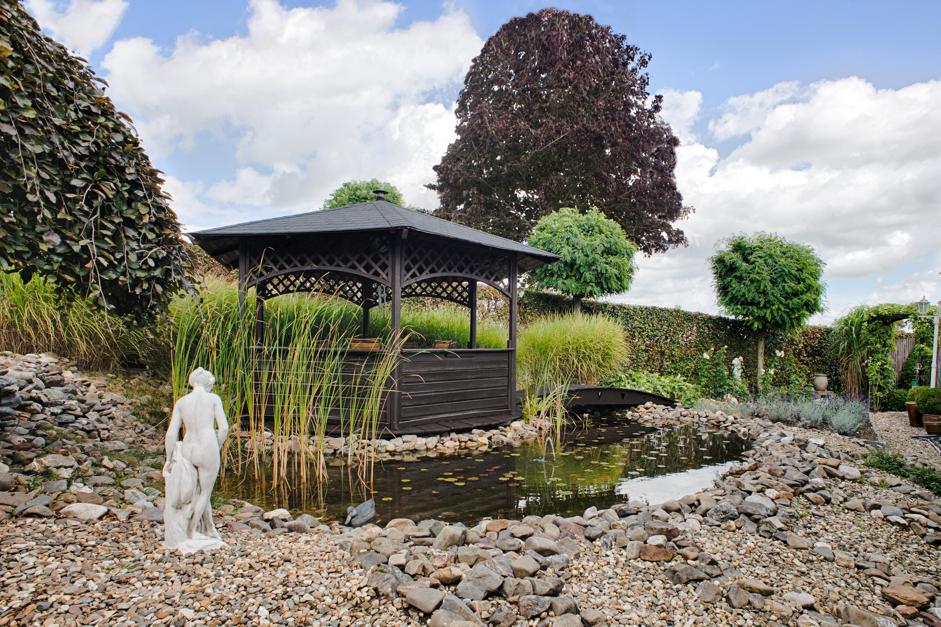 De bungalow wordt omringd door een prachtige, goed onderhouden tuin die aan de voorzijde op straatniveau is. Aan twee kanten heeft de tuin een vrije ligging, met optimale privacy en onbelemmerd uitzicht. De vijver met loopbrug en prieel is een heerlijke plek om tot rust te komen, en op diverse plekken in de tuin vindt u een fijne plek om in de zon te zitten.
