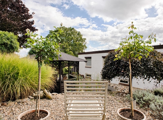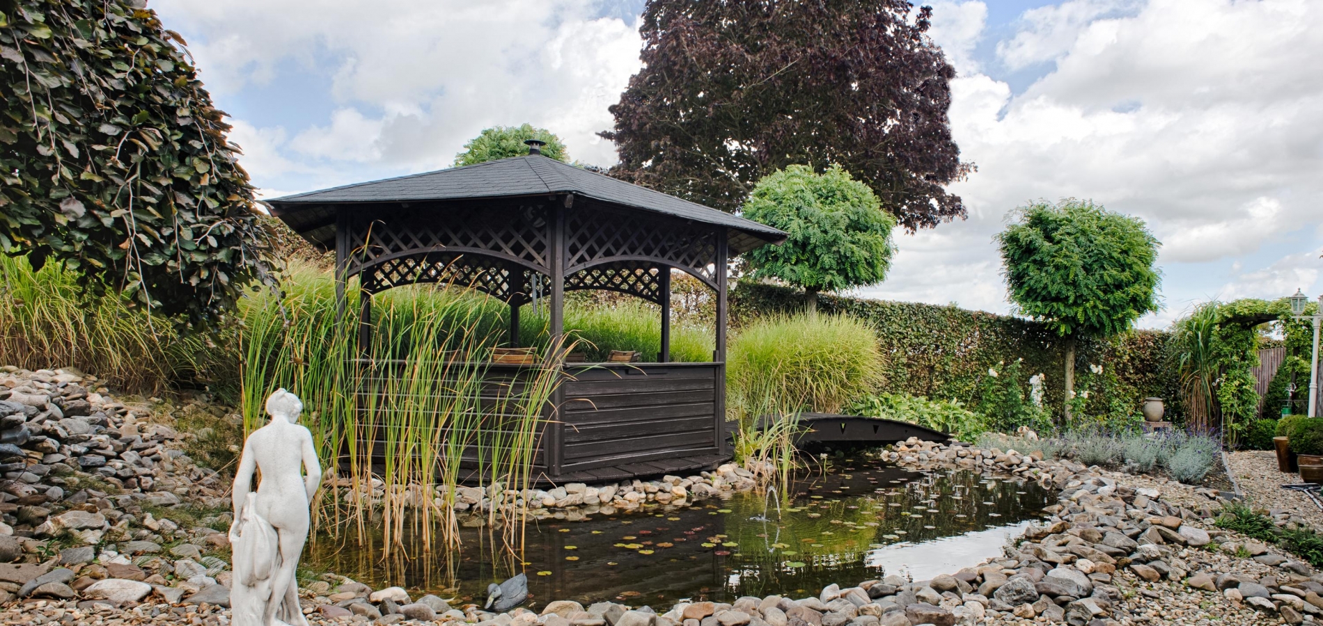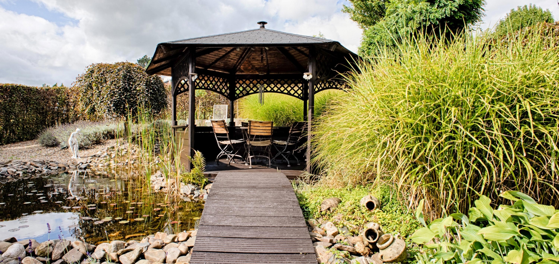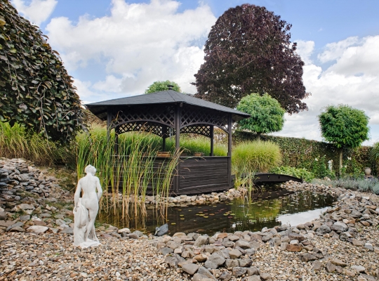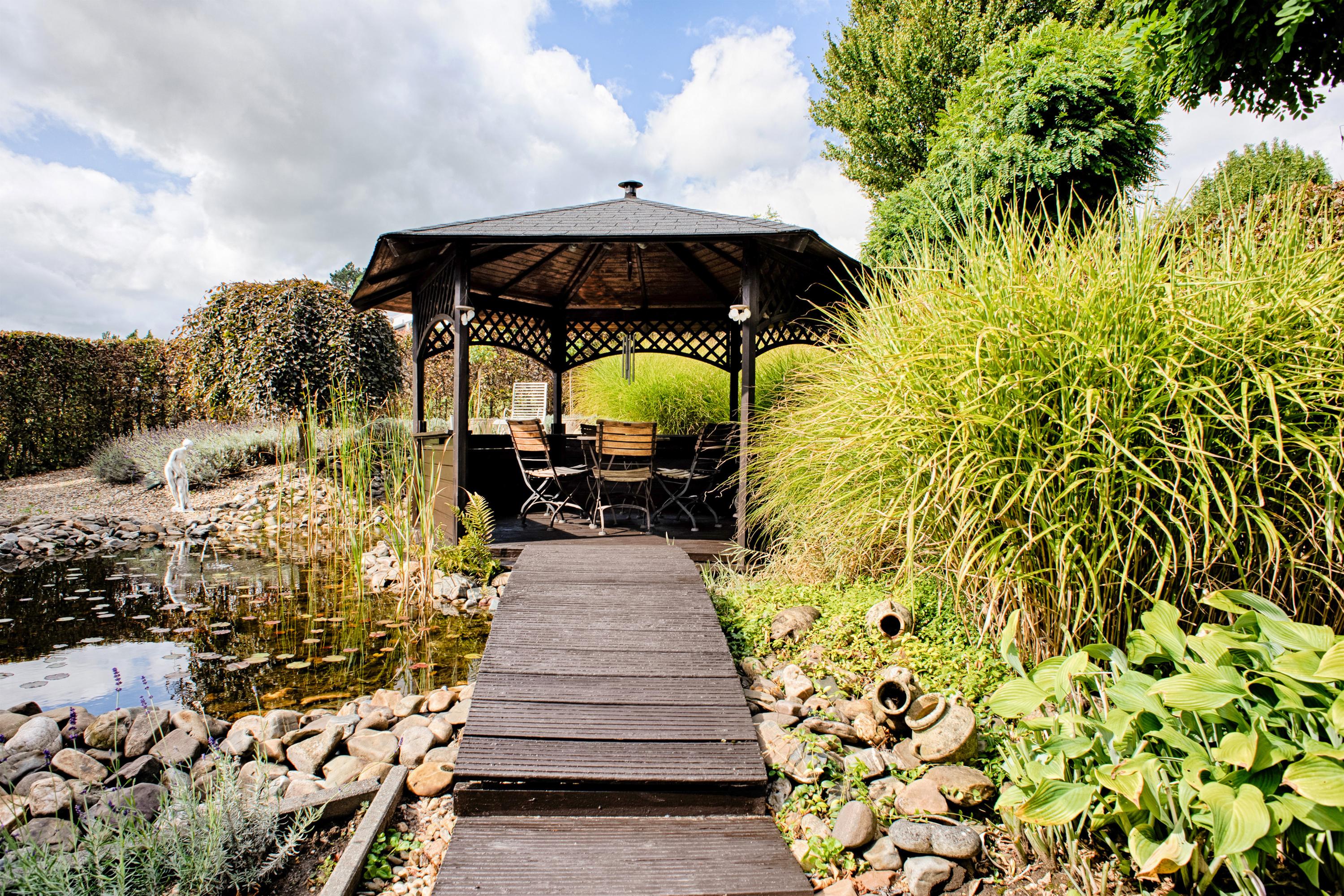 De bungalow wordt omringd door een prachtige, goed onderhouden tuin die aan de voorzijde op straatniveau is. Aan twee kanten heeft de tuin een vrije ligging, met optimale privacy en onbelemmerd uitzicht. De vijver met loopbrug en prieel is een heerlijke plek om tot rust te komen, en op diverse plekken in de tuin vindt u een fijne plek om in de zon te zitten.