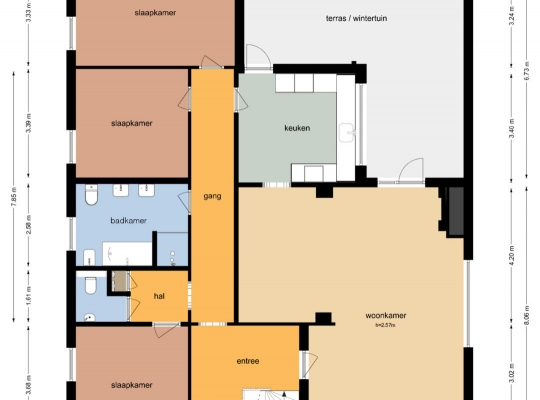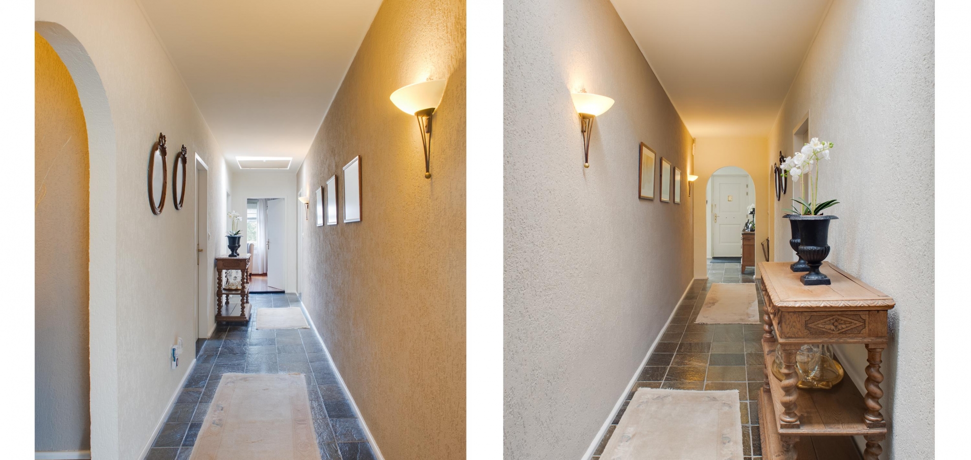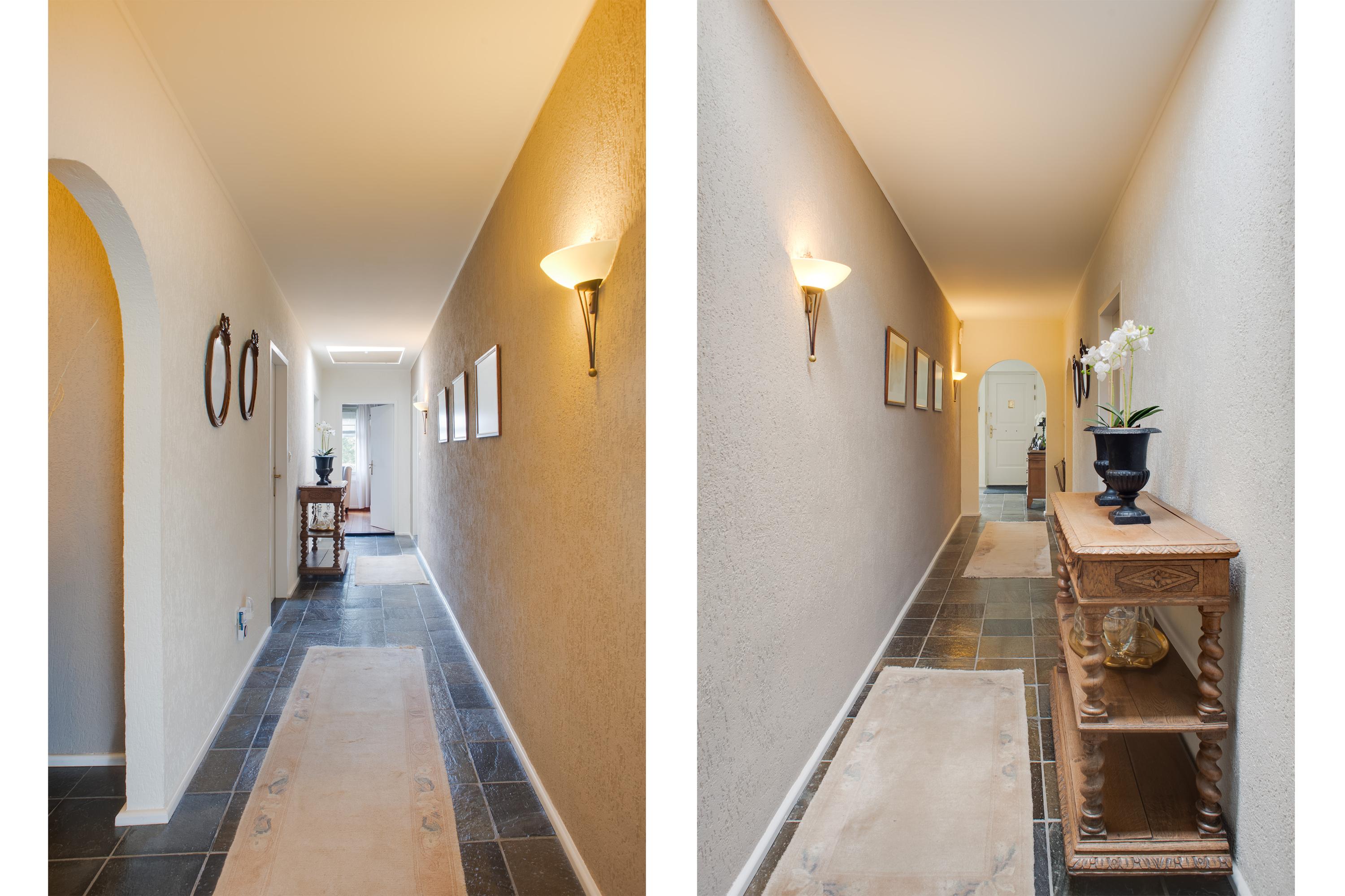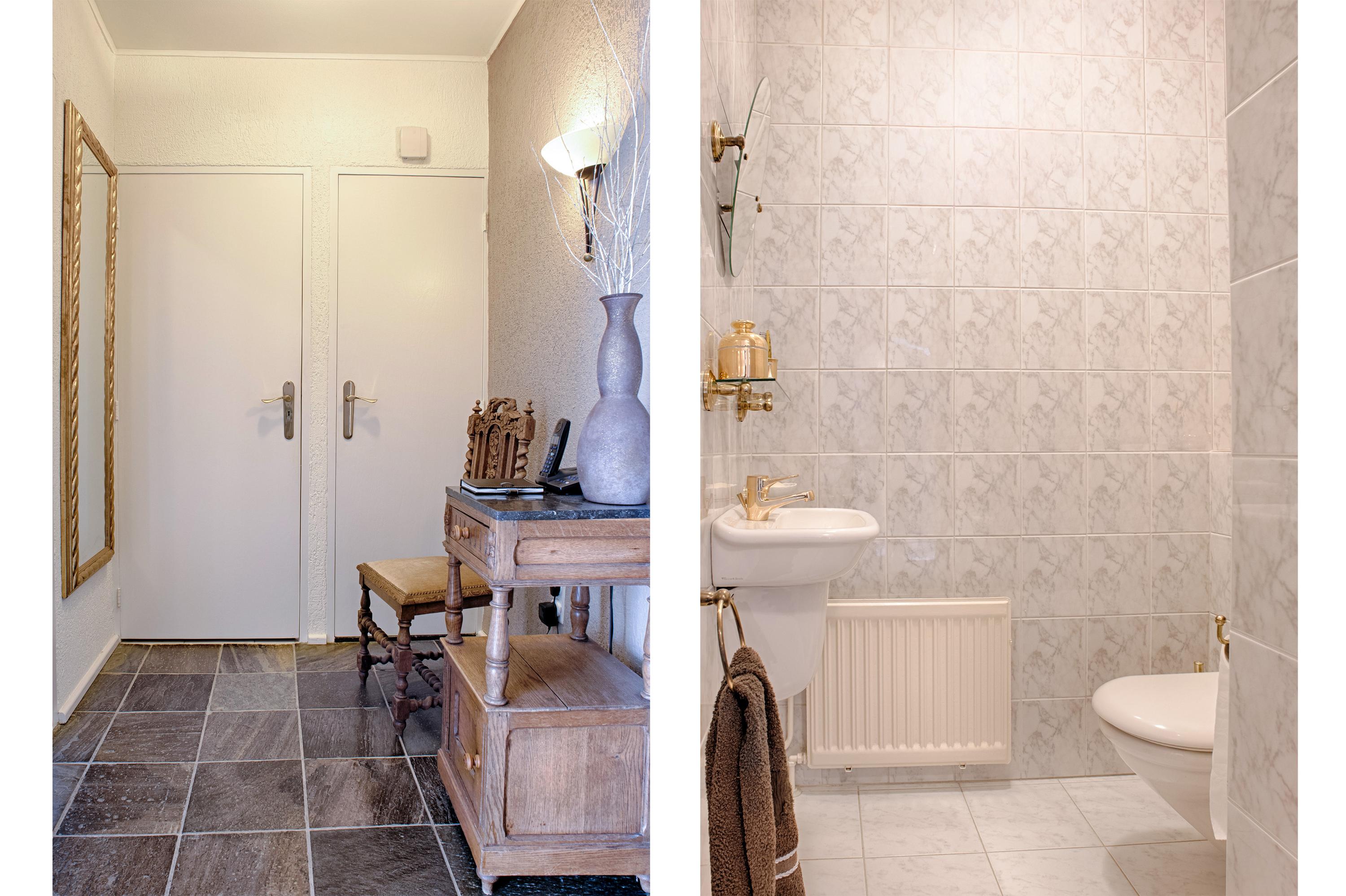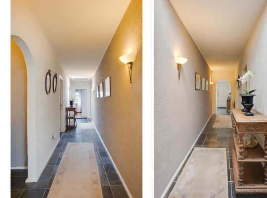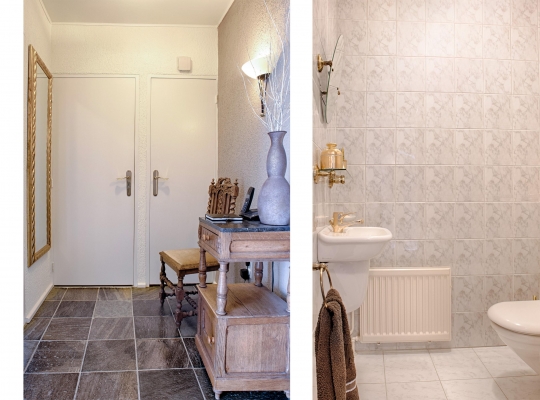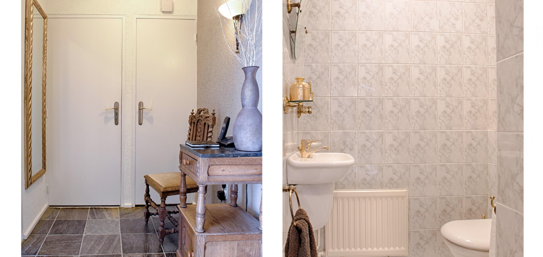 Aan het einde van de oprit, waar twee auto’s kunnen staan, loopt u linksaf naar een buitentrap. Deze trap leidt naar de entree van deze royale bungalow. In de lichte hal (circa 3,39 x 3,68) ligt een fraaie leisteen vloer en ziet u de trap naar het souterrain. De aansluitende gang met tweede hal geeft toegang tot nagenoeg alle ruimtes op de begane grond, waaronder het gastentoilet met fonteintje.