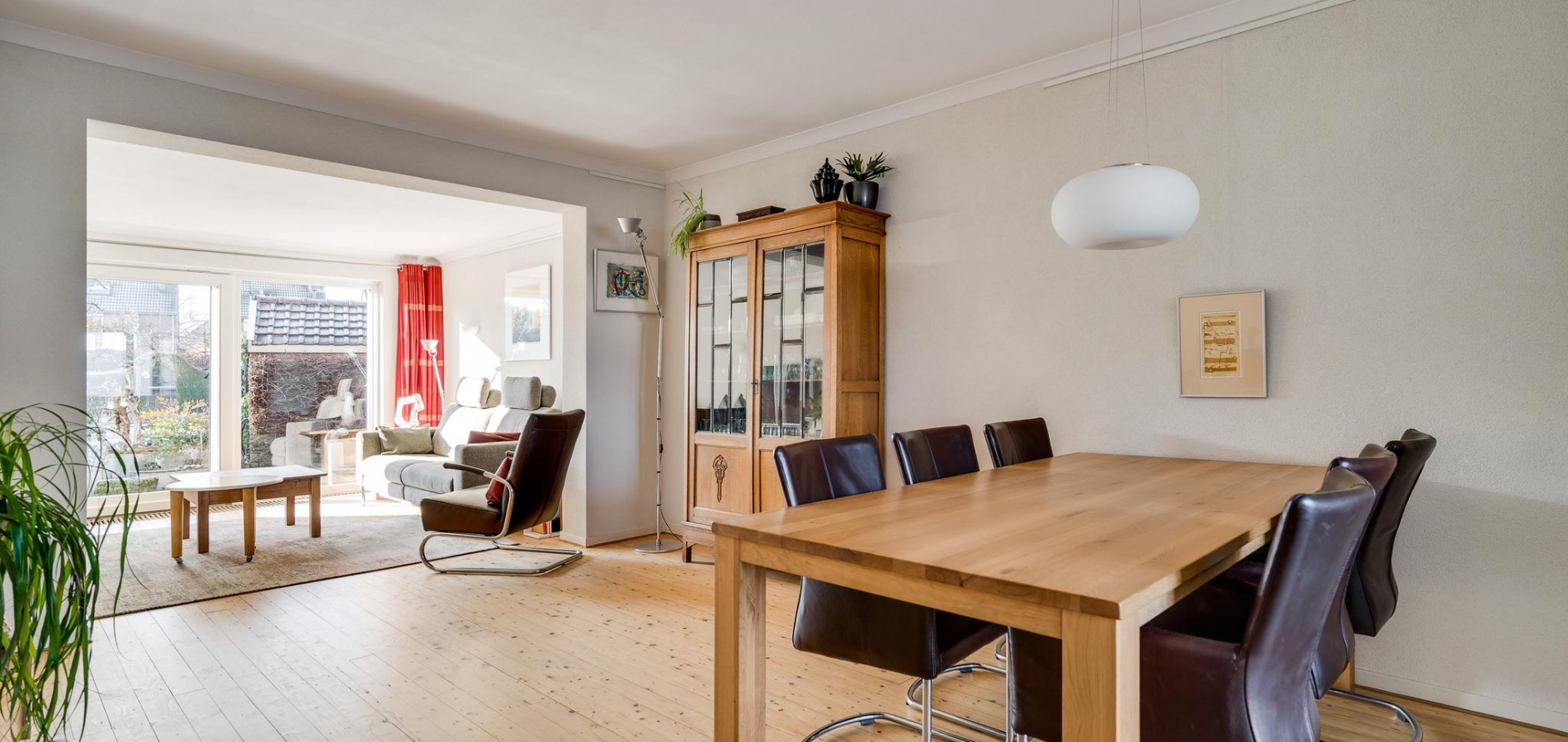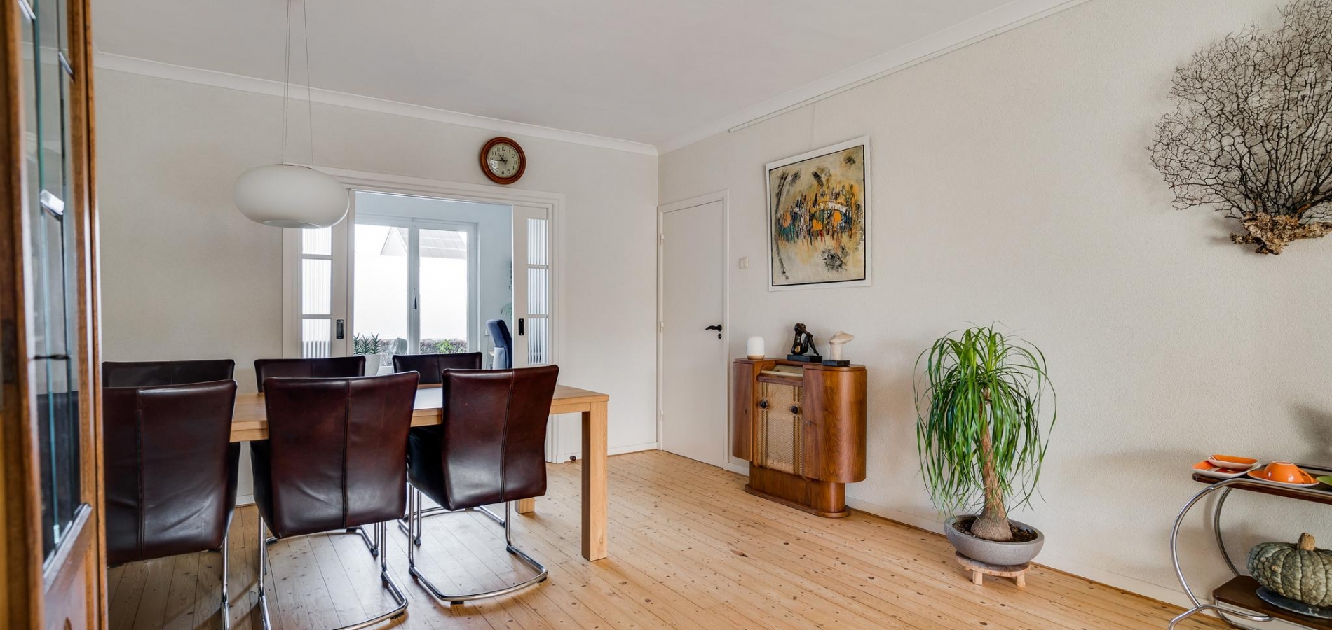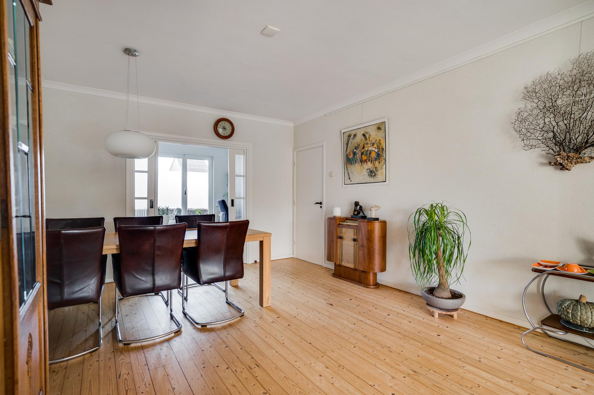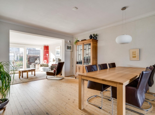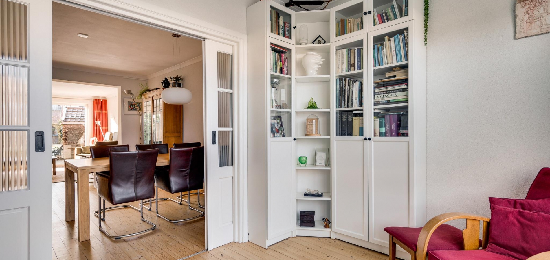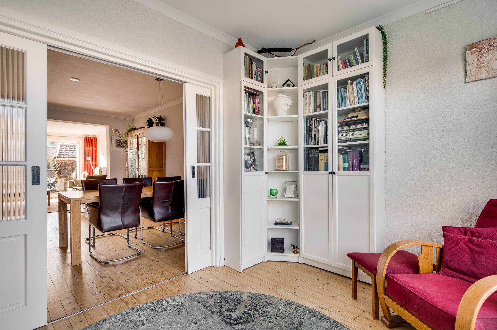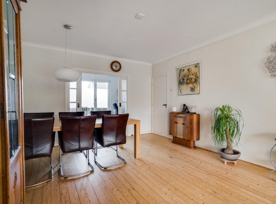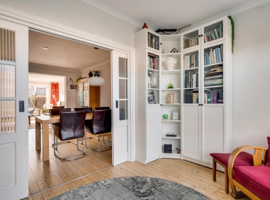 Vanuit de hal zijn de woonkamer en keuken te bereiken. De woonkamer met uitbouw en airco is een verrassend grote leefruimte van maar liefst 43 m2, met een schuifpui naar de tuin en de originele en-suite deuren. De voorkamer is in gebruik als werkkamer en het tweede, tevens grootste deel is een fantastische eetkamer. Aan de achterzijde is de zitkamer met dezelfde vloer-, wand- en plafondafwerking.