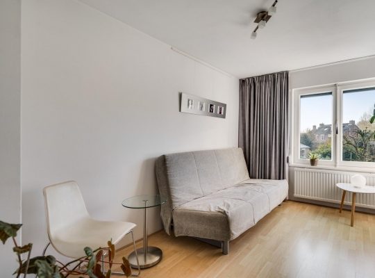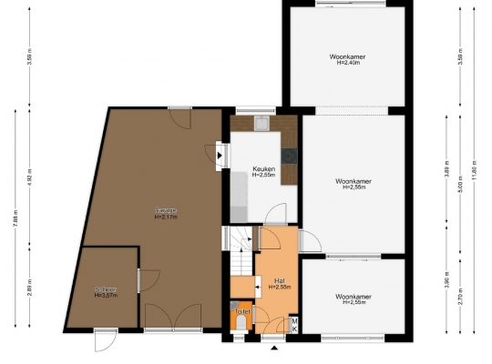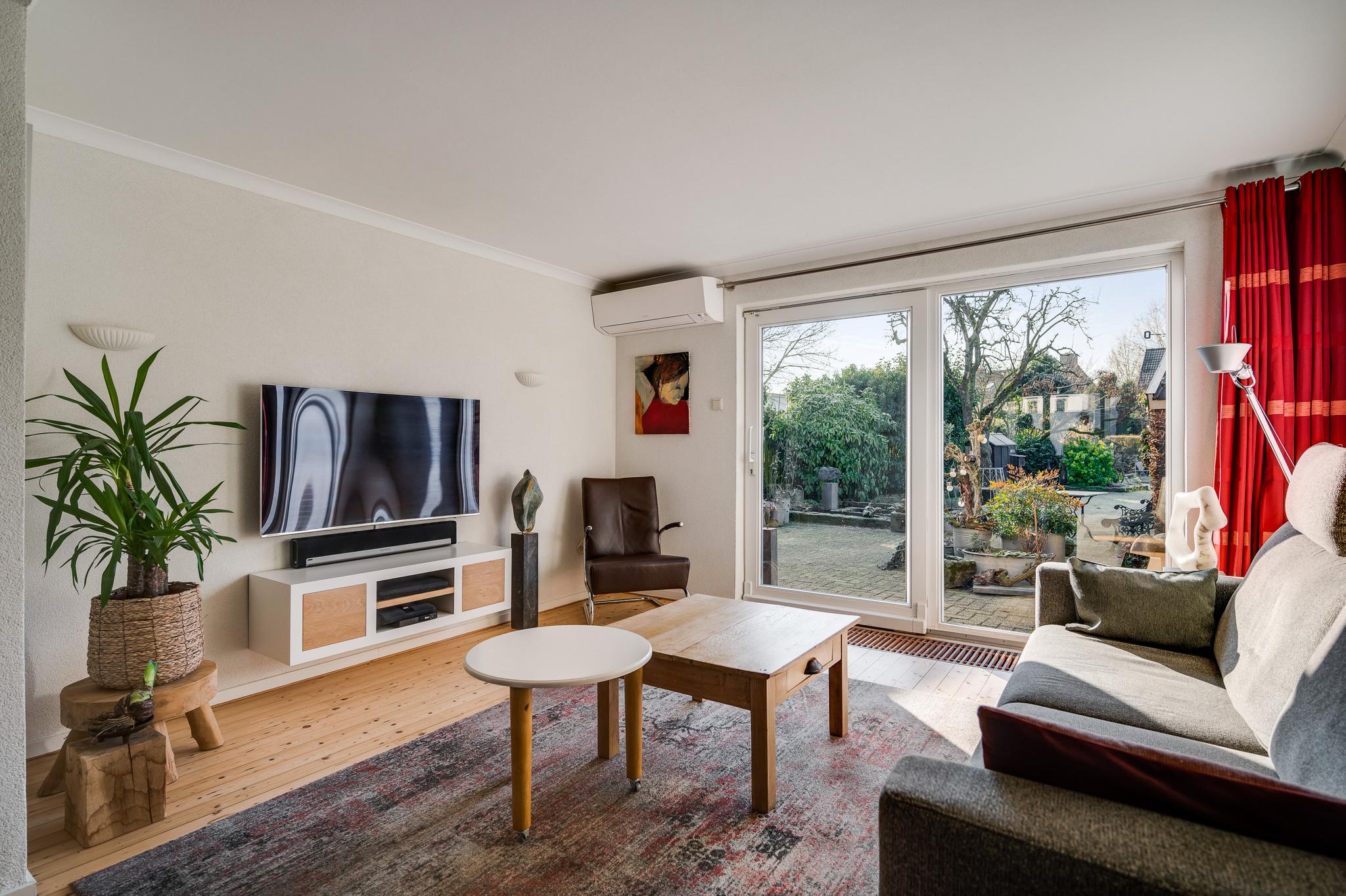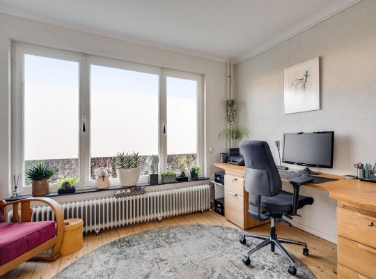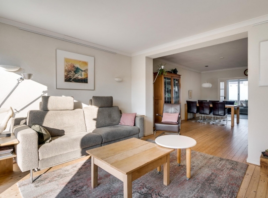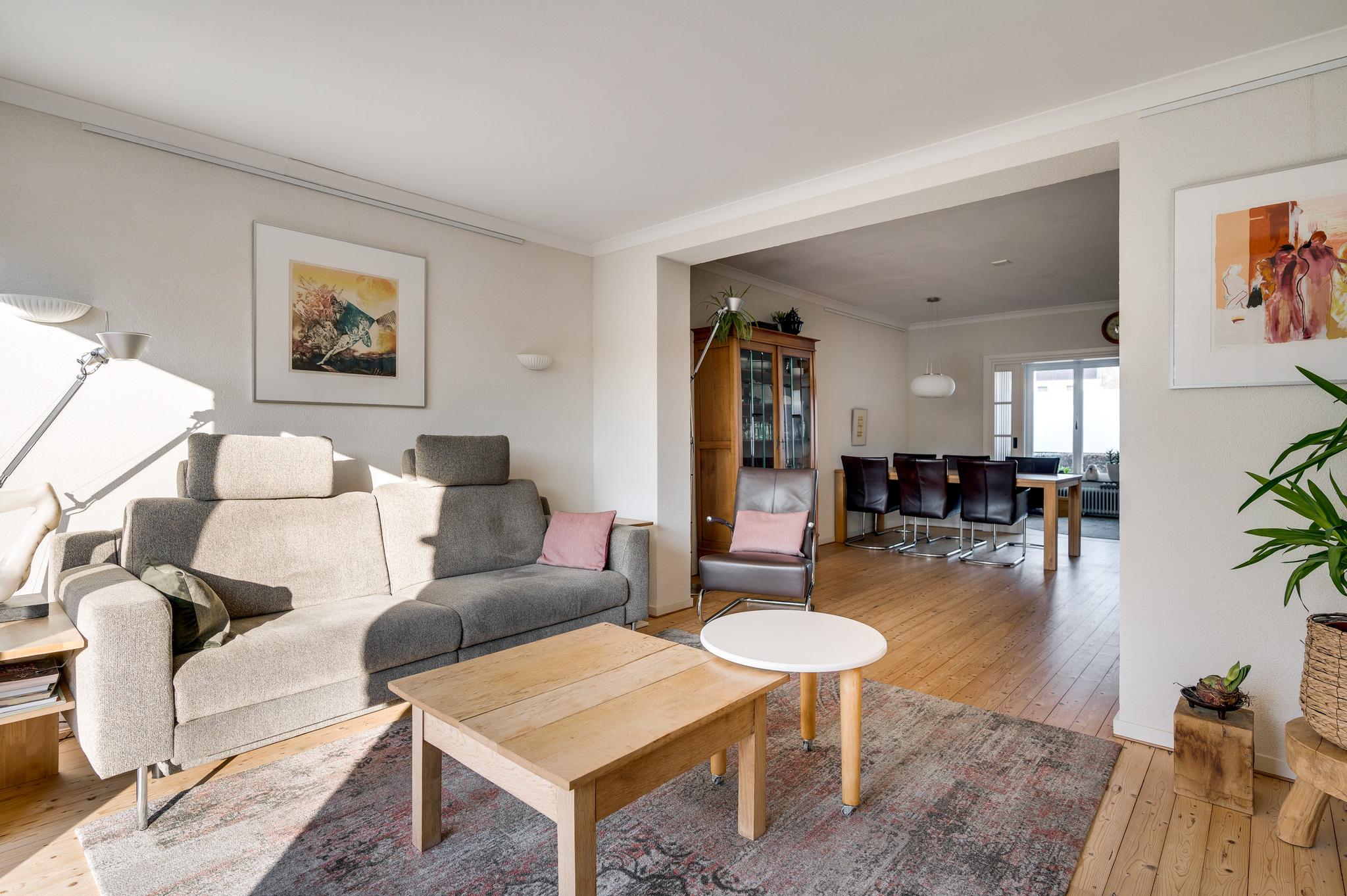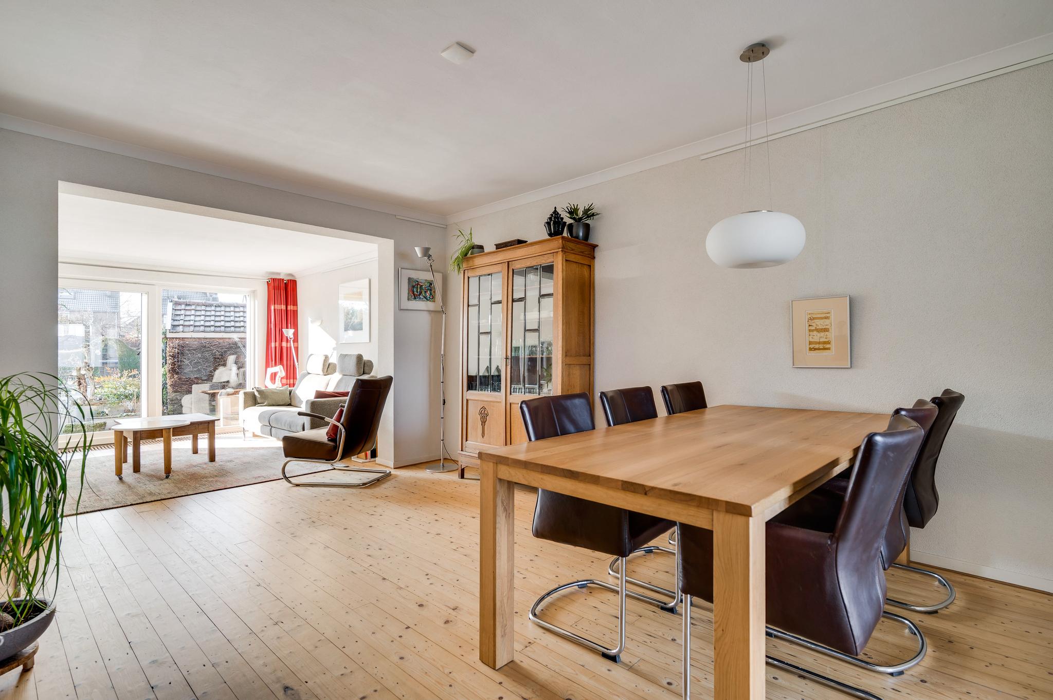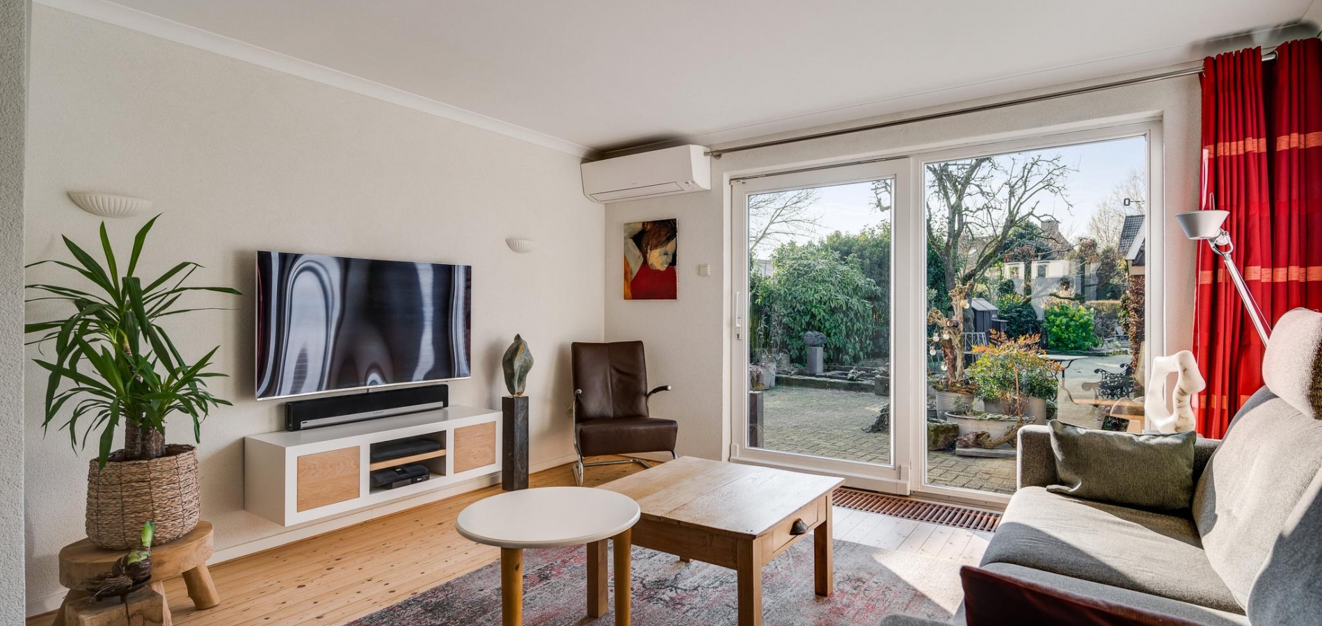 Vanuit de hal zijn de woonkamer en keuken te bereiken. De woonkamer met uitbouw en airco is een verrassend grote leefruimte van maar liefst 43 m2, met een schuifpui naar de tuin en de originele en-suite deuren. De voorkamer is in gebruik als werkkamer en het tweede, tevens grootste deel is een fantastische eetkamer. Aan de achterzijde is de zitkamer met dezelfde vloer-, wand- en plafondafwerking.