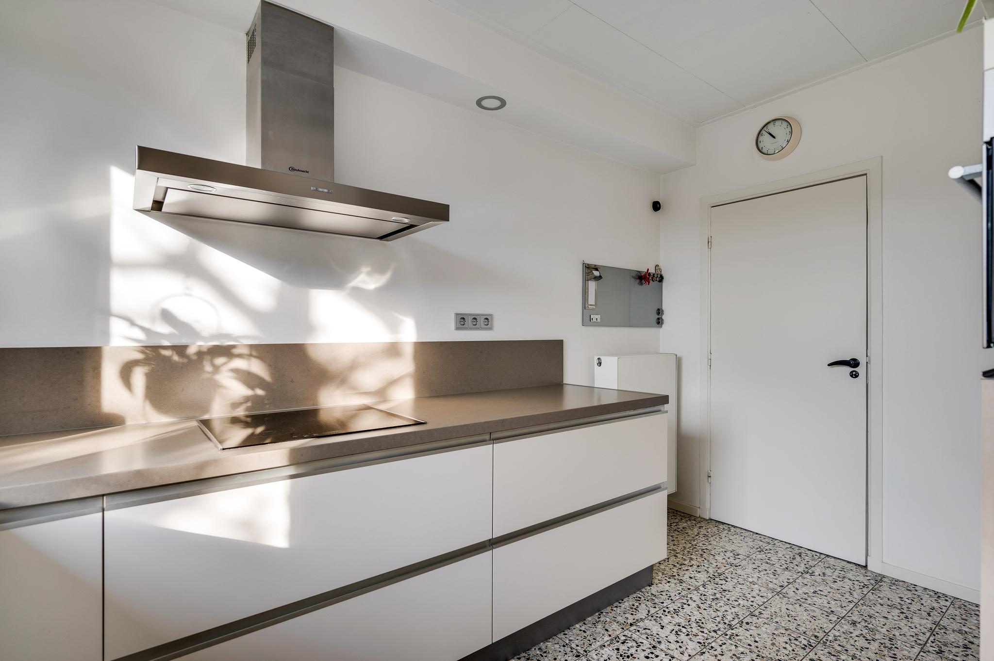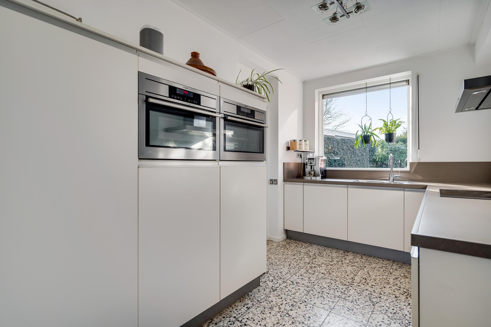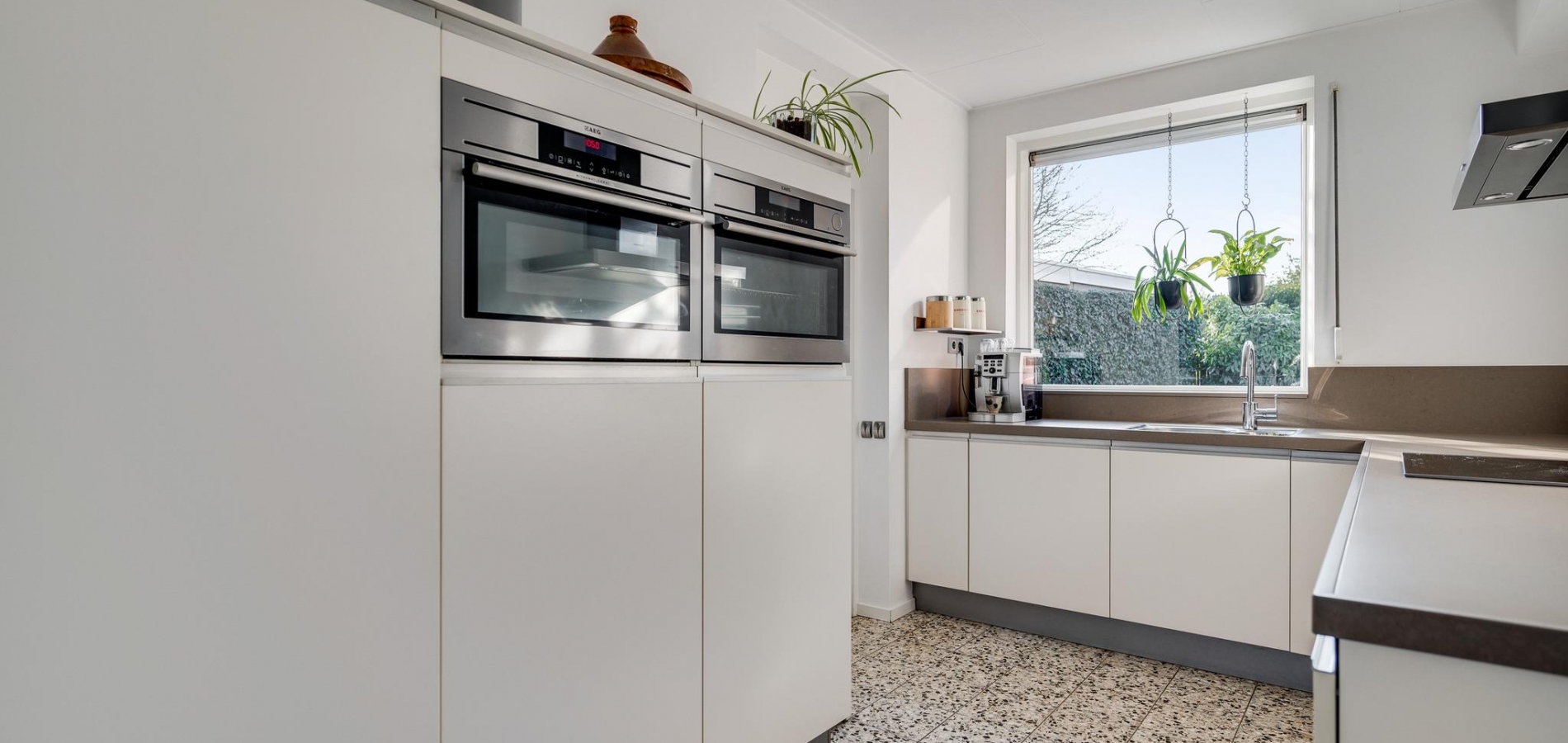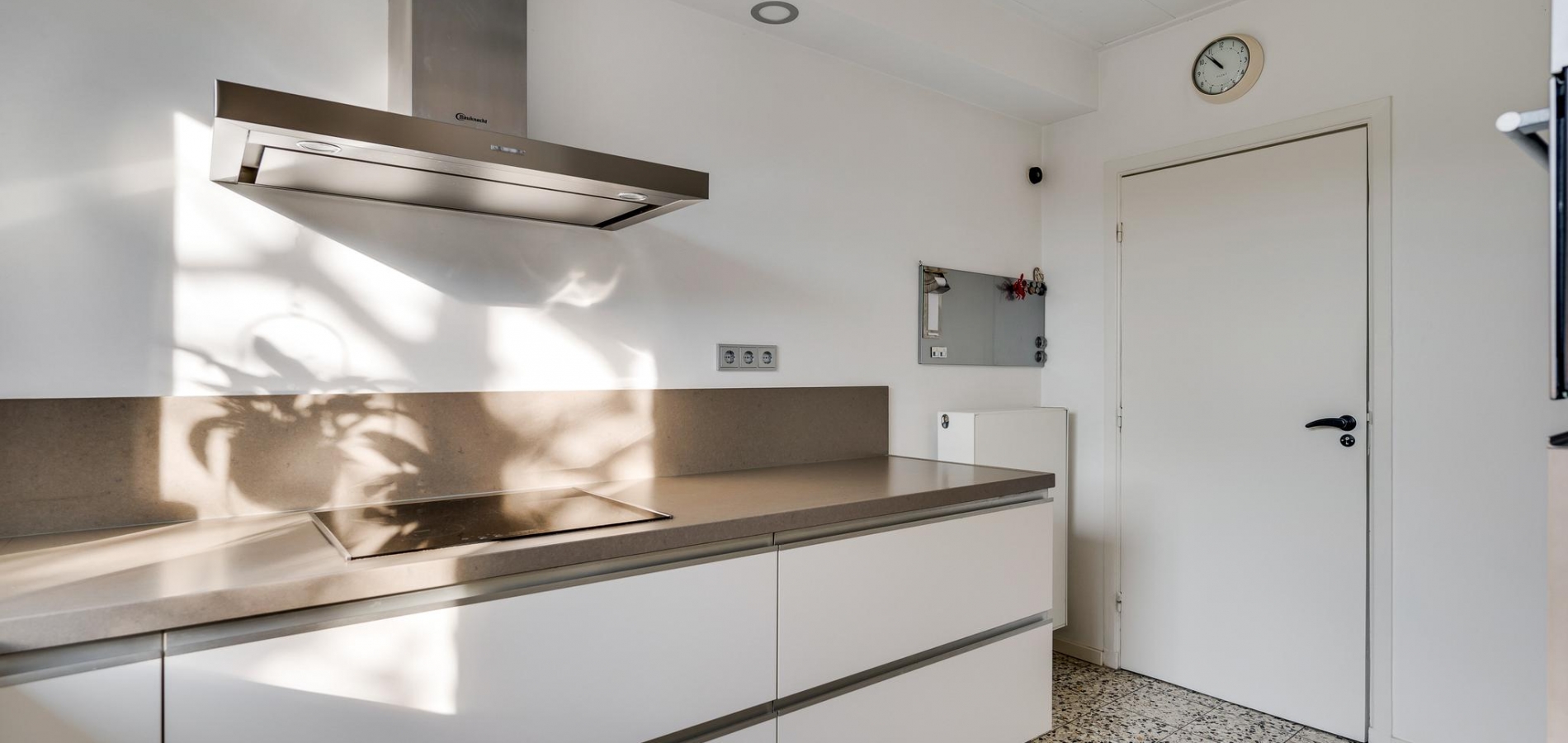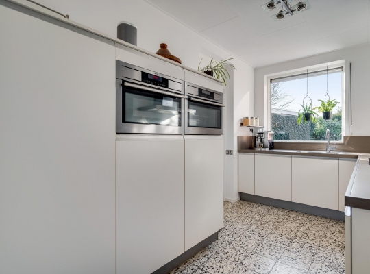 In de dichte keuken (circa 3,89 x 2,43) ligt dezelfde tegelvloer als de hal en toiletruimte. Er staat een royale, moderne opstelling met een taupekleurig aanrechtblad en alle benodigde apparatuur is ingebouwd: een inductie kookplaat, afzuigkap, koelkast, stoomoven, combimagnetron en een vaatwasser. Voor warm water is een aparte keukenboiler aangesloten.