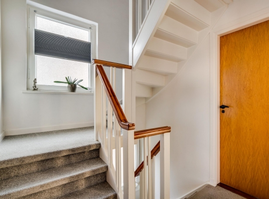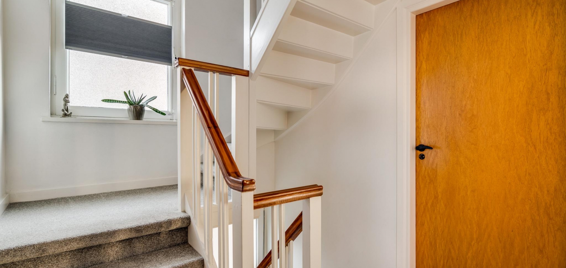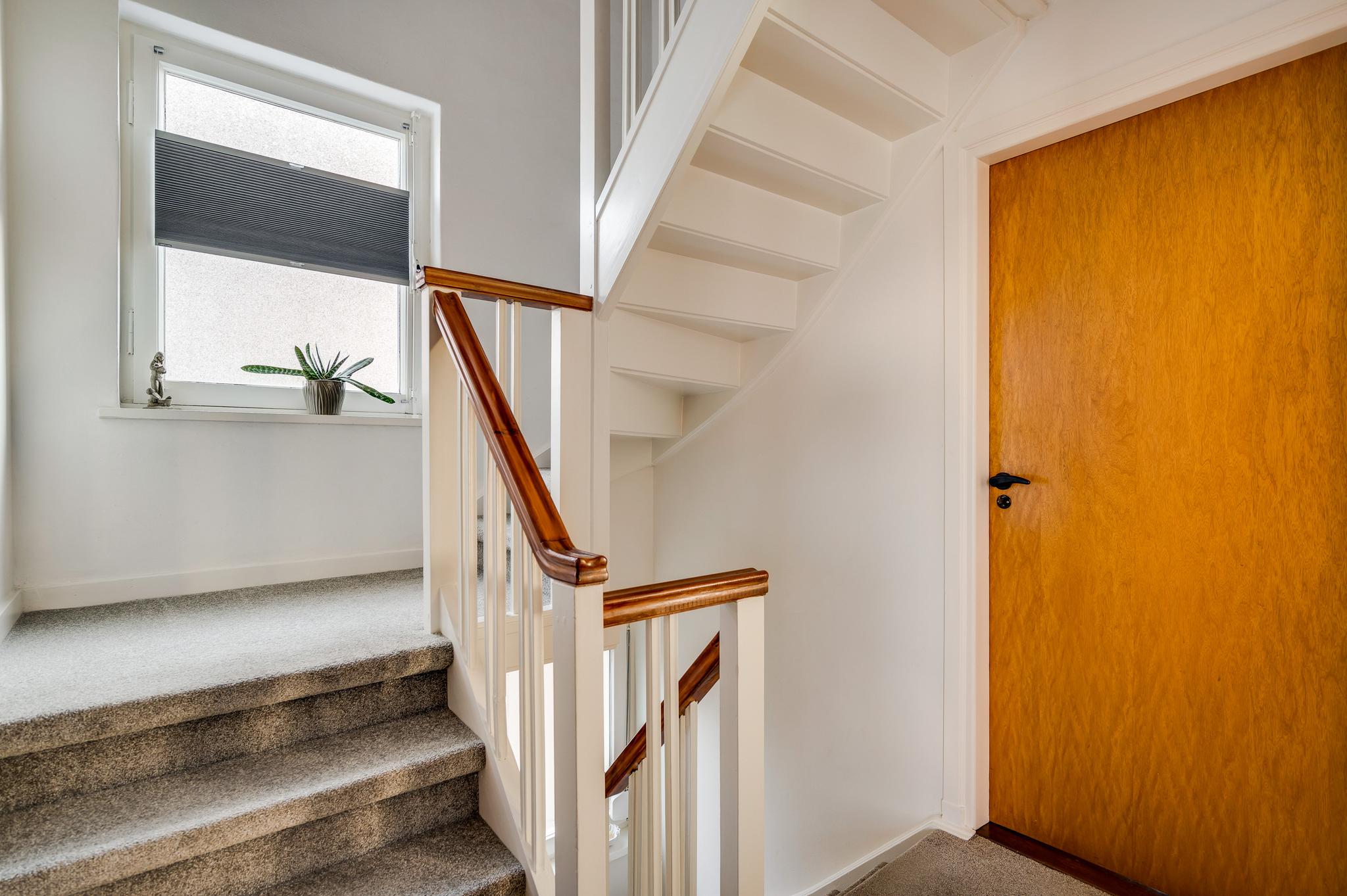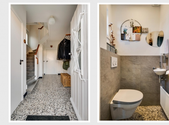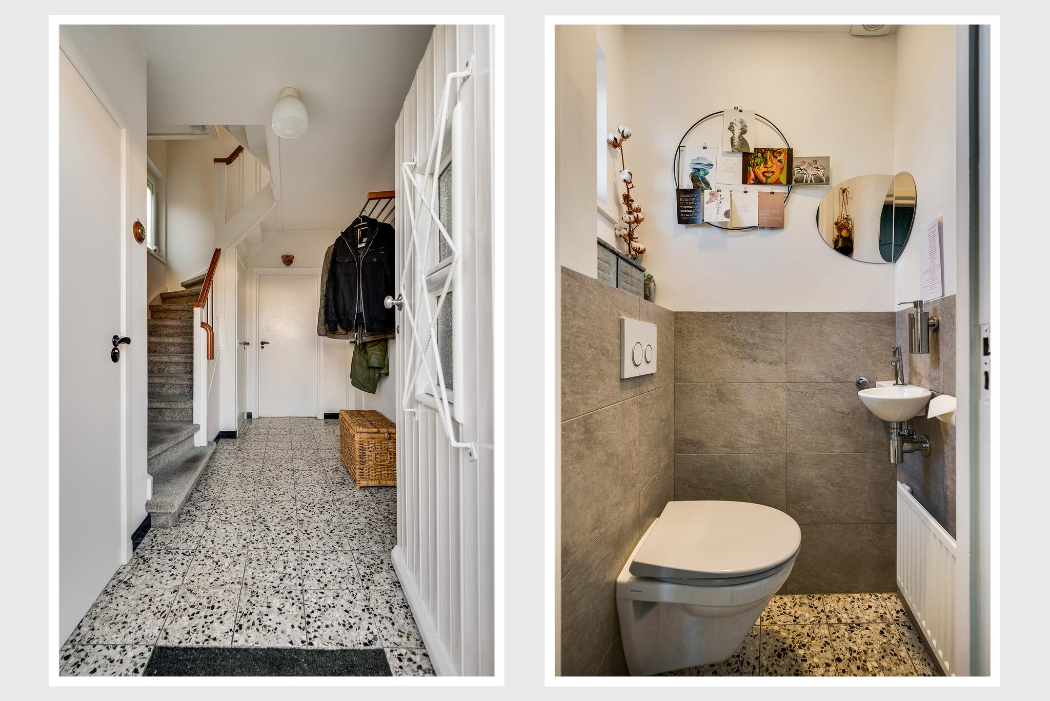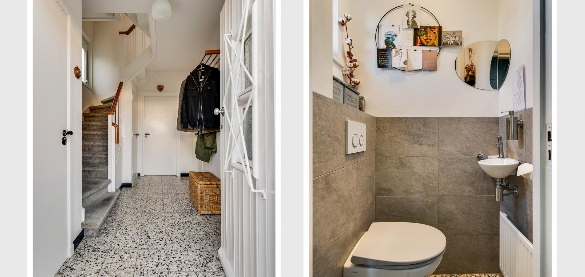 De hal is een fraaie ontvangstruimte, met originele elementen uit de jaren 50. Dit geldt voor de voordeur, het deurbeslag en de stijlvolle trap naar de eerste verdieping. Links in de hal is de vernieuwde toiletruimte met fonteintje en aan de rechterzijde is de meterkast met aparte groepen voor zonnepanelen en laadstation.