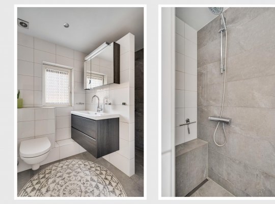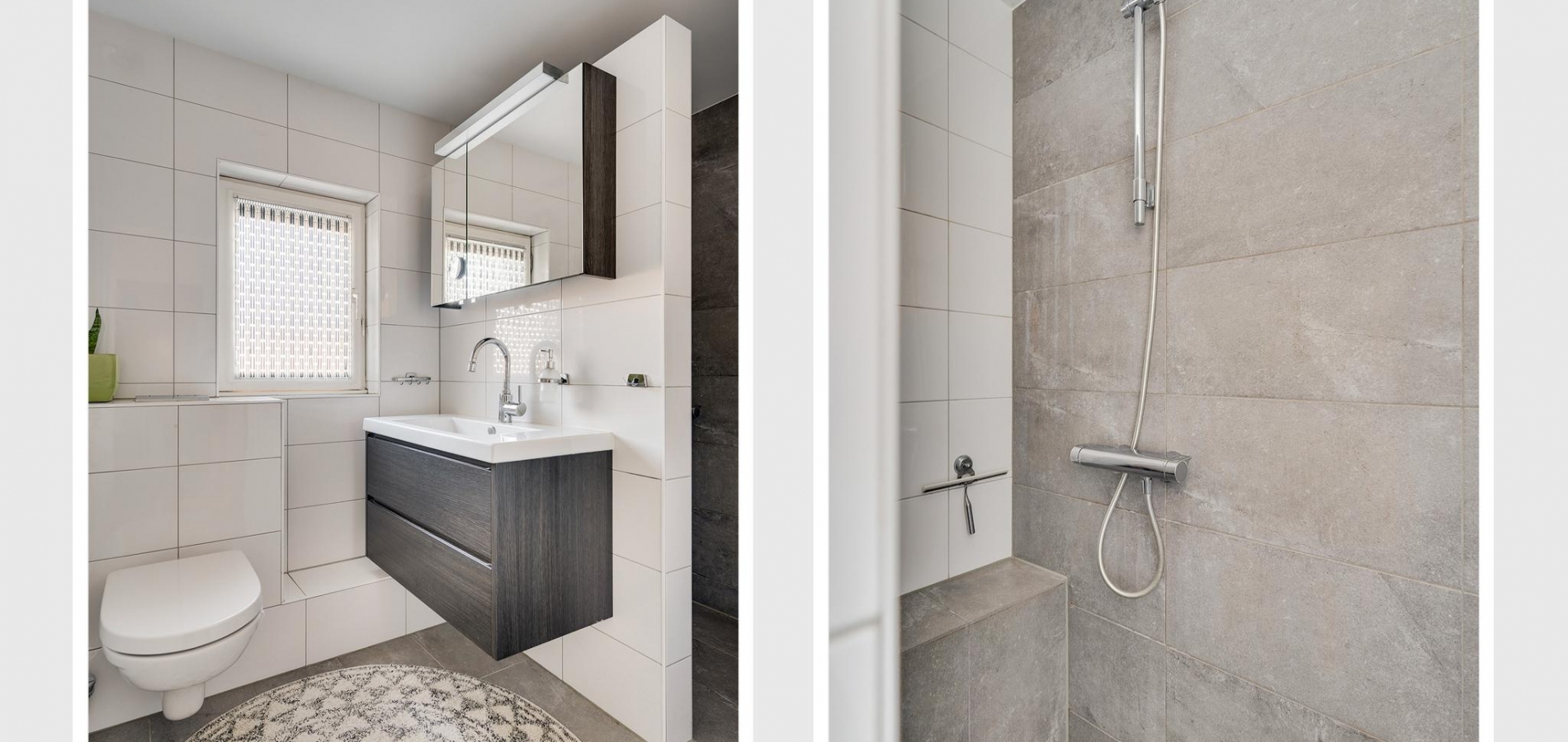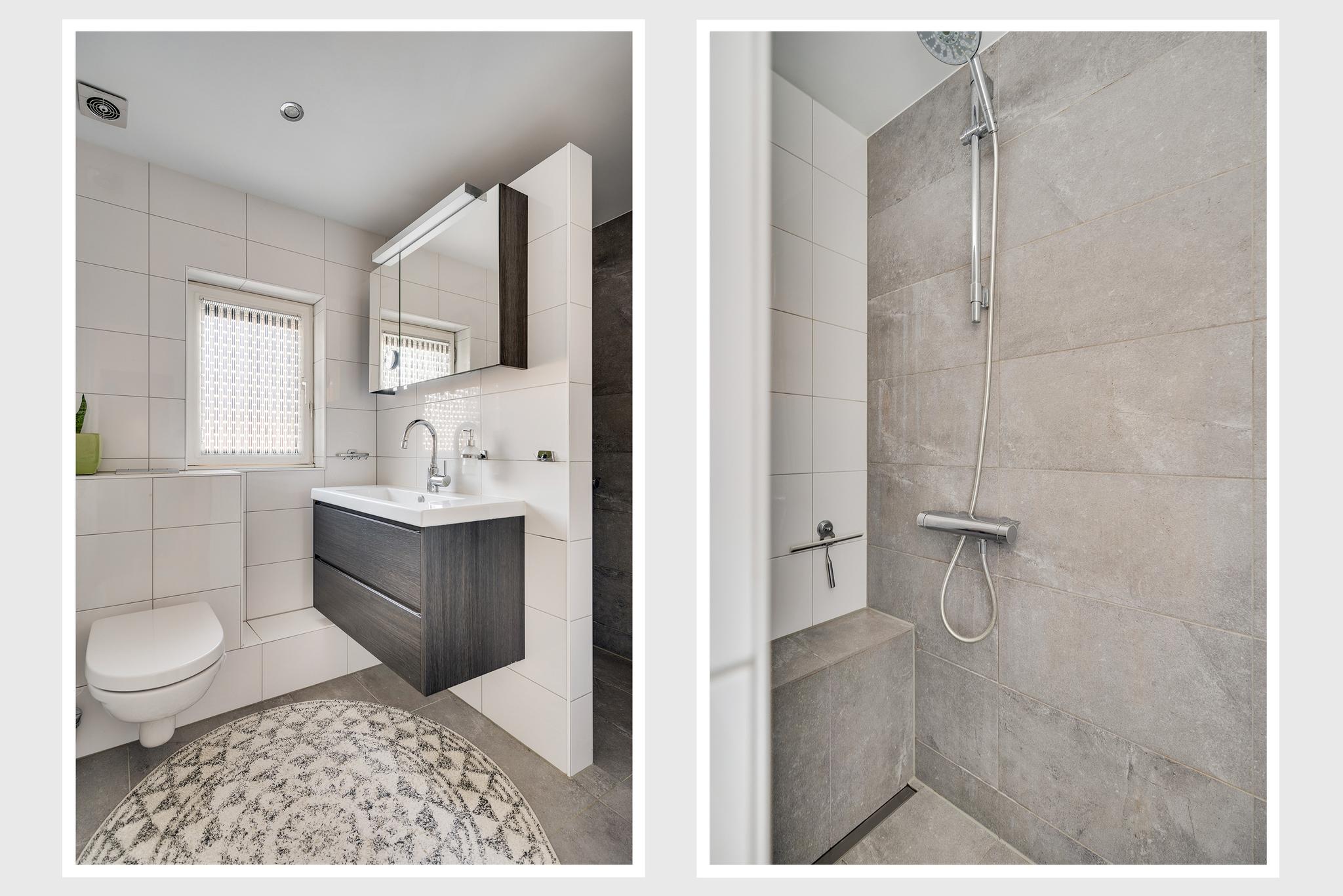 De vernieuwde badkamer (circa 2,41 x 1,63), uitgevoerd in wit en grijs, is ingedeeld met een inloopdouche, wastafelmeubel, wandcloset en een handdoekenradiator.
