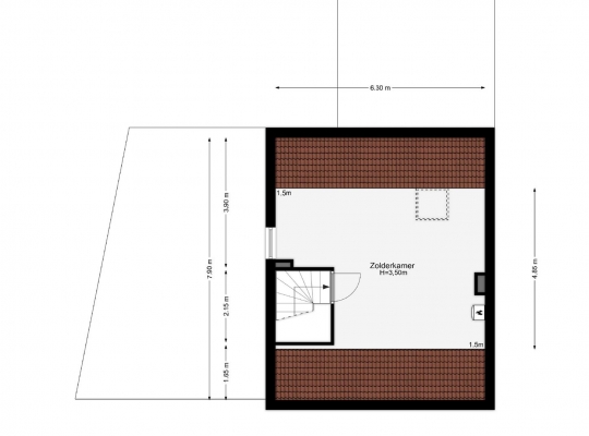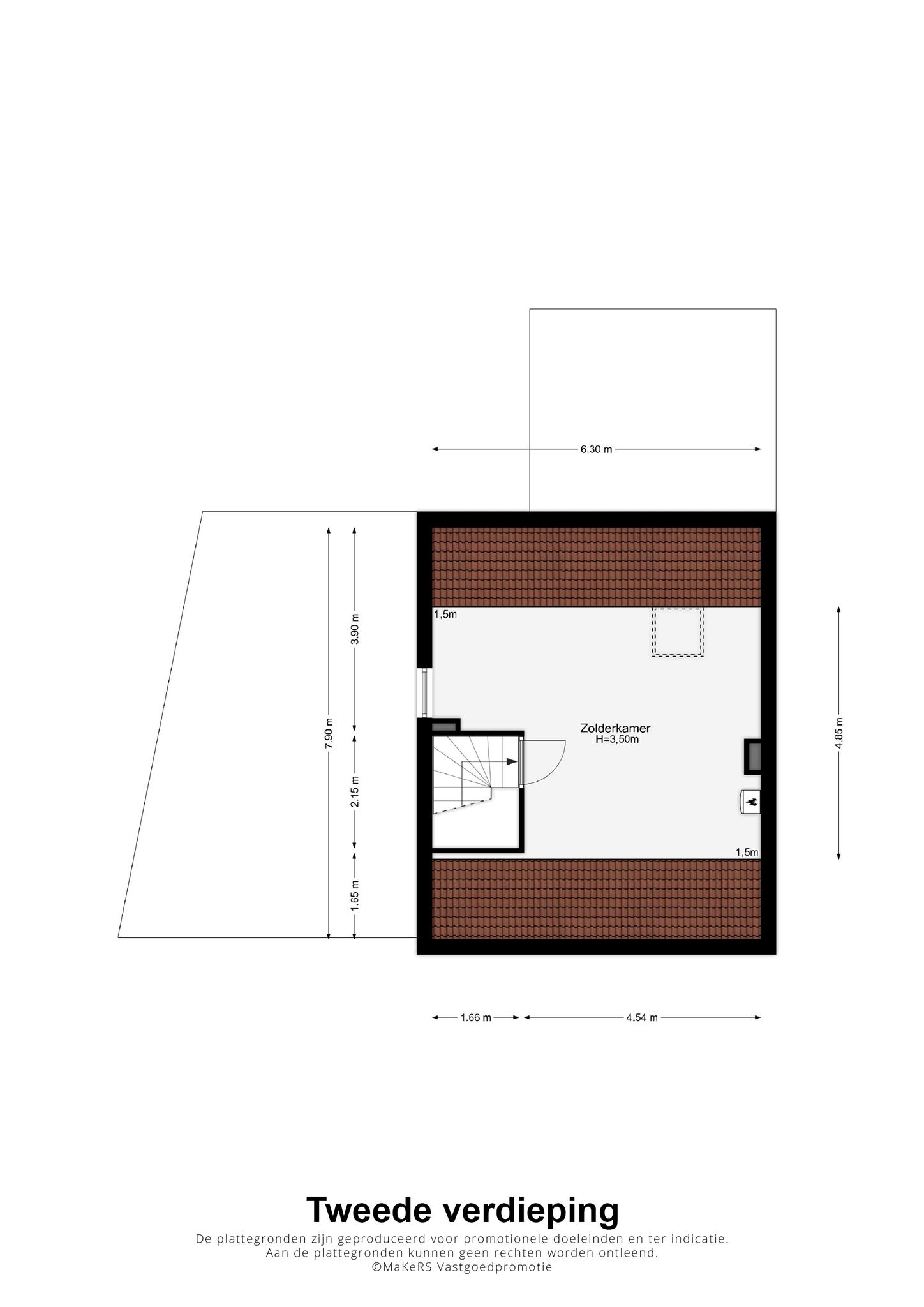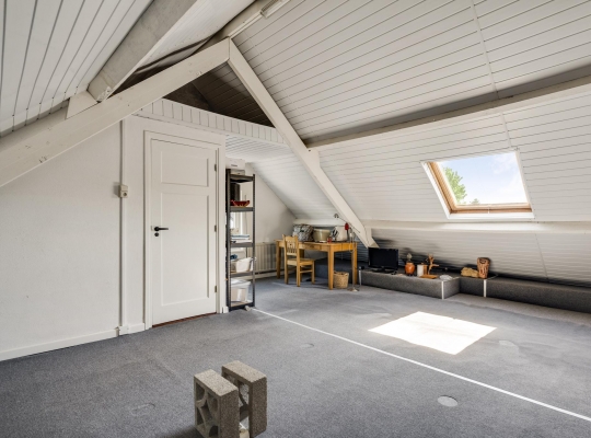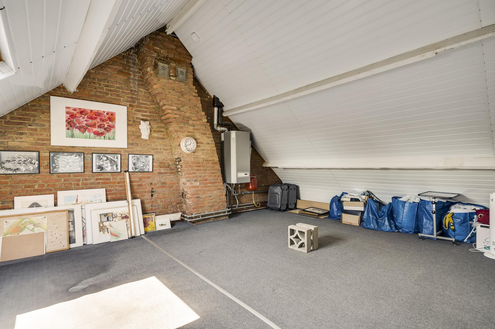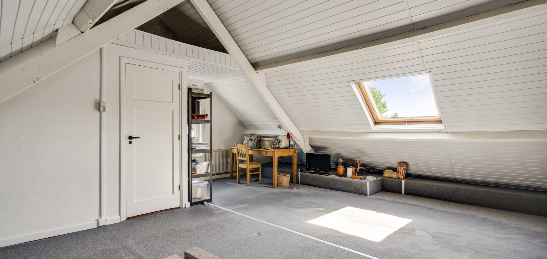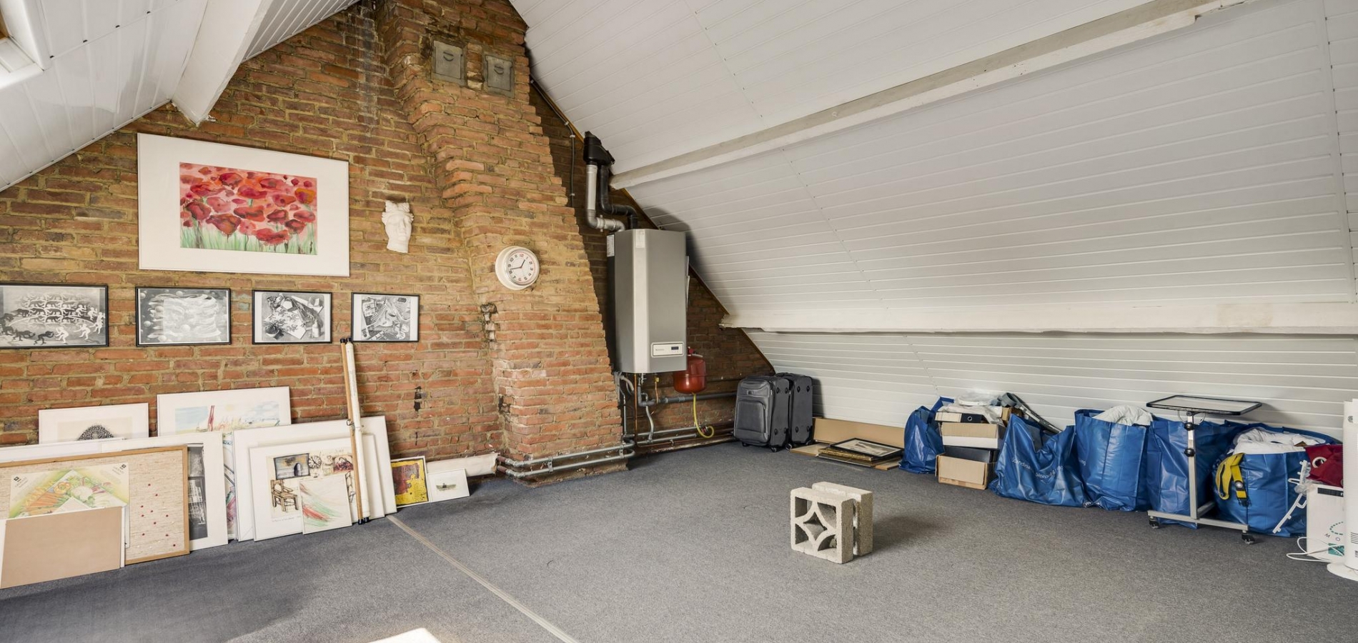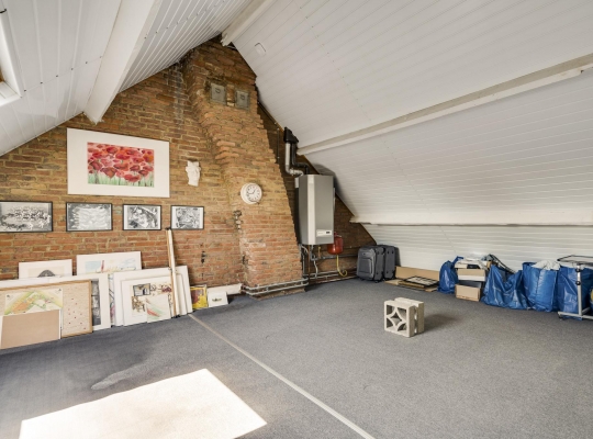 Een fraaie bordestrap geeft toegang tot de tweede verdieping waar u een overloop bereikt. Vanaf hier heeft u toegang tot een zeer grote, multifunctionele ruimte met een 3.50 meter hoge nok en een dakraam aan de achterzijde. Nu staat er een biljarttafel, maar een invulling met meerdere slaapkamers of een atelier/werkruimte is ook mogelijk. De opstelling van de HR-ketel (Daalderop, 2012, eigendom) is eveneens op deze verdieping.
