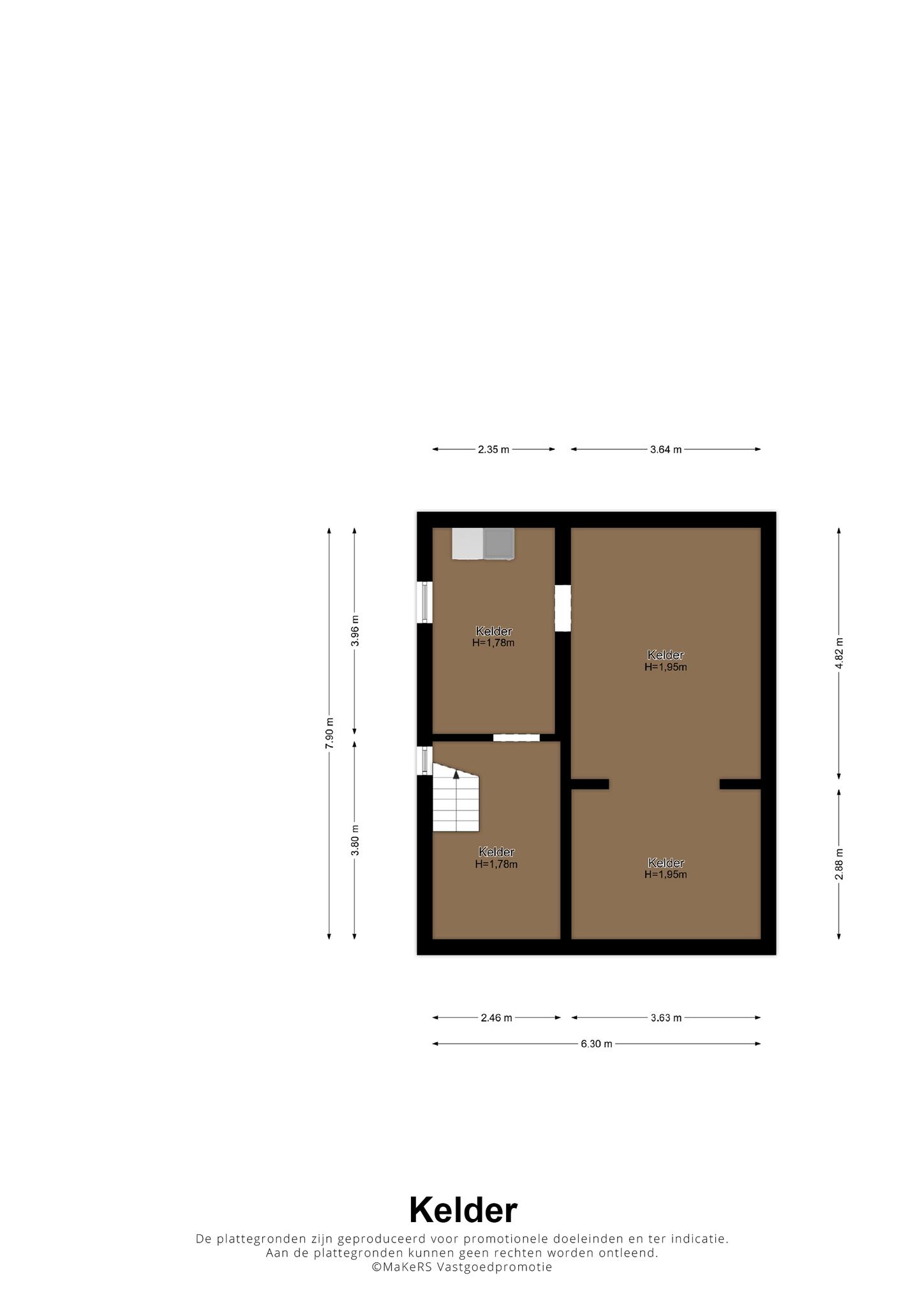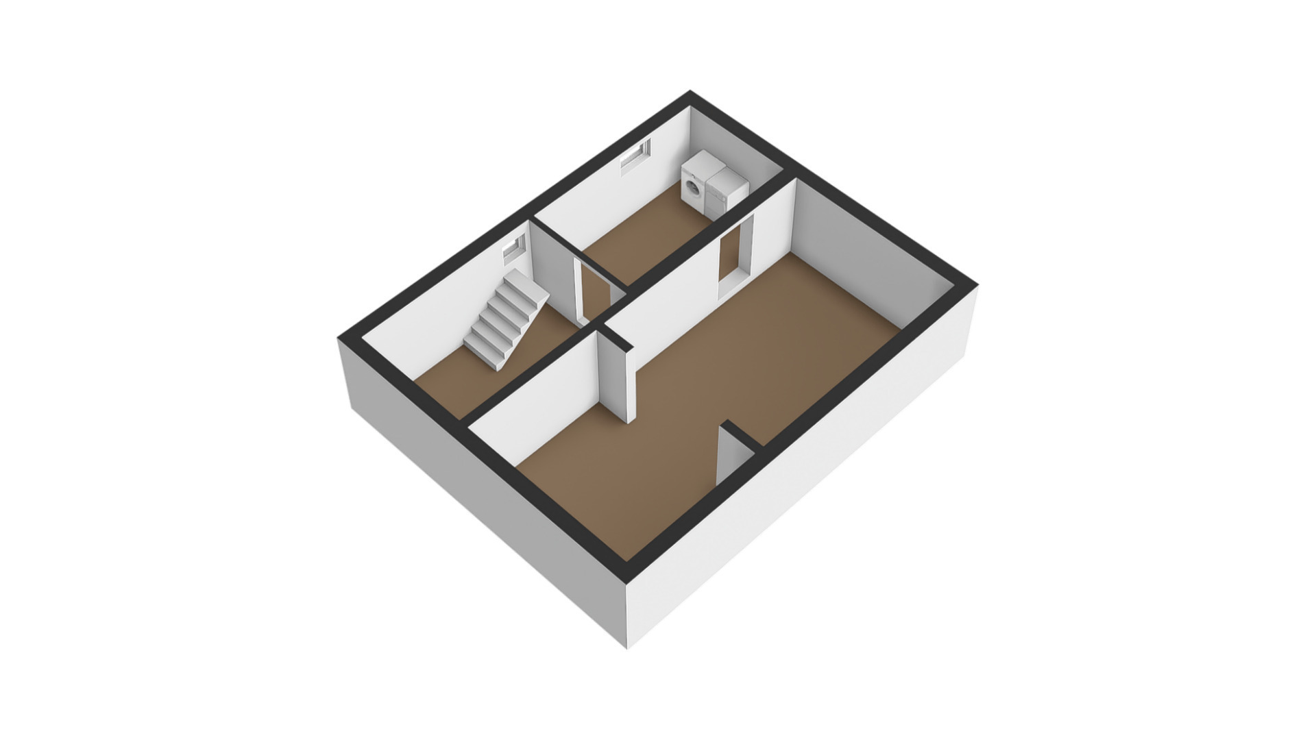 Een trap in de hal leidt naar het souterrain, waar drie grote ruimtes zijn. Kelder I (circa 7,90 x 3,63) heeft een hoogte van circa 1,95 meter en in kelder II (circa 3,96 x 2,35) is de opstelling van de wasapparatuur. Kelder III (circa 3,80 x 2,46) is de plek waar de trap naar de begane grond is.