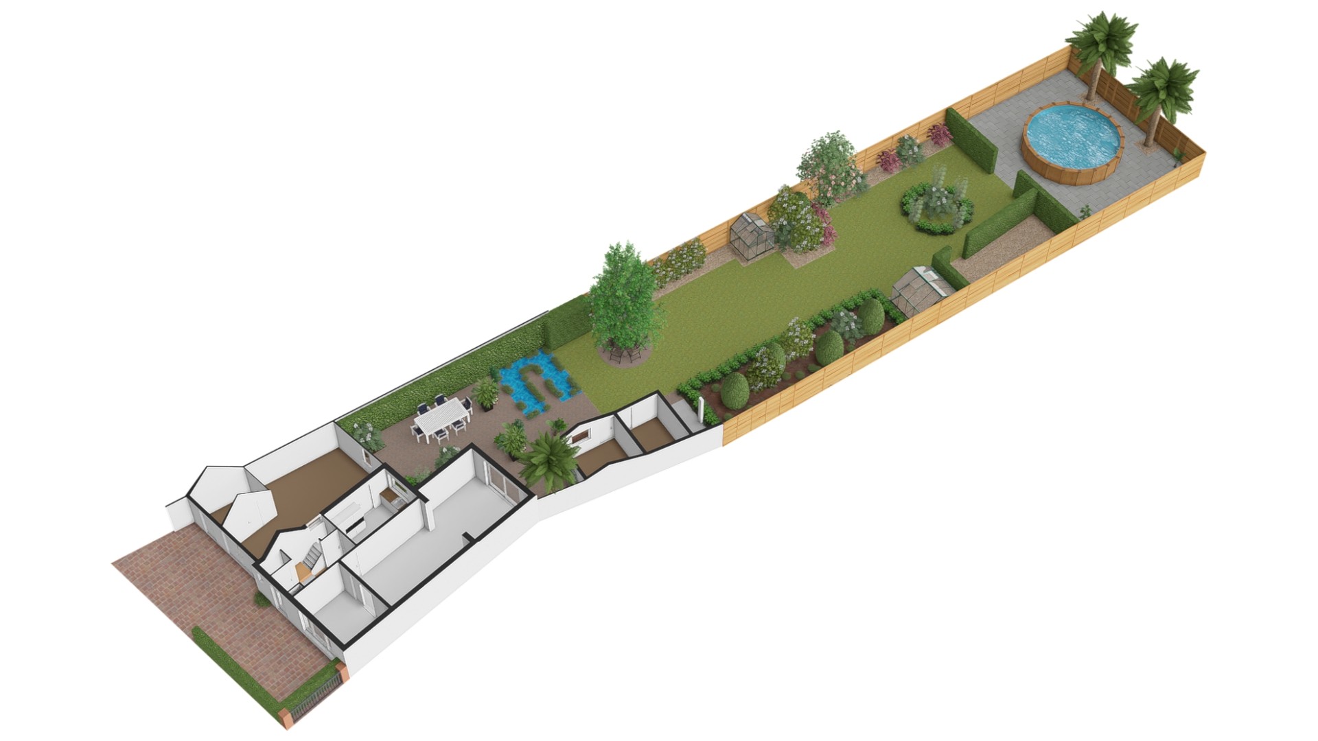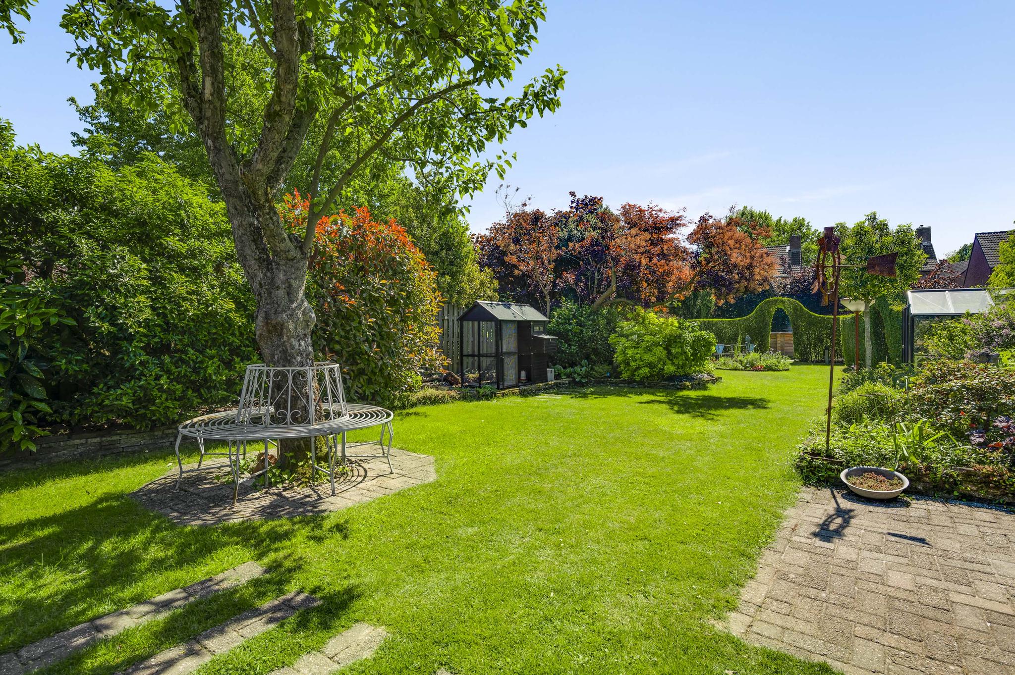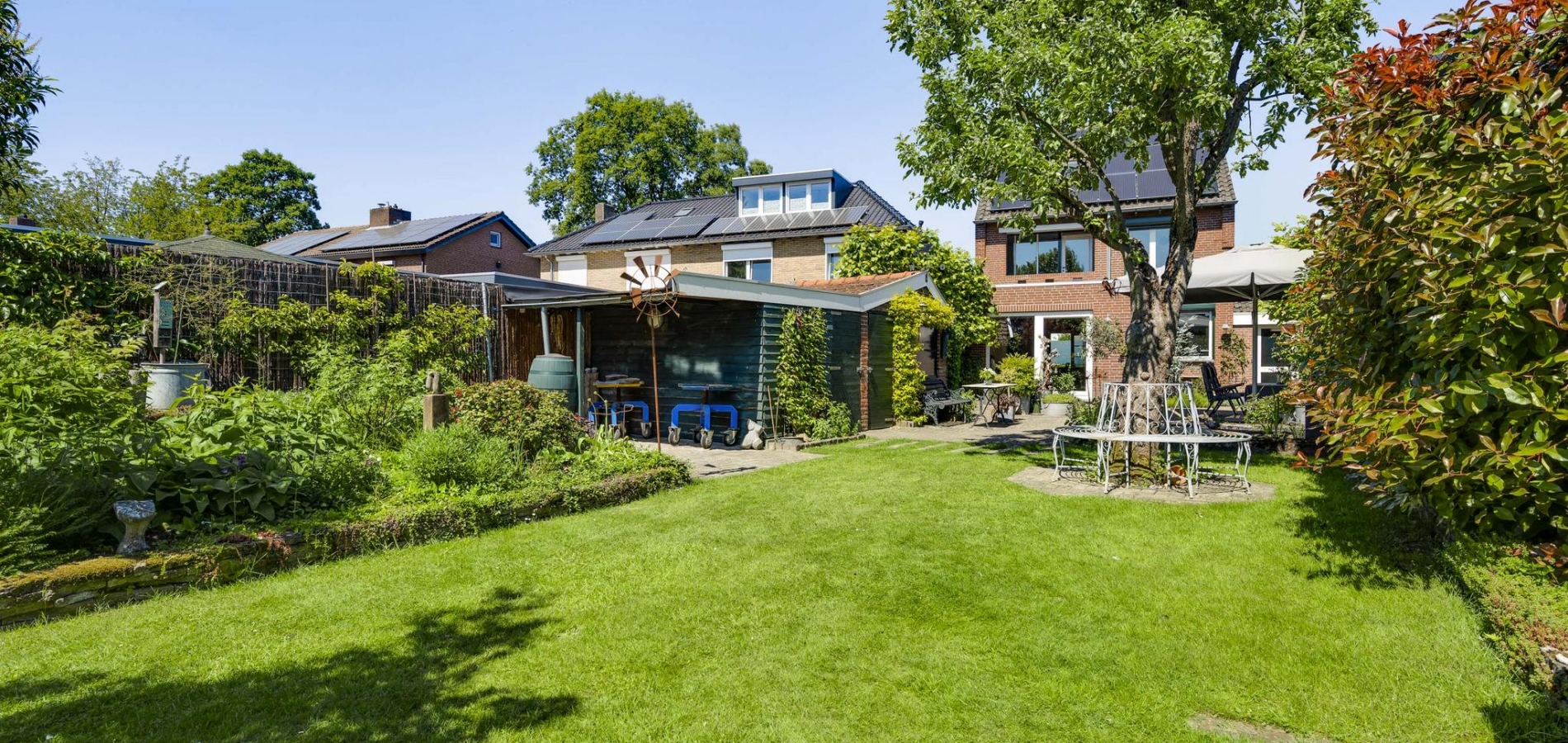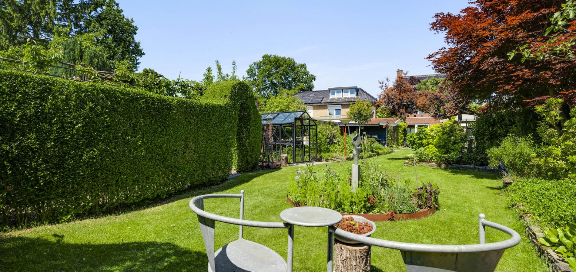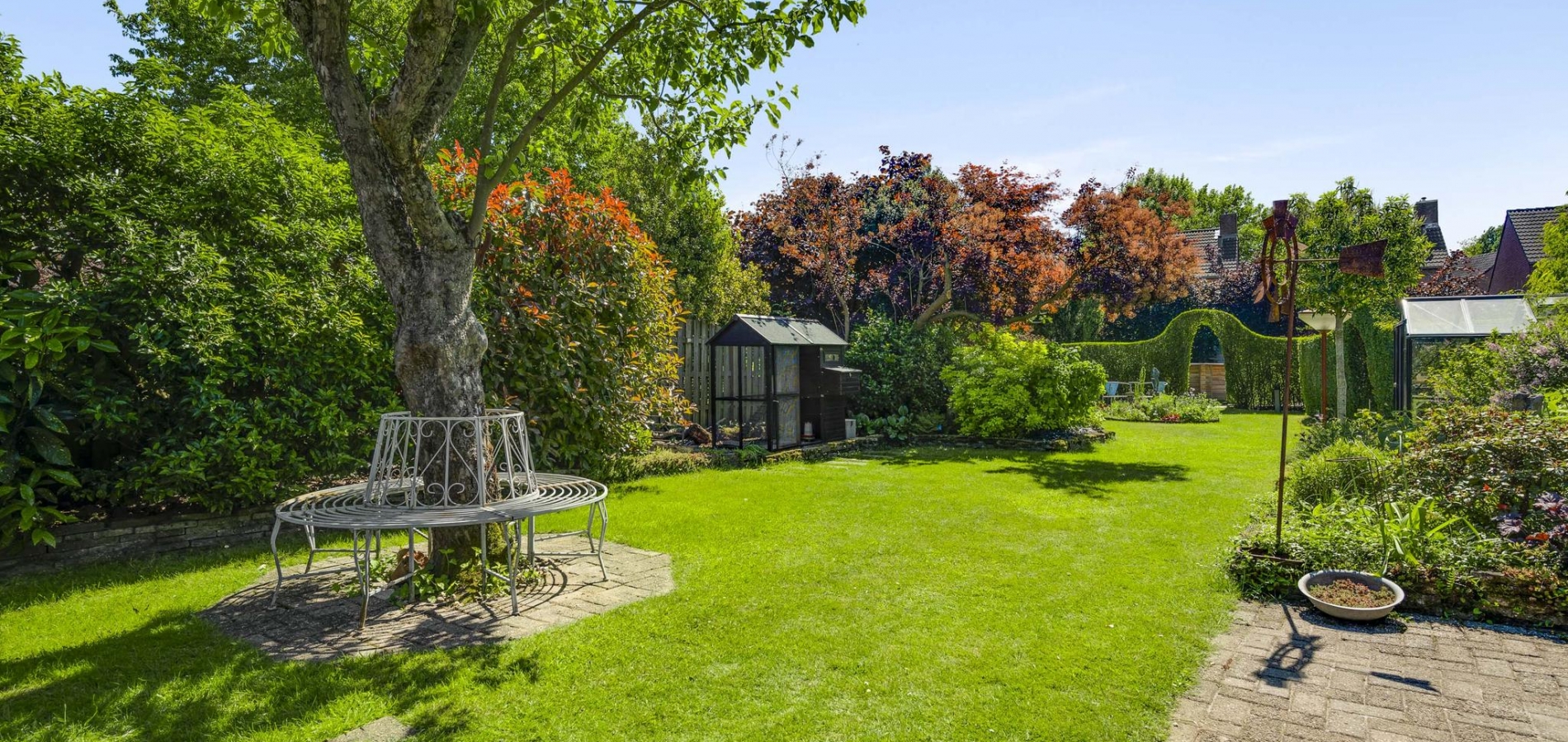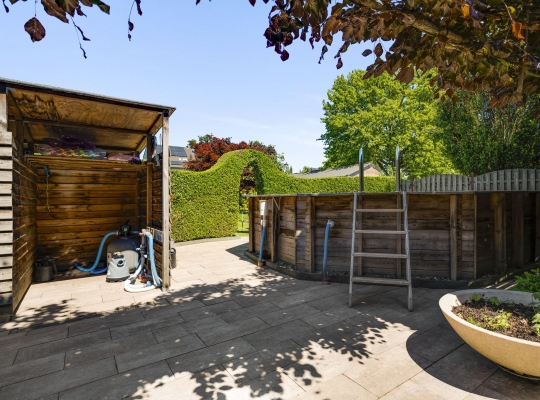 Vanuit de woonkamer en garage is de zeer diepe achtertuin op het zuiden te bereiken. Hier ziet u veel groen, een U-vormige vijver, meerdere terrassen, mooie bomen en een gazon. Er zijn bergingen voor het tuingereedschap en verder zijn er een overkapping, kas en… een groot zwembad met verwarming middels een warmtepomp voor urenlang waterplezier!