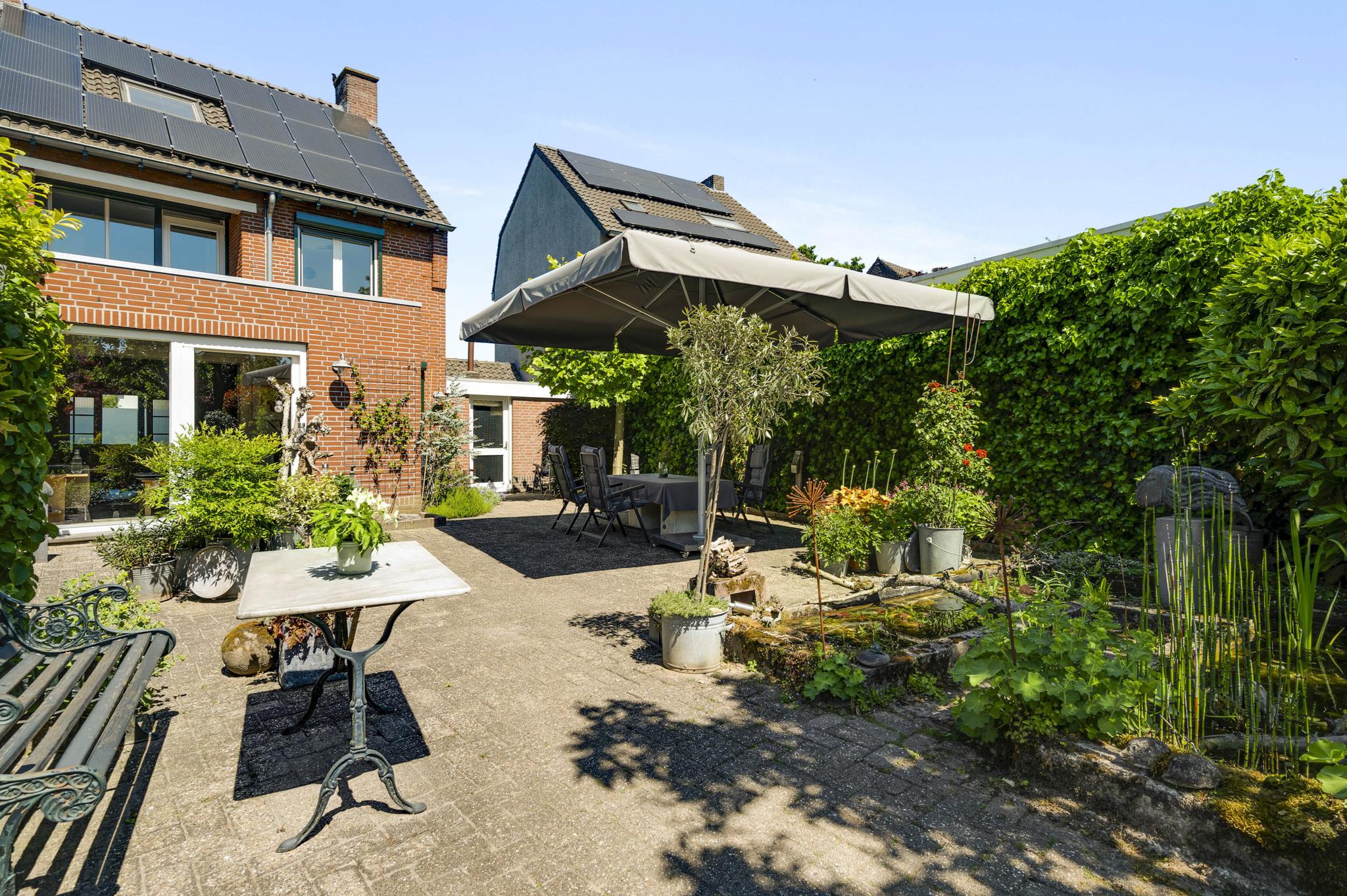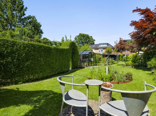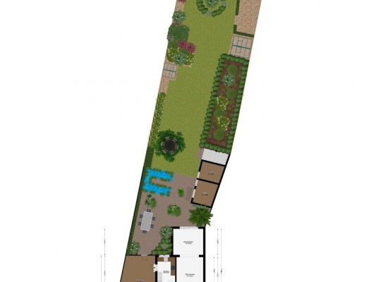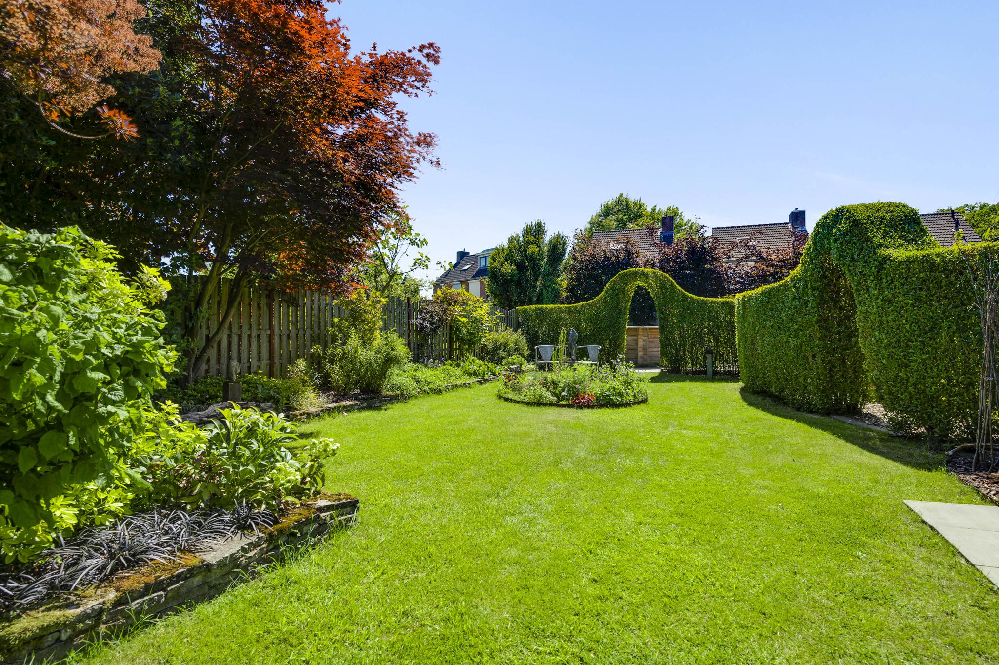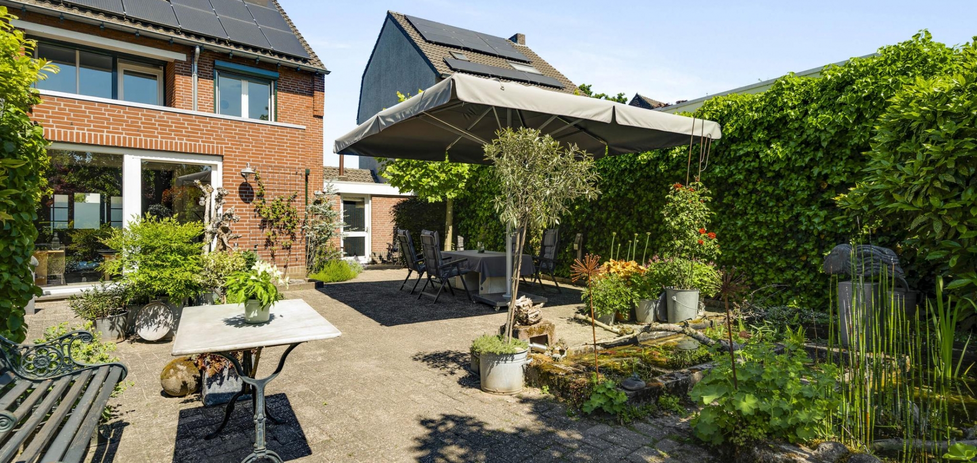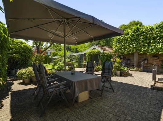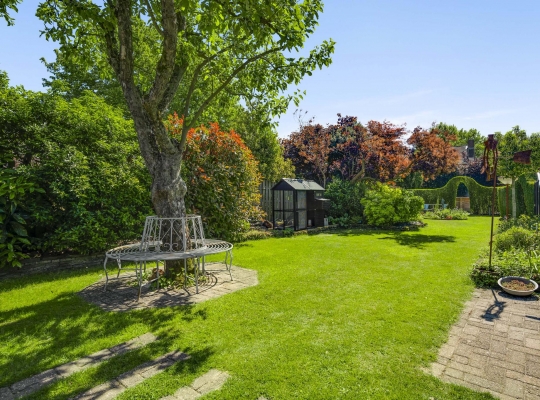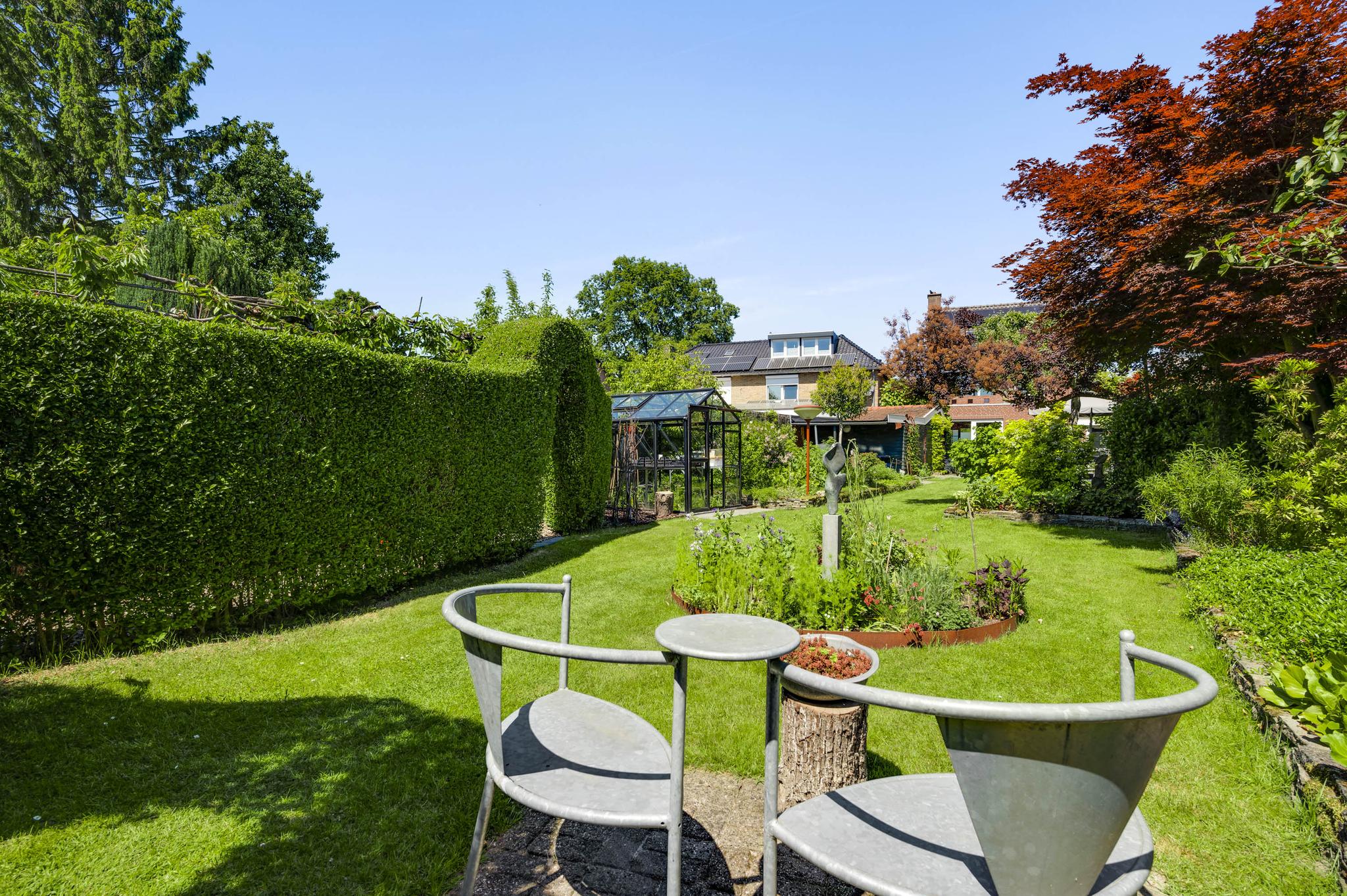 Vanuit de woonkamer en garage is de zeer diepe achtertuin op het zuiden te bereiken. Hier ziet u veel groen, een U-vormige vijver, meerdere terrassen, mooie bomen en een gazon. Er zijn bergingen voor het tuingereedschap en verder zijn er een overkapping, kas en… een groot zwembad met verwarming middels een warmtepomp voor urenlang waterplezier!