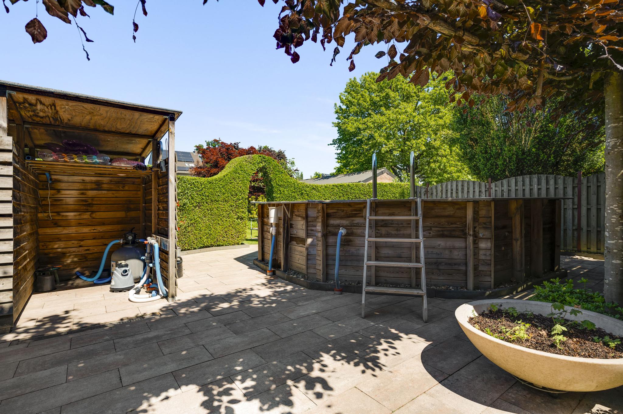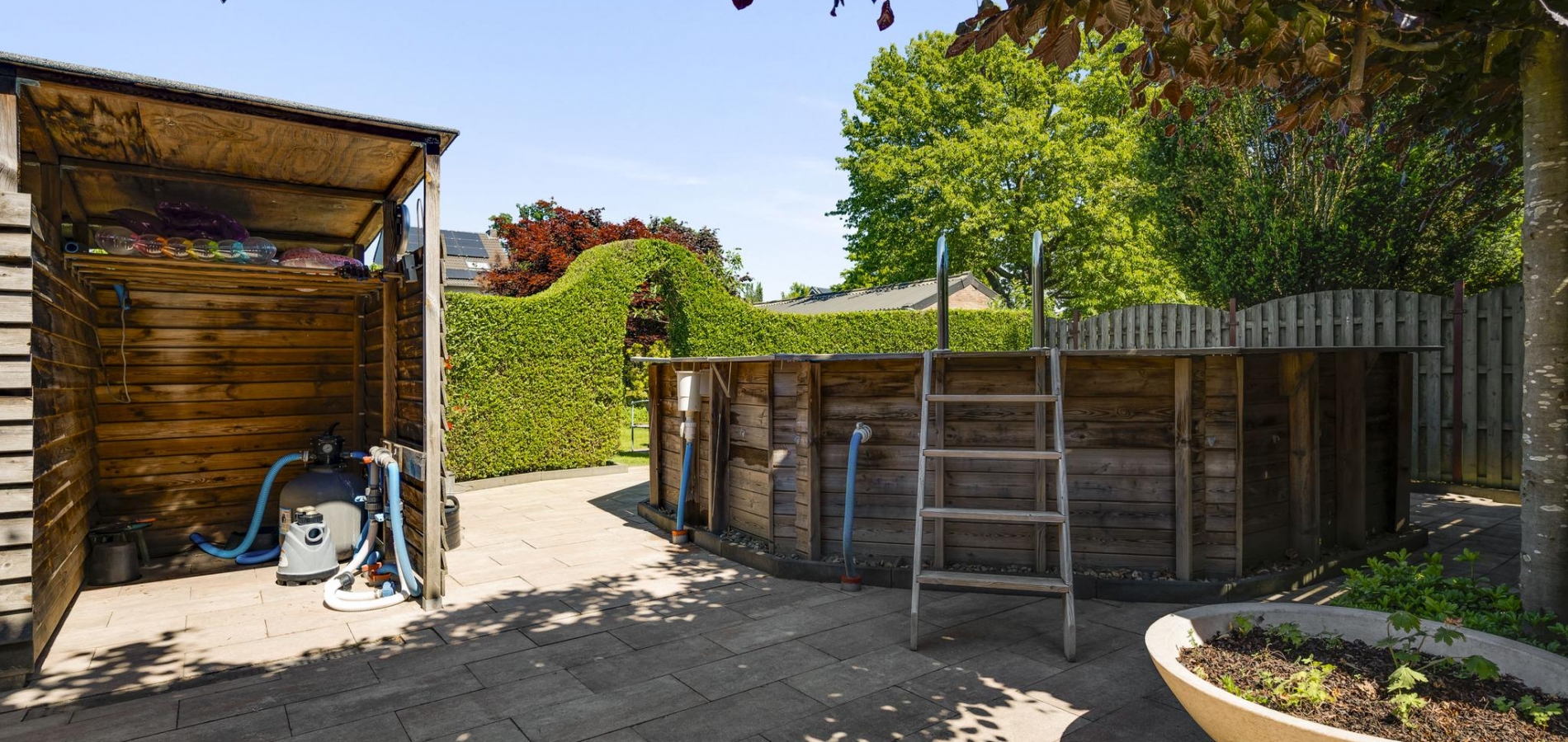 Naast het zwembad staat een houten “poolhouse” met omkleedgelegenheid en een ruimte voor de pomp, filter, warmtepomp en chloorregelaar.
