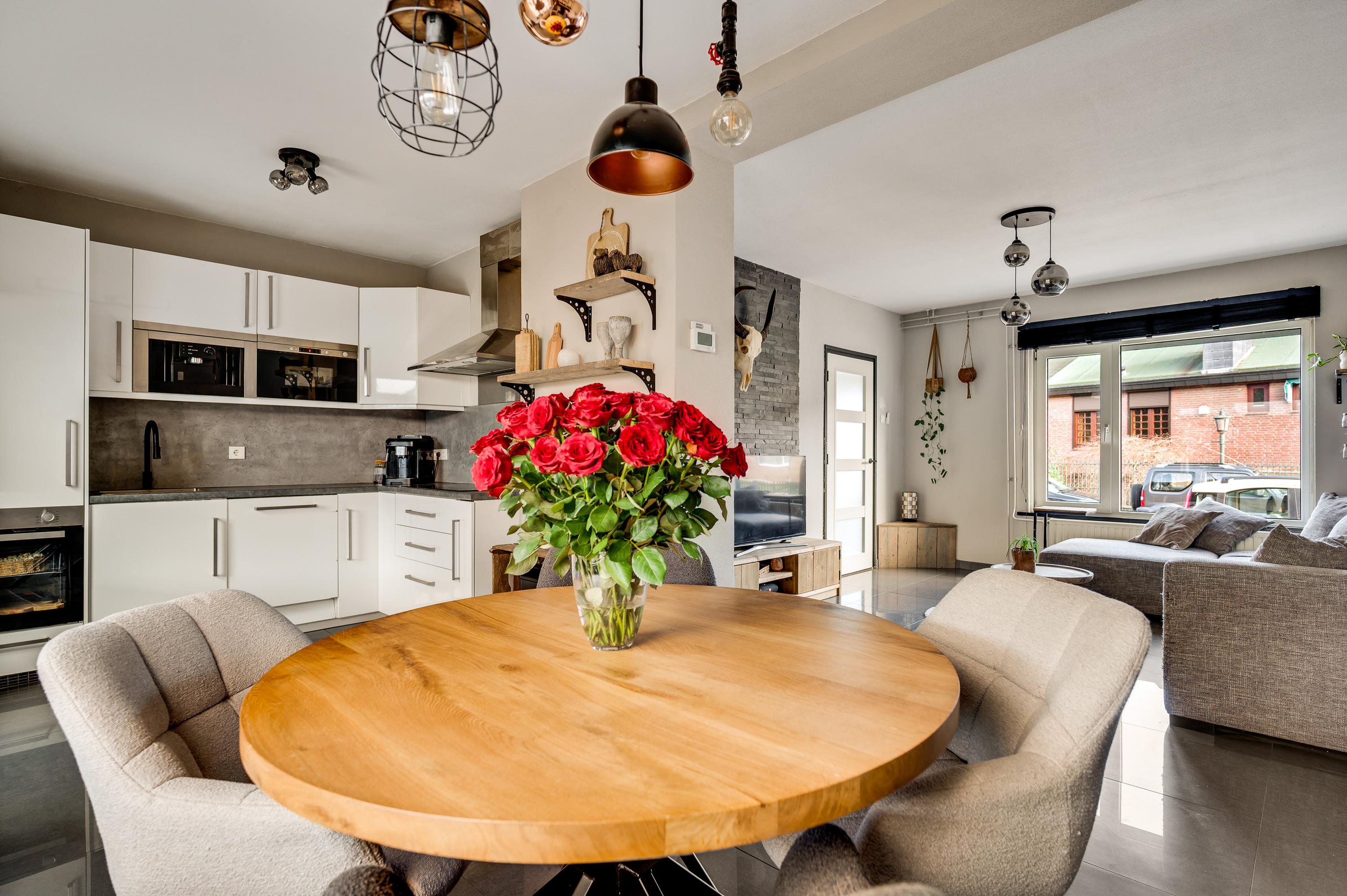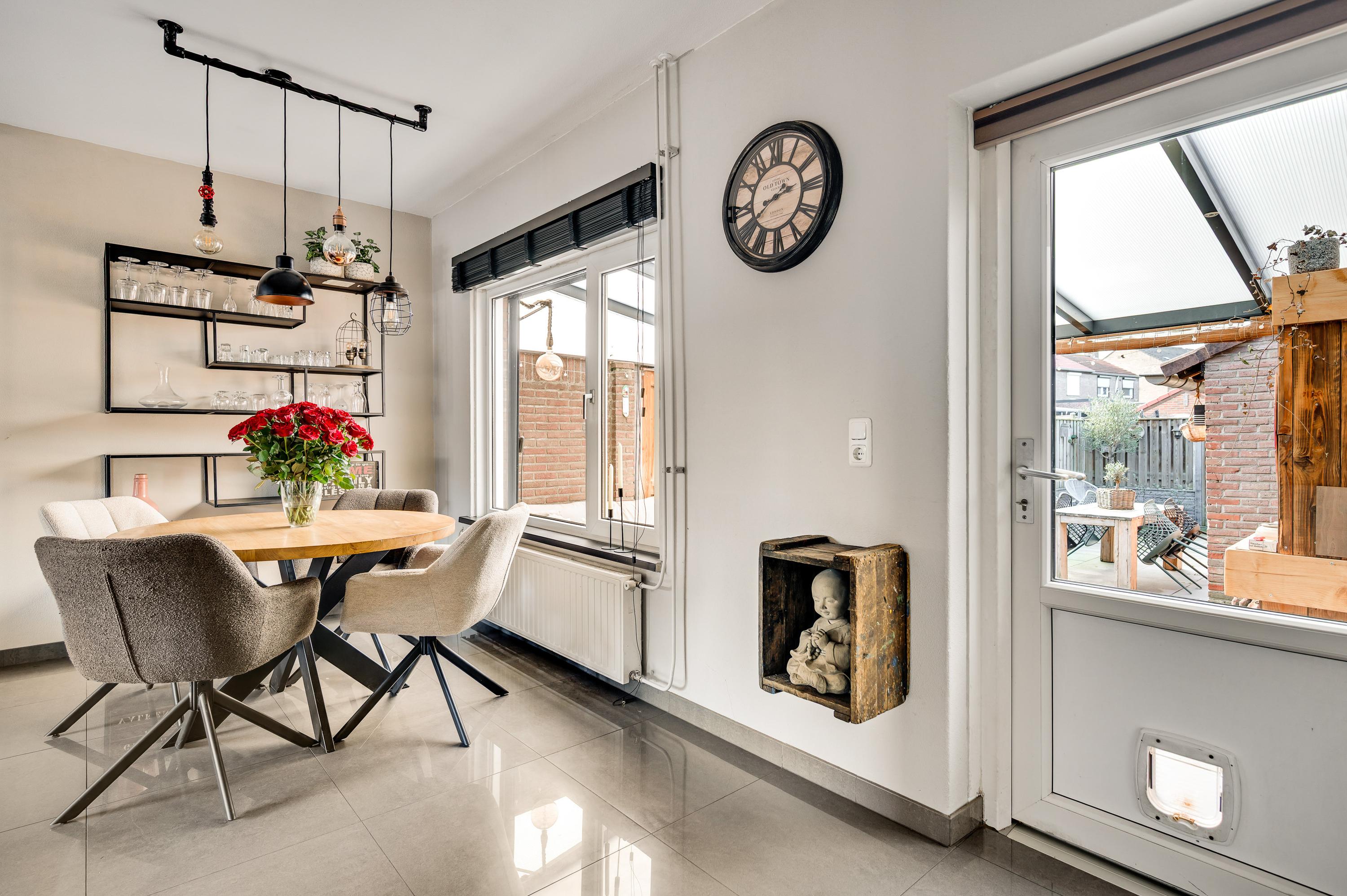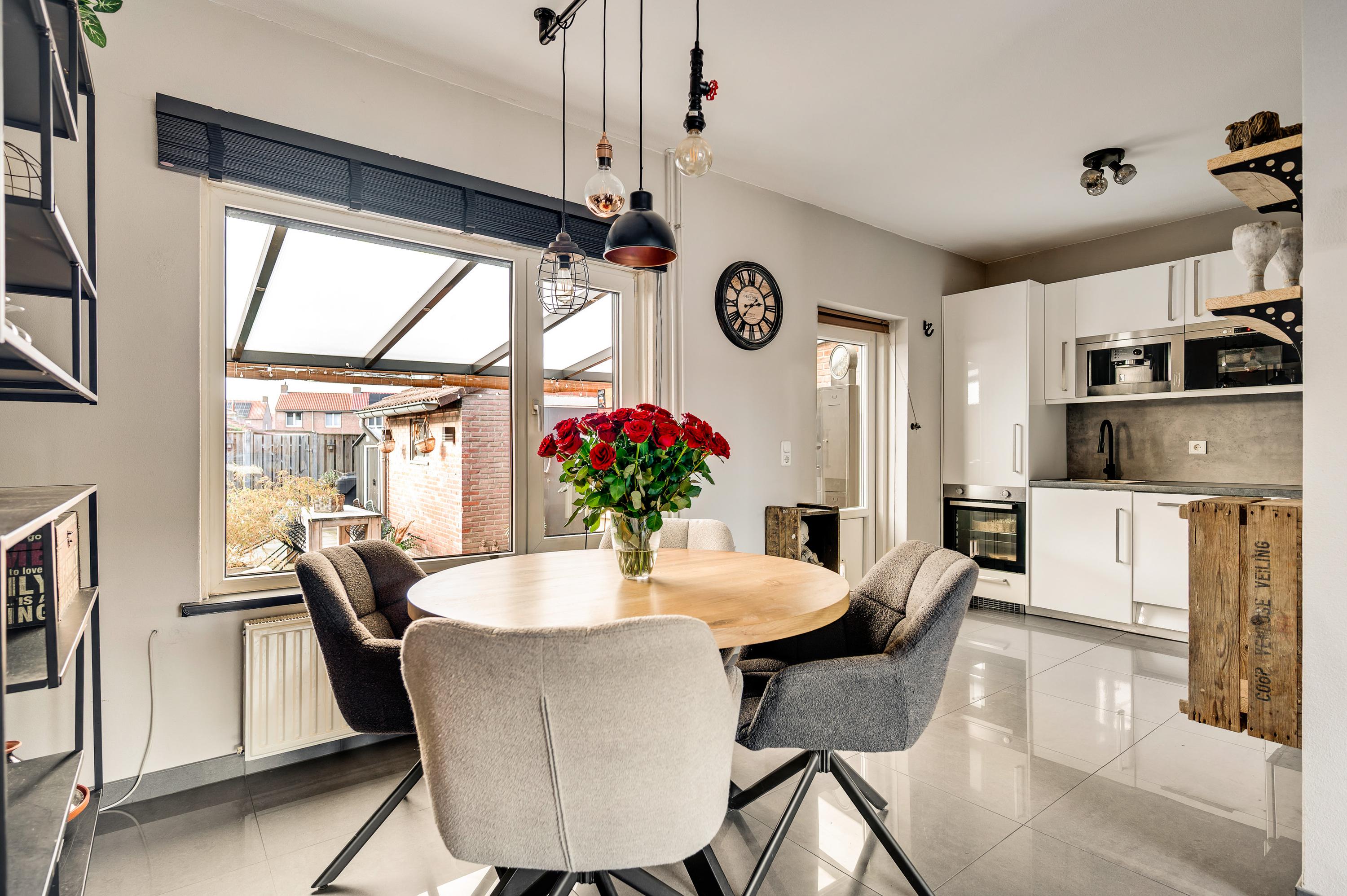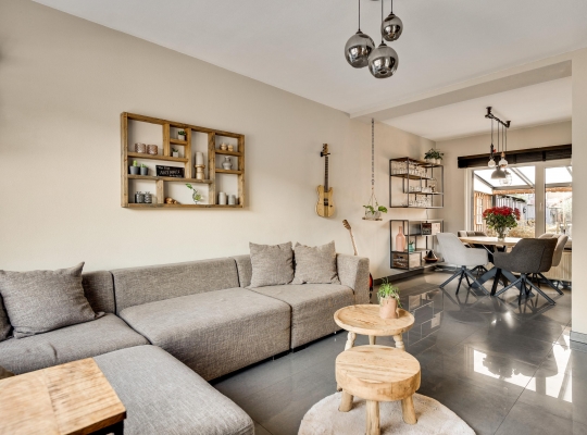 De woonkamer (circa 6,94 x 3,70) is het toppunt van sfeer, mede dankzij de achterwand bij het zitgedeelte. De stijlvolle tegelvloer past perfect in het geheel en door de grote ramen valt veel licht naar binnen. Het zitgedeelte is aan de voorzijde en het eetgedeelte vindt u aan de achterzijde, naast de keuken.