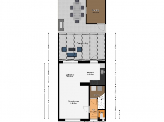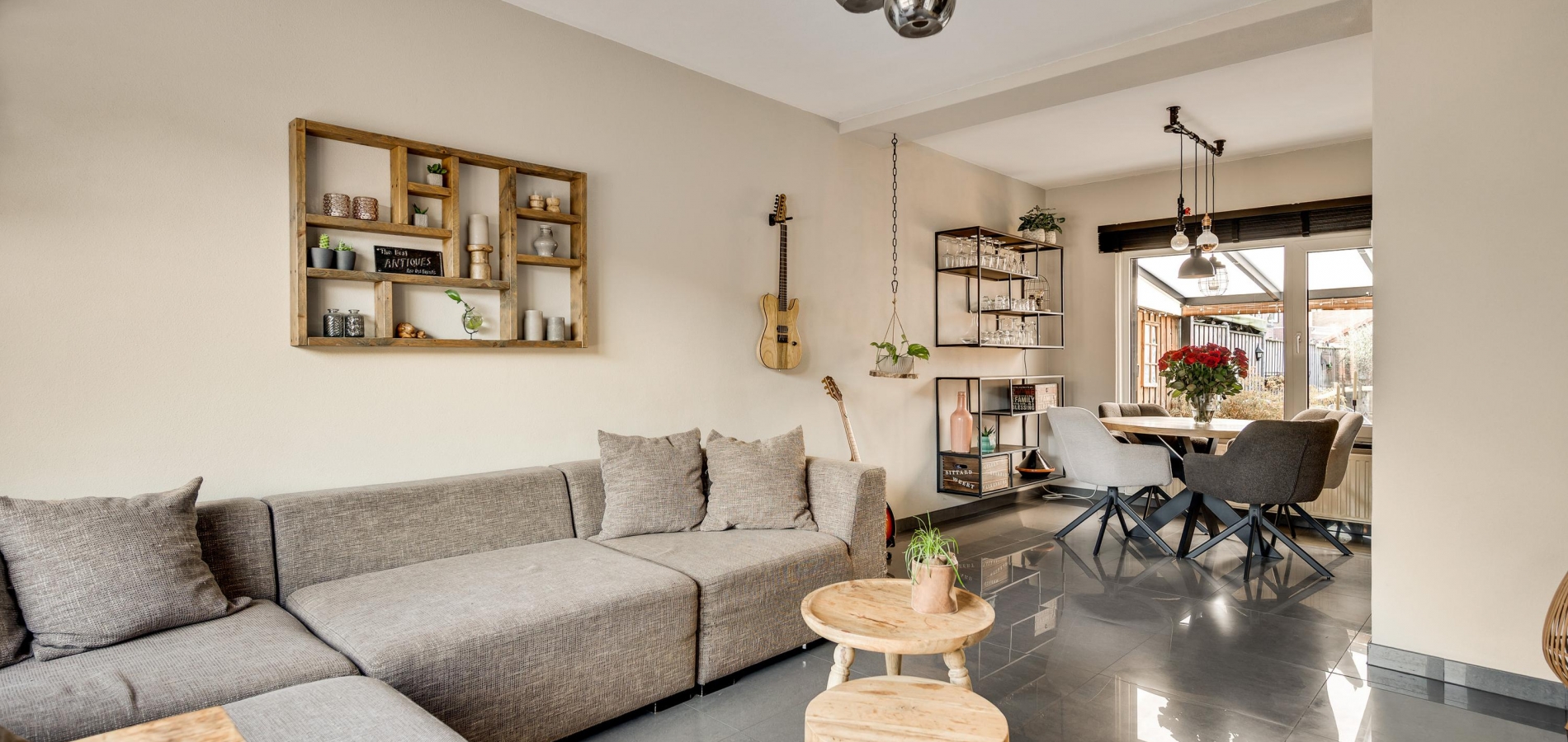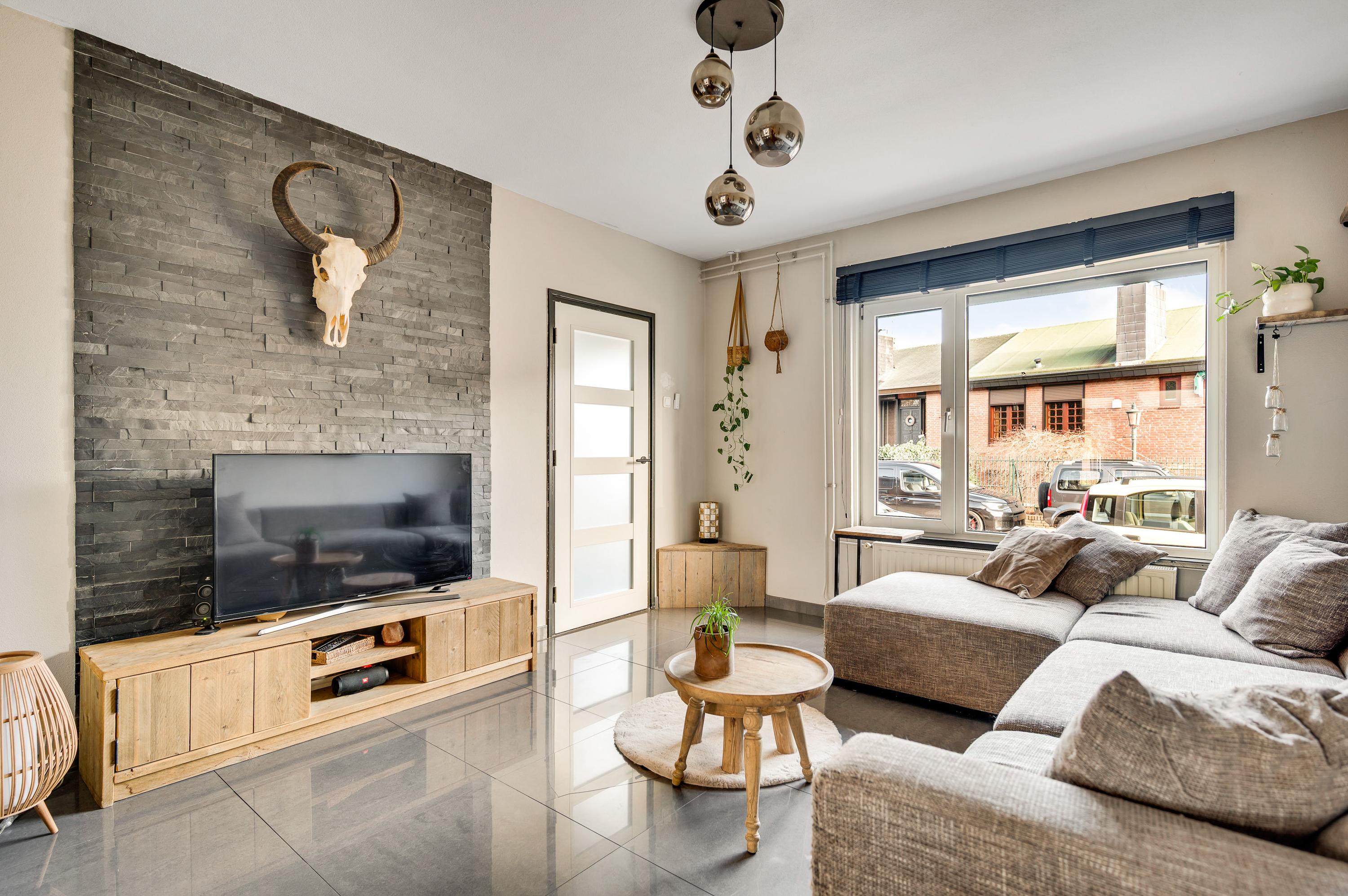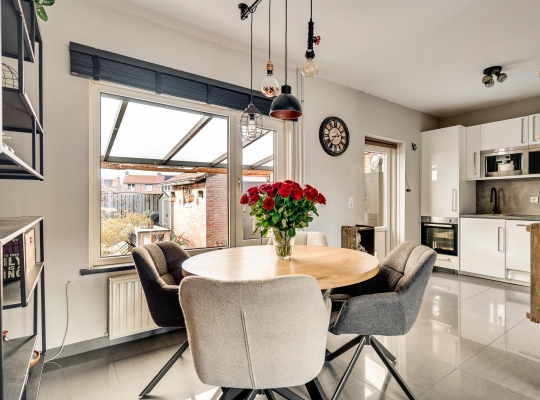 De woonkamer (circa 6,94 x 3,70) is het toppunt van sfeer, mede dankzij de achterwand bij het zitgedeelte. De stijlvolle tegelvloer past perfect in het geheel en door de grote ramen valt veel licht naar binnen. Het zitgedeelte is aan de voorzijde en het eetgedeelte vindt u aan de achterzijde, naast de keuken.