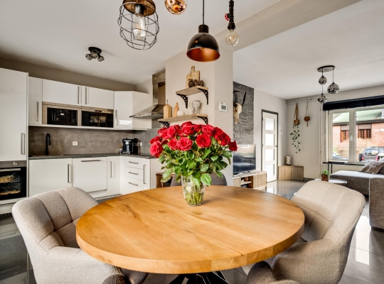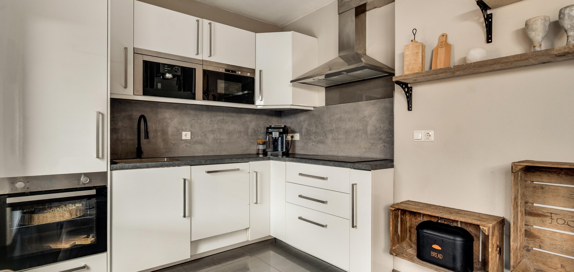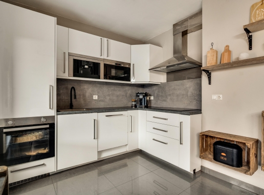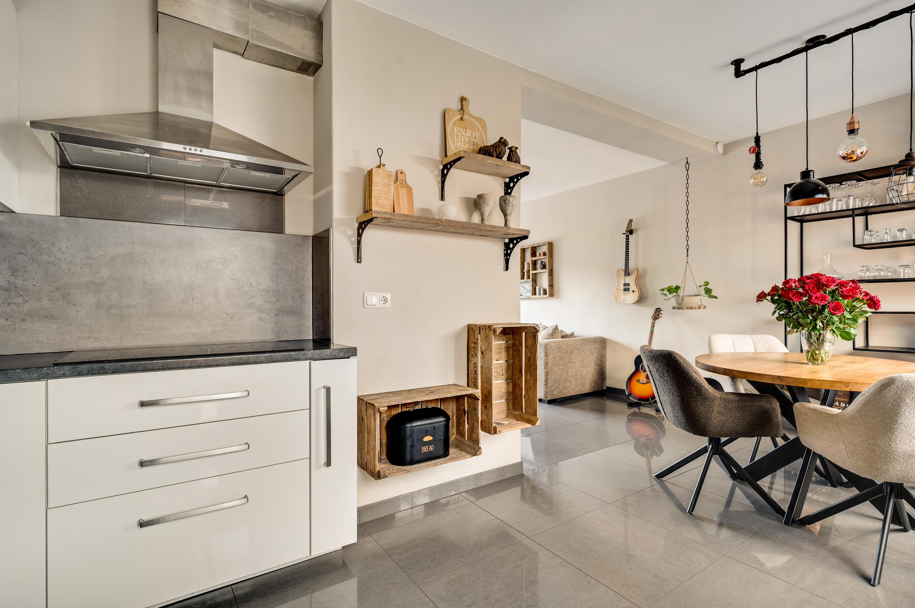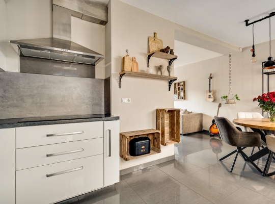 Het eetgedeelte staat in open verbinding met de keuken (circa 2,71 x 1,87), wat het gevoel van een eetkeuken oproept. De lichte hoekopstelling heeft een aanrechtblad en achterwand in dezelfde stijl, die de keuken een stoere uitstraling geven. Alle benodigde apparatuur is ingebouwd: een inductie kookplaat, afzuigkap, vaatwasser, oven, magnetron, koffiemachine en een koelkast.