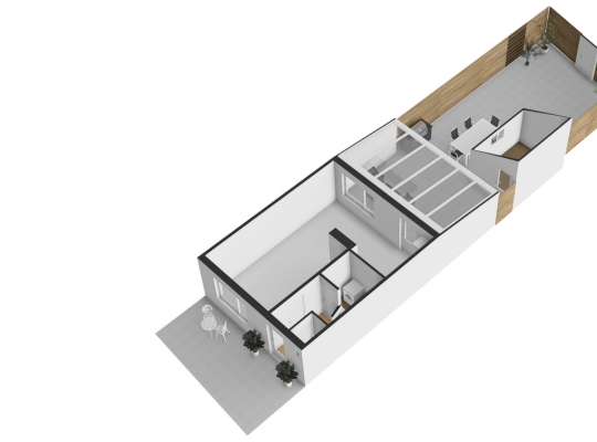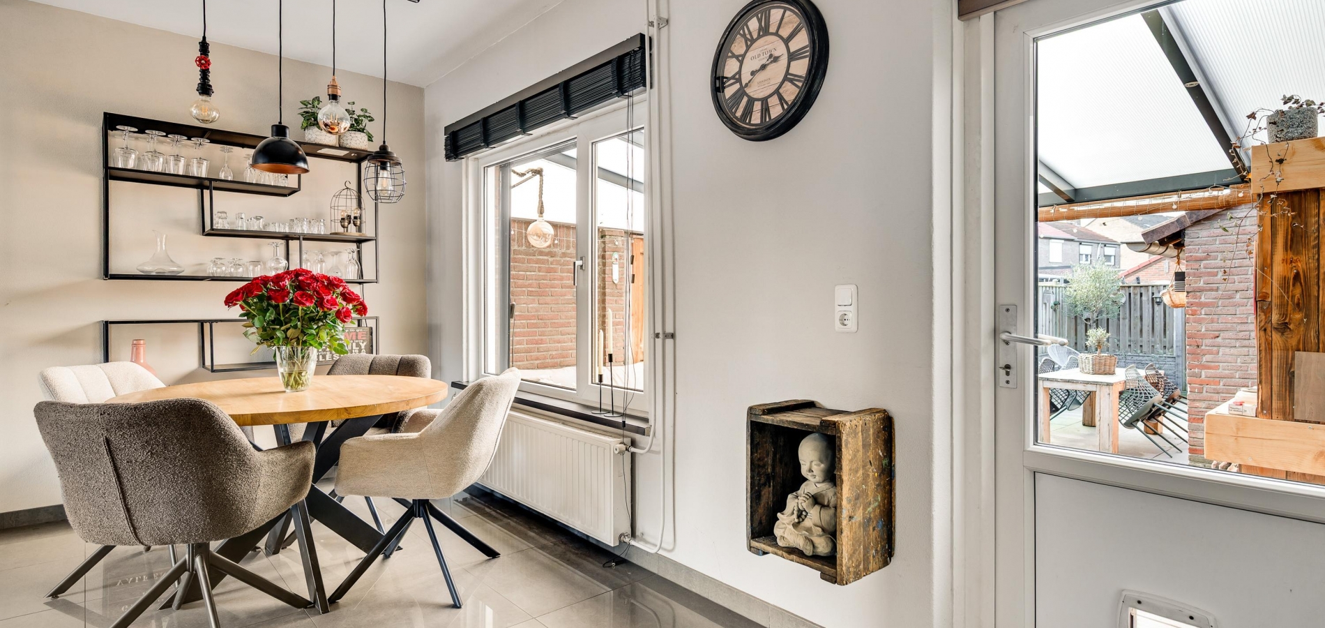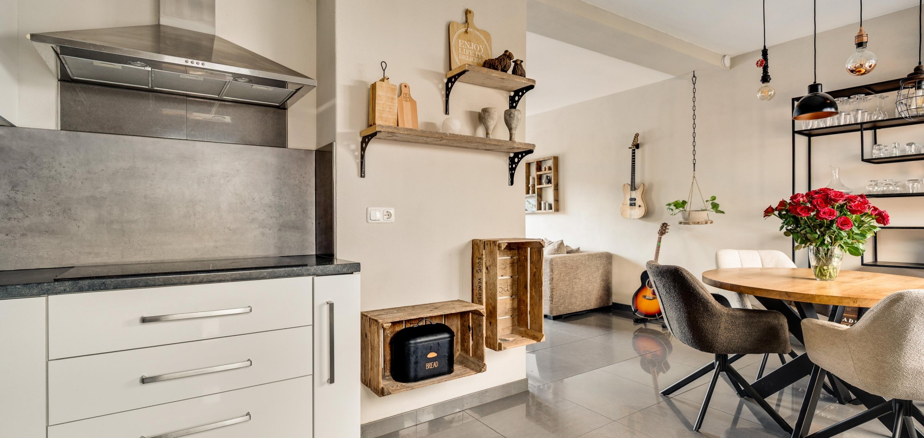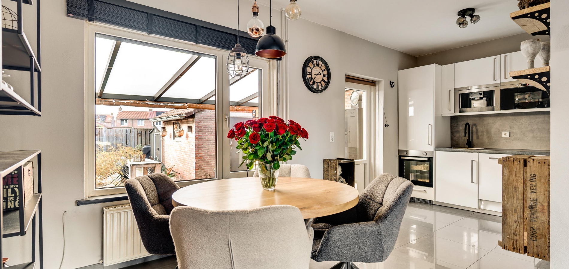 Het eetgedeelte staat in open verbinding met de keuken (circa 2,71 x 1,87), wat het gevoel van een eetkeuken oproept. De lichte hoekopstelling heeft een aanrechtblad en achterwand in dezelfde stijl, die de keuken een stoere uitstraling geven. Alle benodigde apparatuur is ingebouwd: een inductie kookplaat, afzuigkap, vaatwasser, oven, magnetron, koffiemachine en een koelkast.