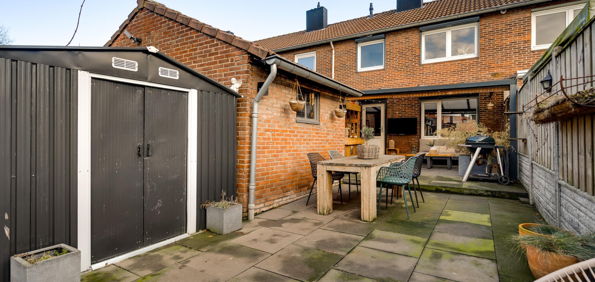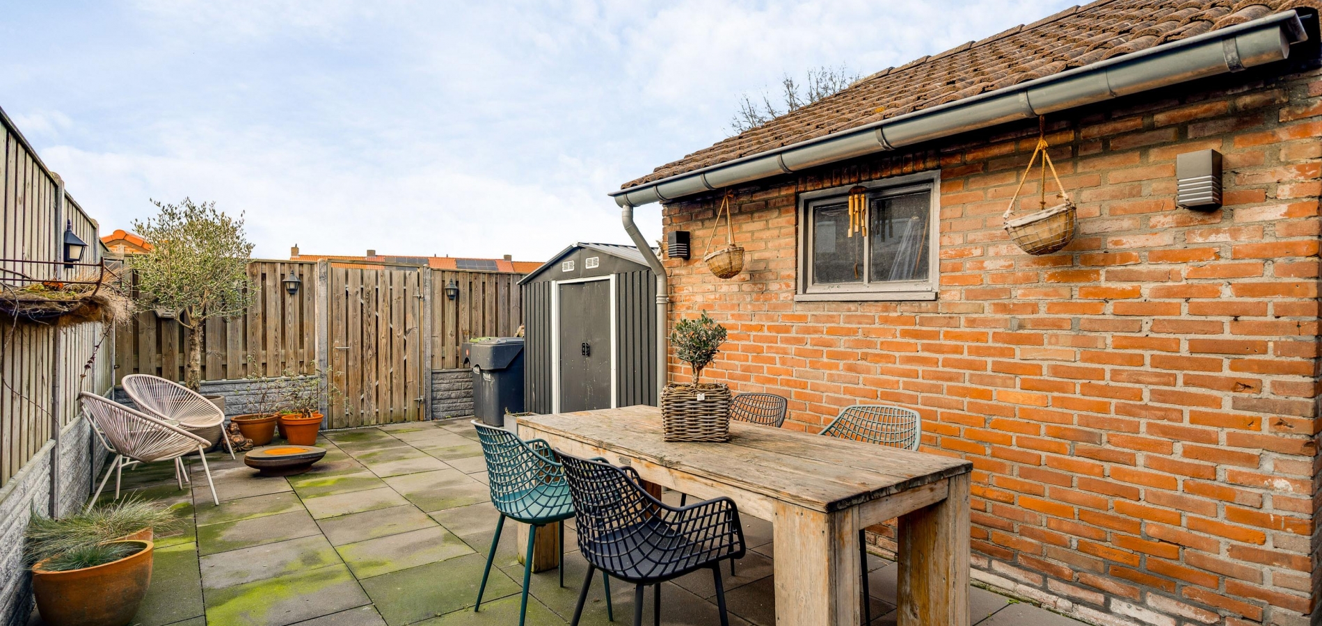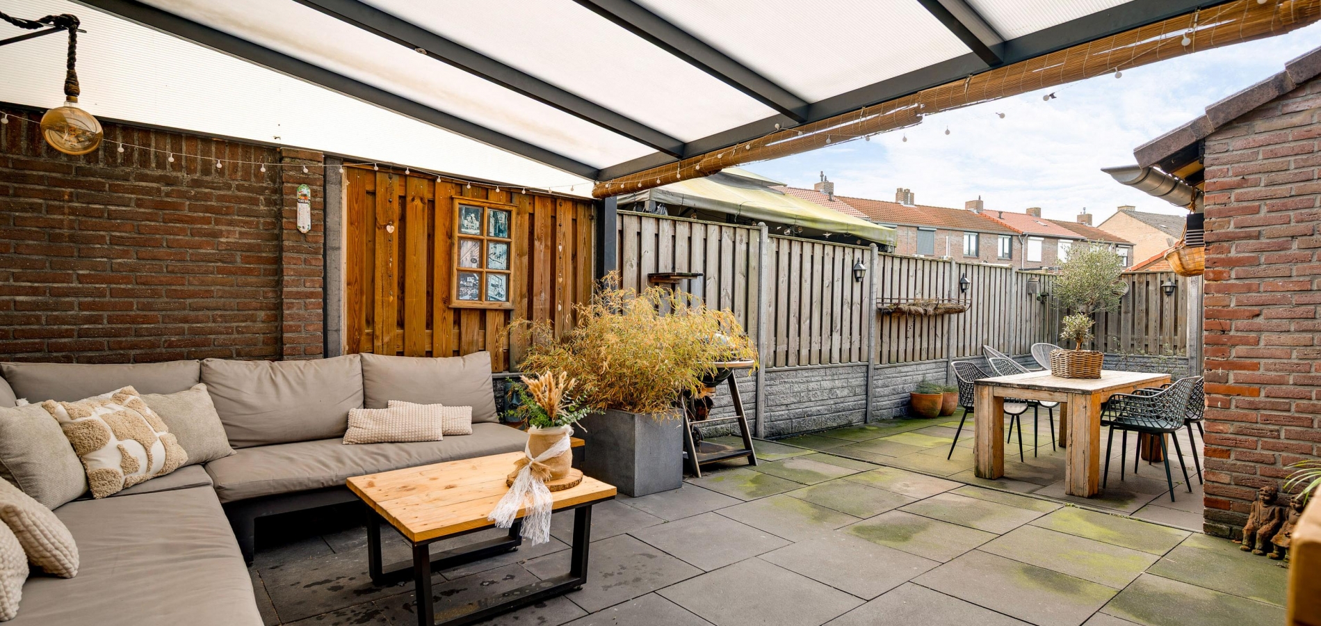 Onderhoudsvriendelijke tuin met een overdekt terras, berging en achterom