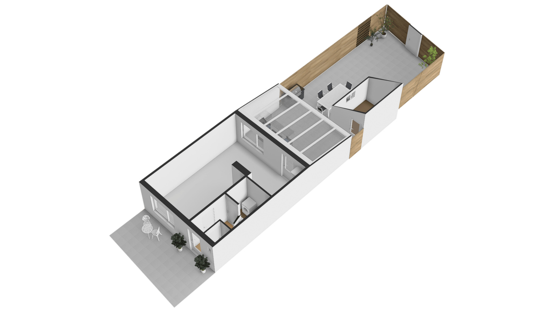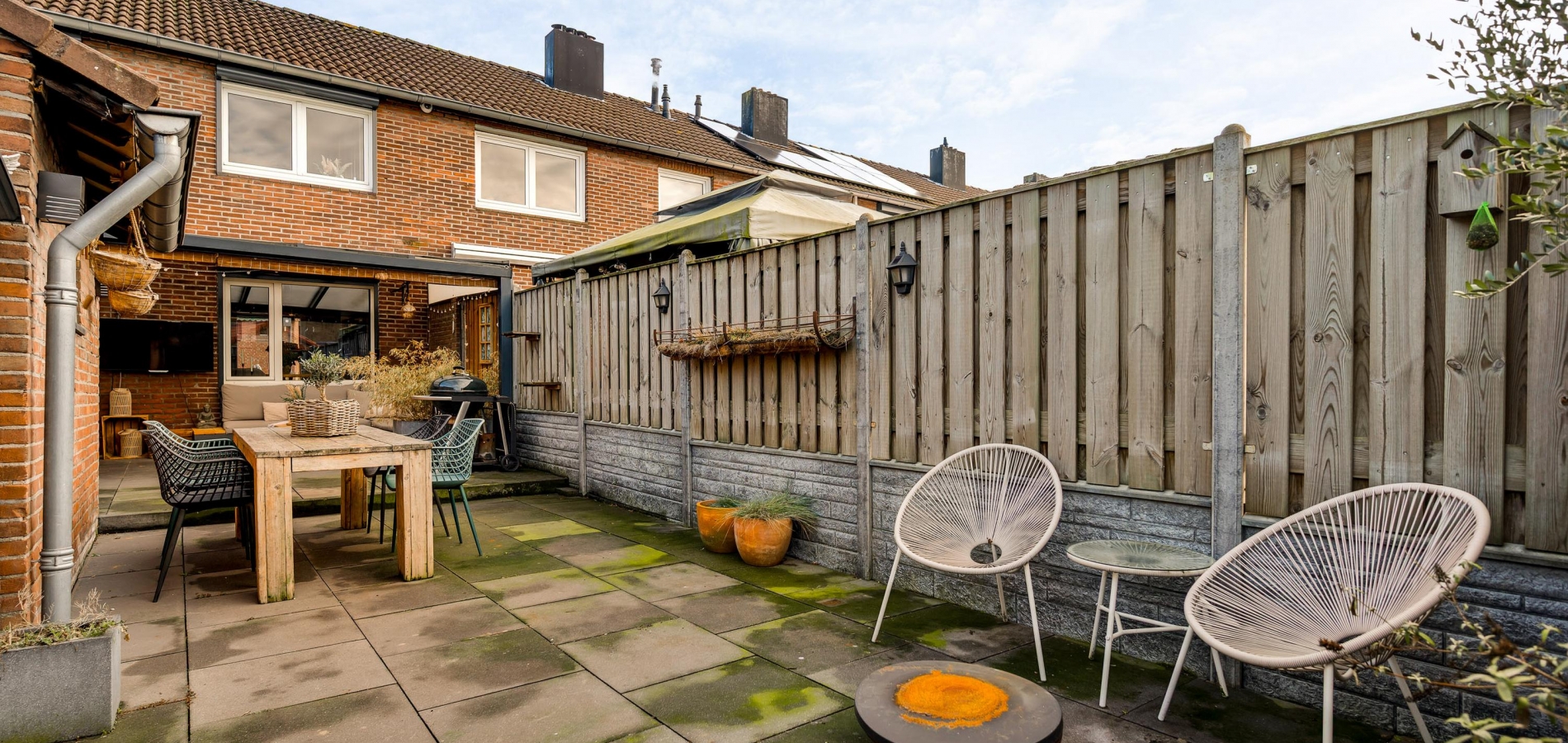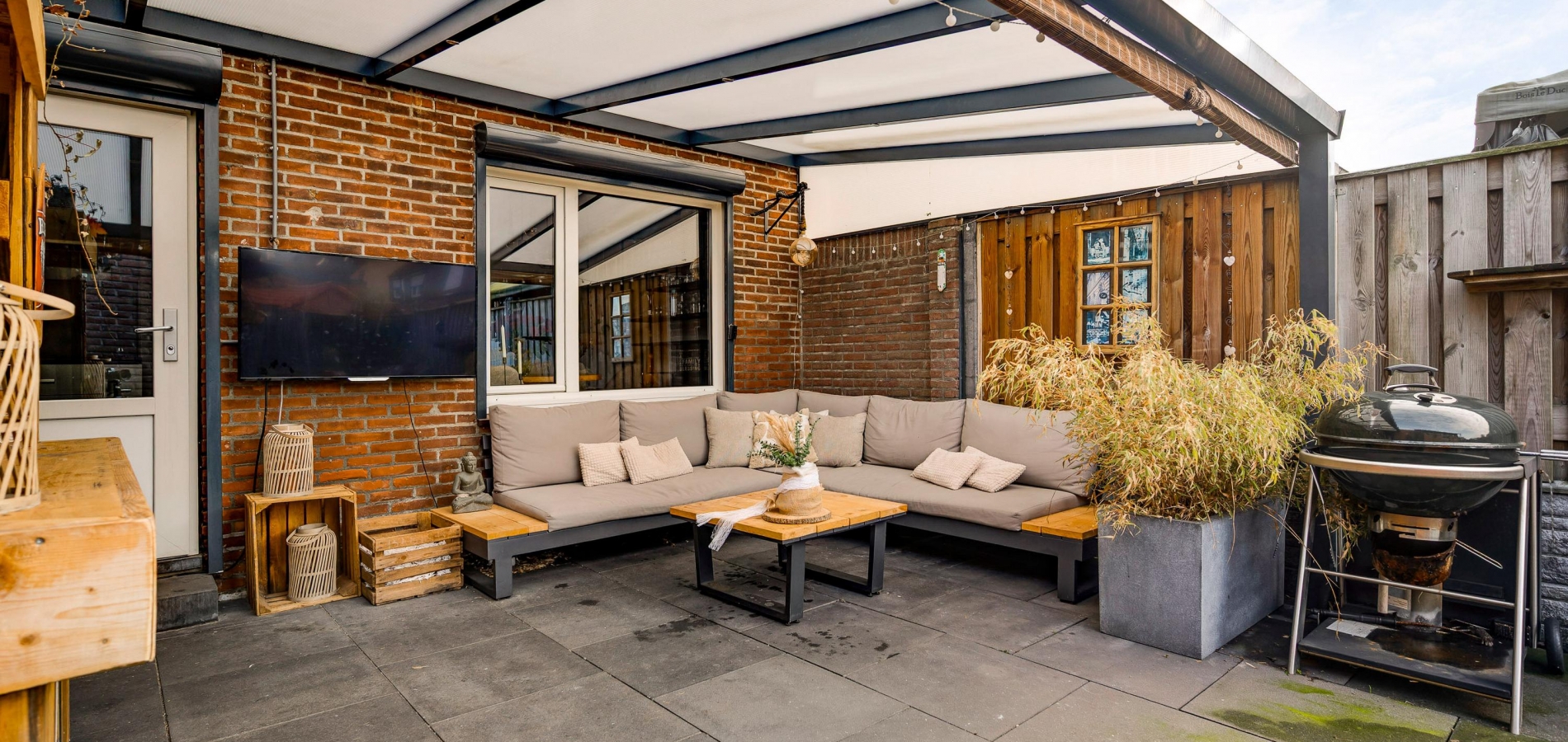 Onderhoudsvriendelijke tuin met een overdekt terras, berging en achterom