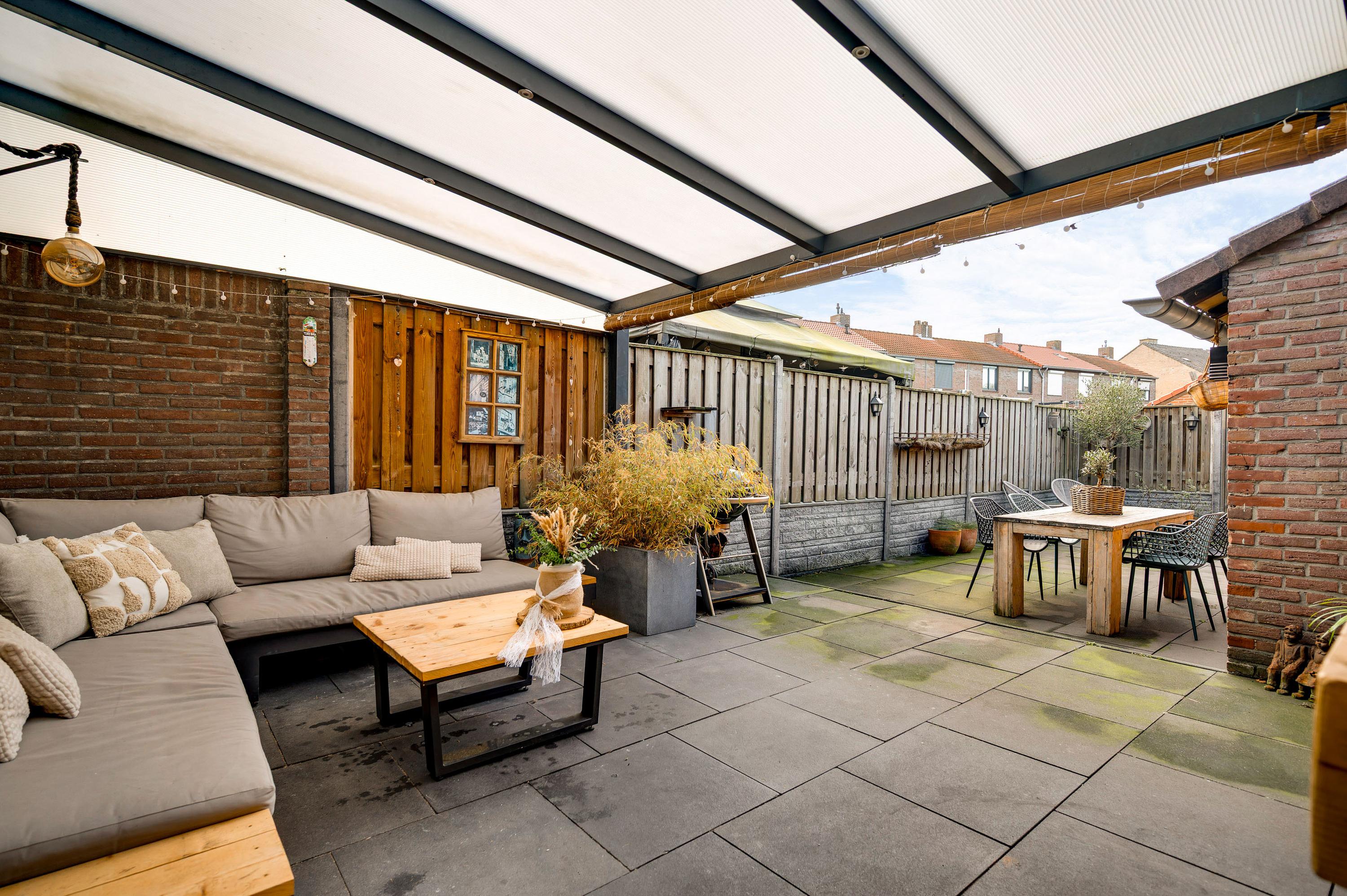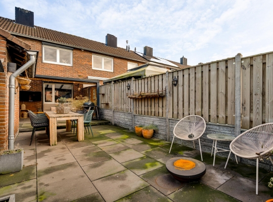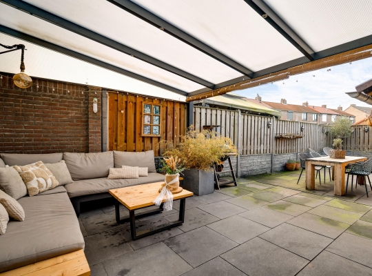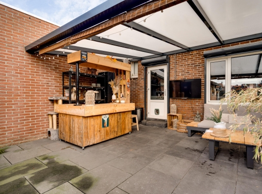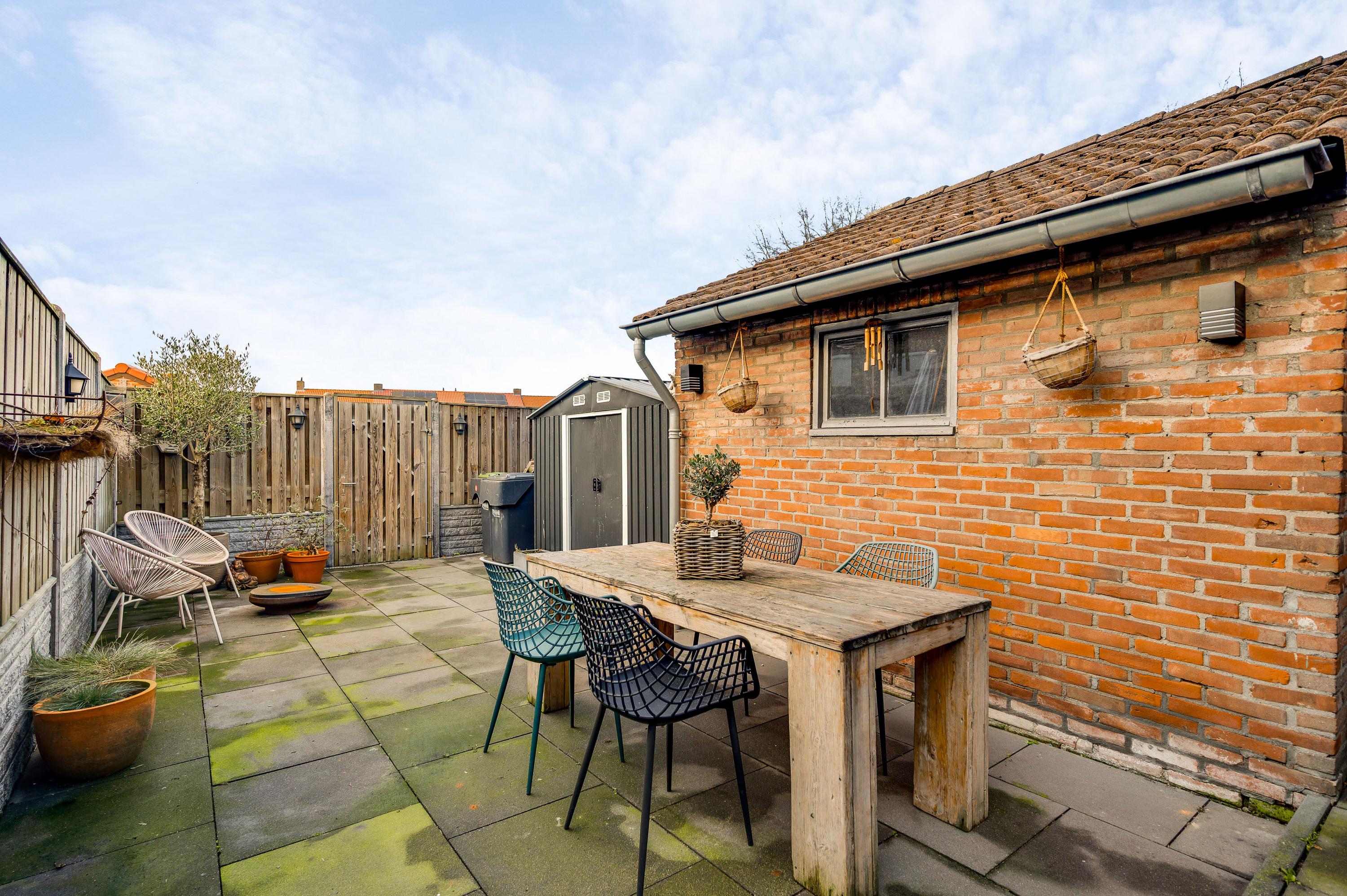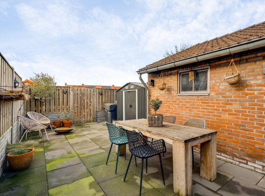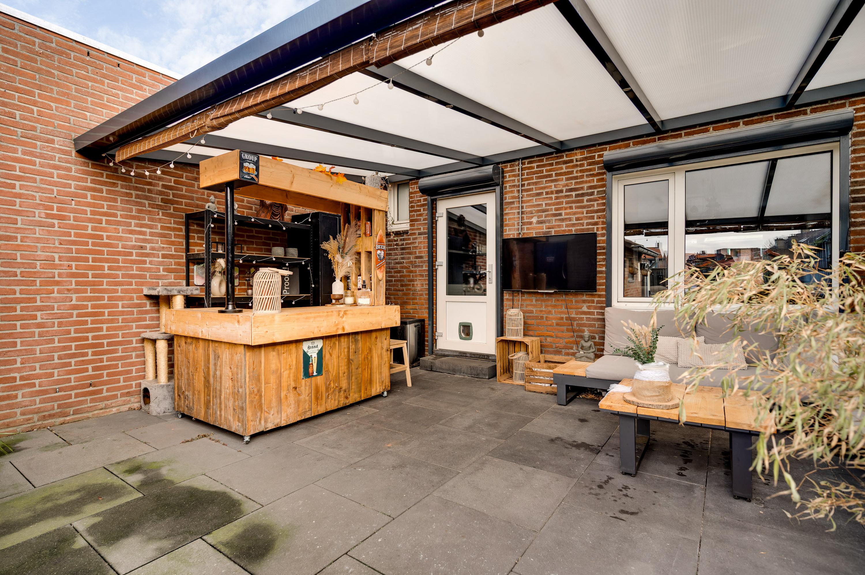 Met een hapje en een drankje in de hand loopt u naar het overdekte terras (circa 5,85 x 3,55), waar de bewoners bij mooi weer vele uren doorbrengen. De aansluitende, geheel bestrate tuin op het westen is heel onderhoudsvriendelijk aangelegd. In de stenen berging (circa 3,29 x 2,36) is plek voor de (kinder)fietsen en er is een poort naar de steeg. De tweede berging, met dubbele deuren aan de tuinzijde, blijft eveneens achter.
