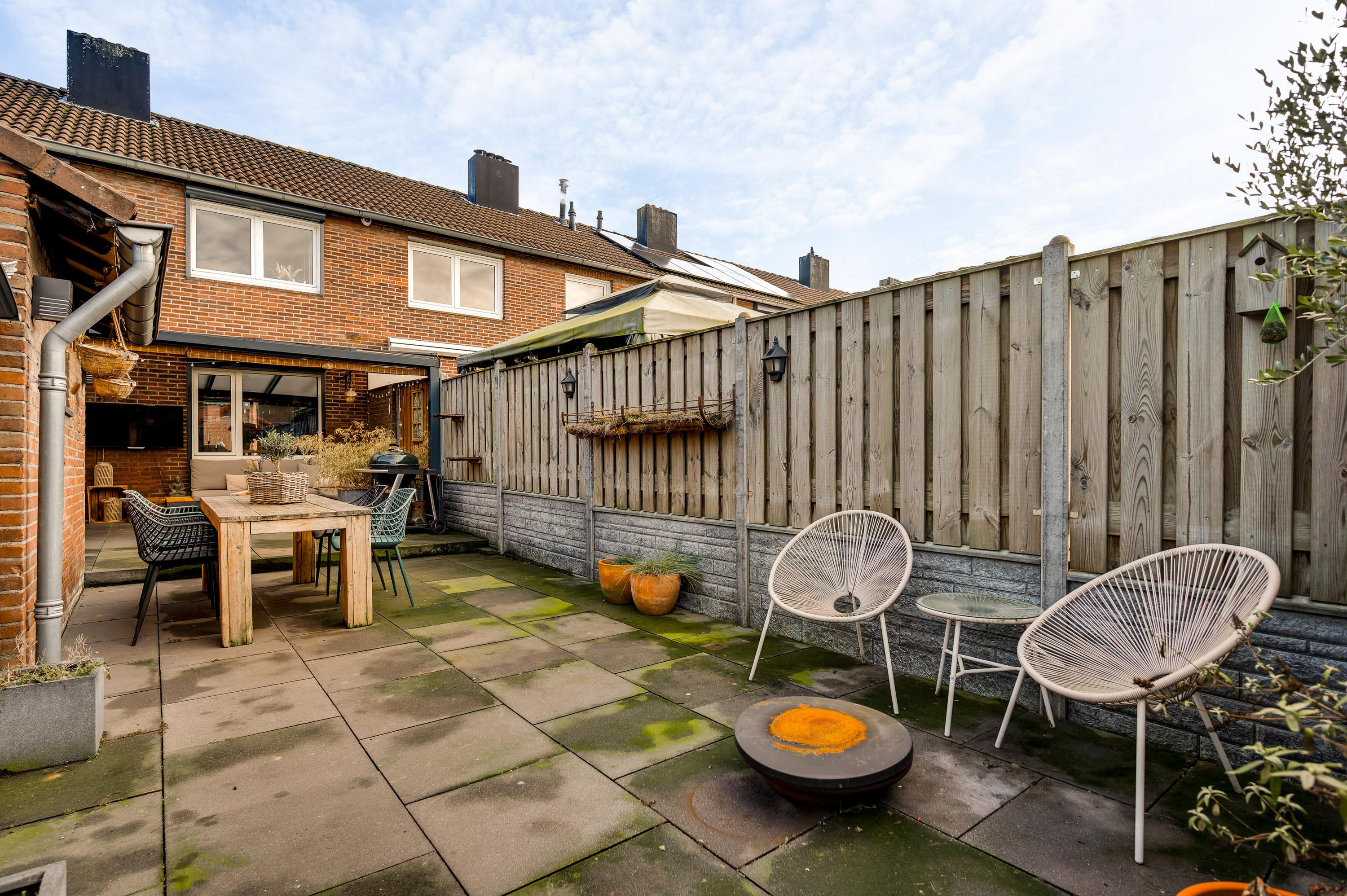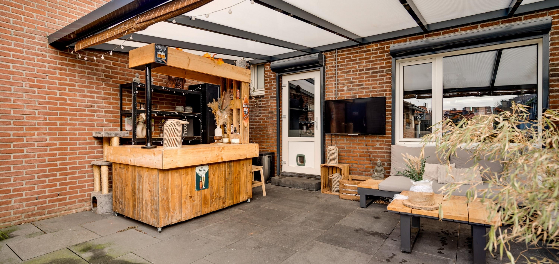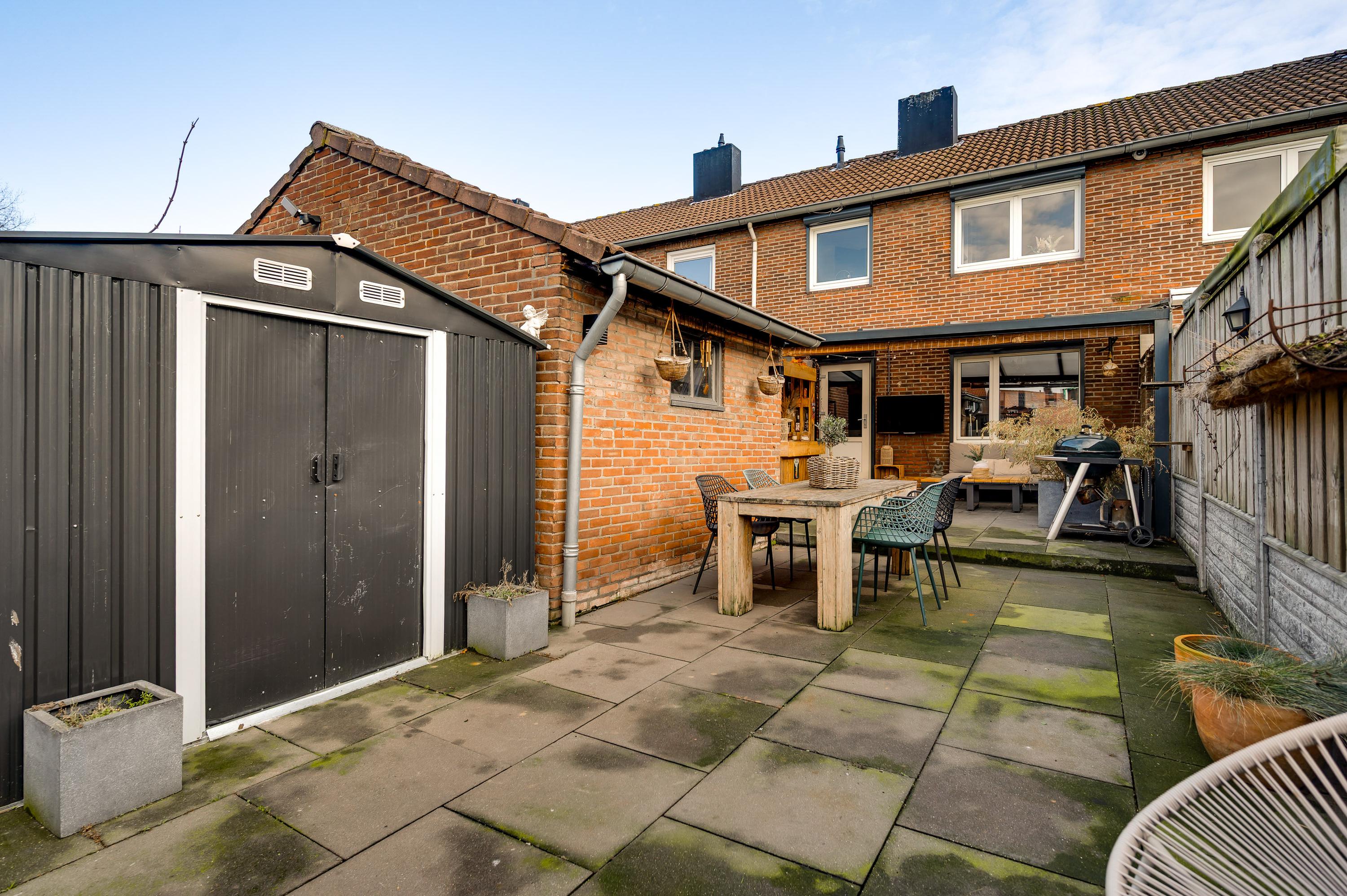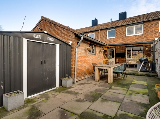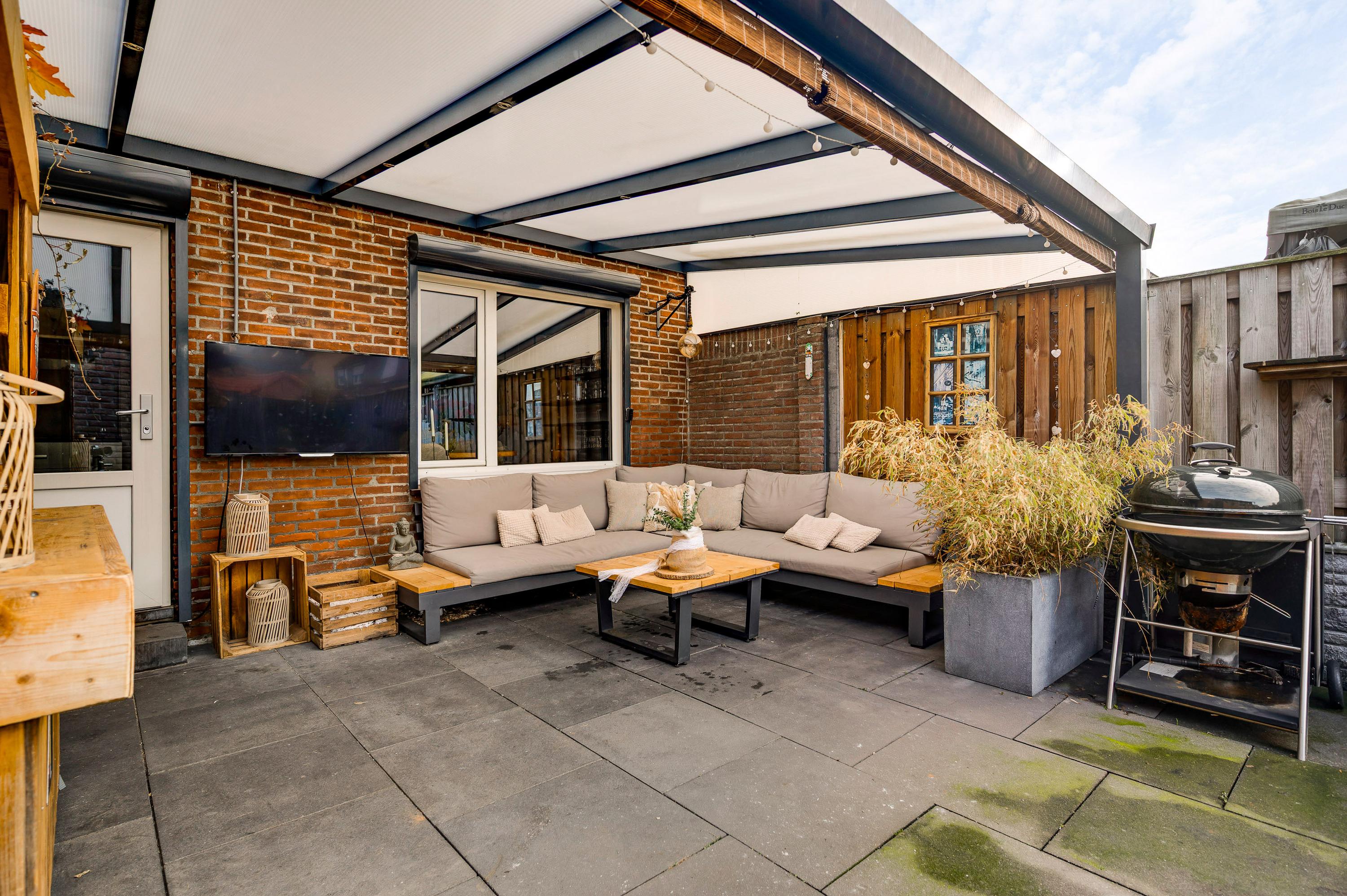 Met een hapje en een drankje in de hand loopt u naar het overdekte terras (circa 5,85 x 3,55), waar de bewoners bij mooi weer vele uren doorbrengen. De aansluitende, geheel bestrate tuin op het westen is heel onderhoudsvriendelijk aangelegd. In de stenen berging (circa 3,29 x 2,36) is plek voor de (kinder)fietsen en er is een poort naar de steeg. De tweede berging, met dubbele deuren aan de tuinzijde, blijft eveneens achter.