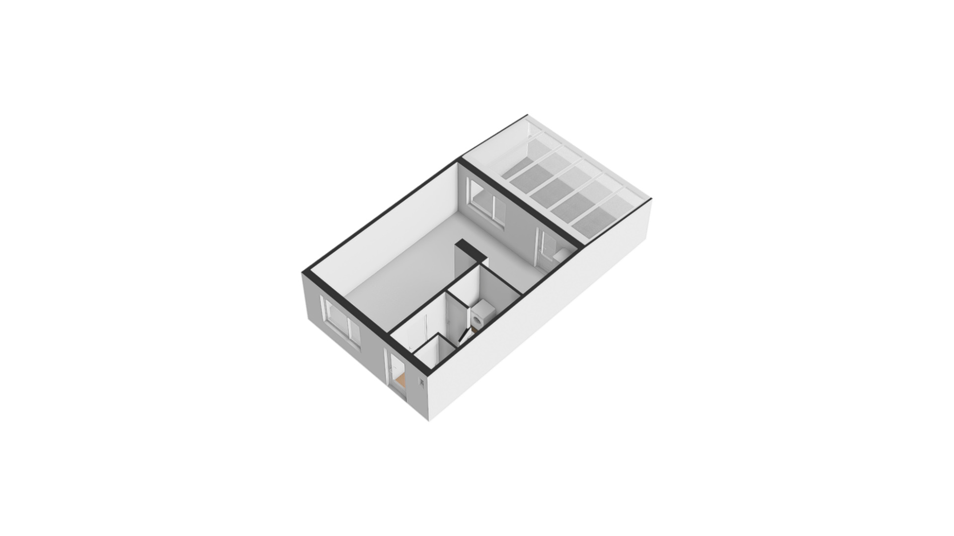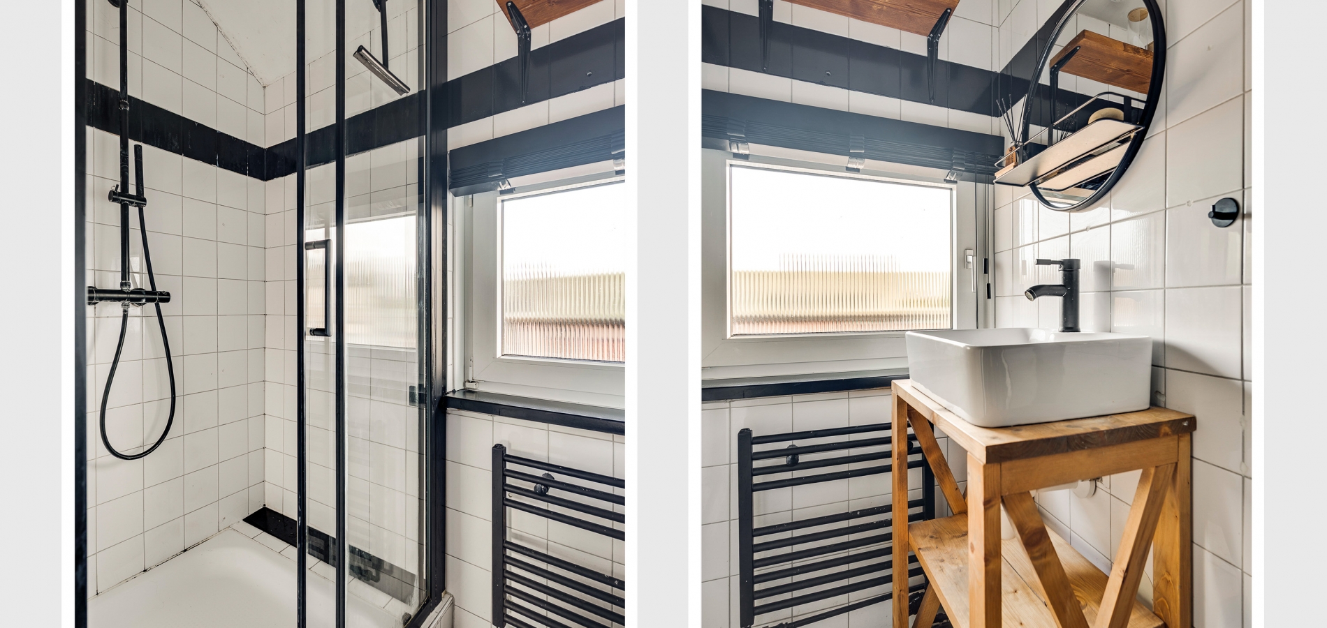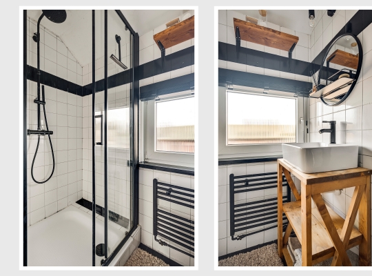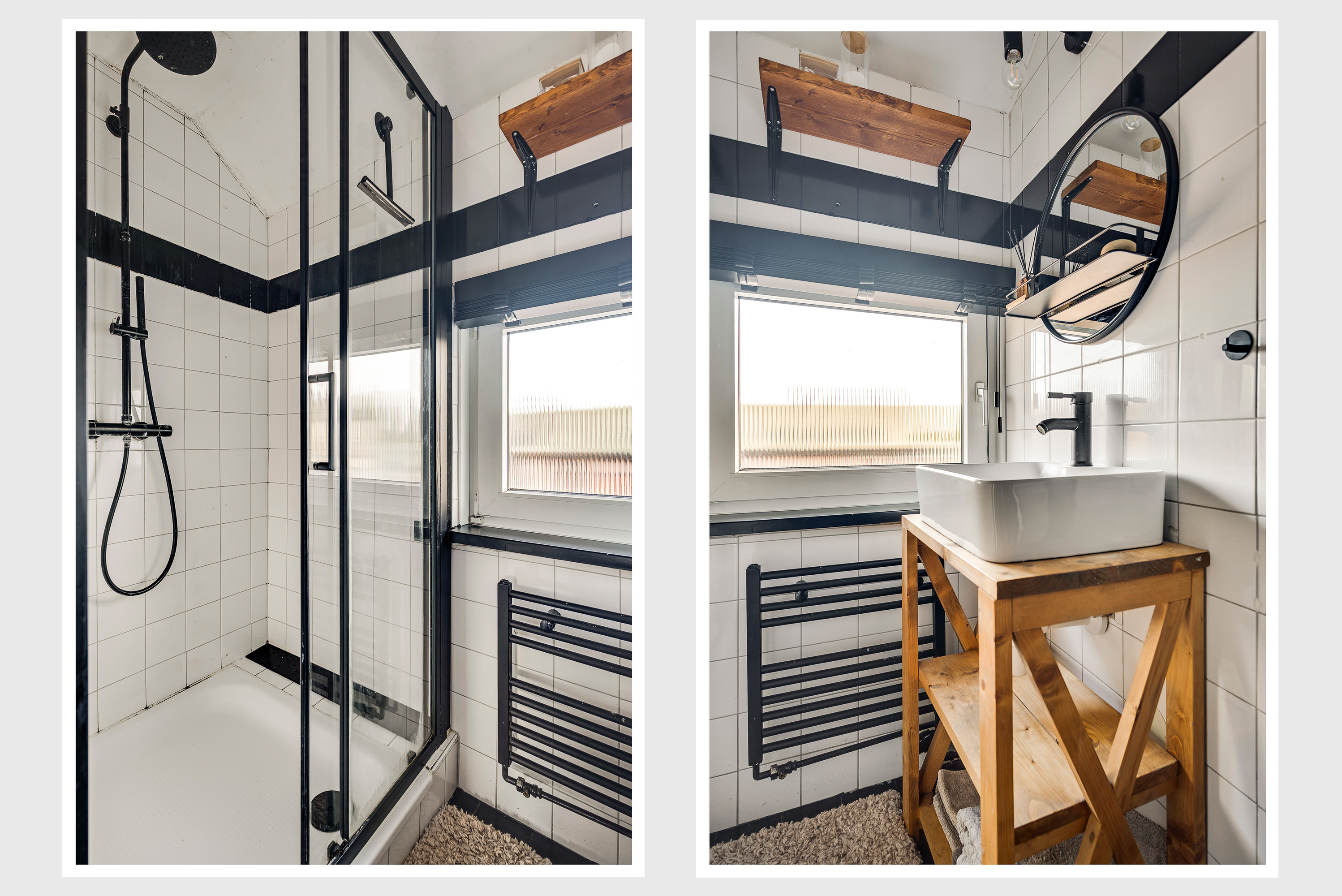De doucheruimte (circa 1,81 x 1,08), uitgevoerd in zwart en wit, heeft een groot raam in de voorgevel. Een van de fraaie elementen is het houten meubel, waarop een wastafel met zwarte kraan staat.