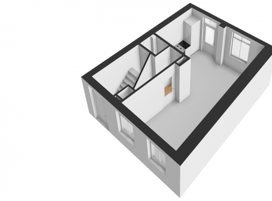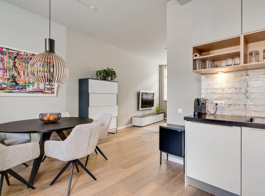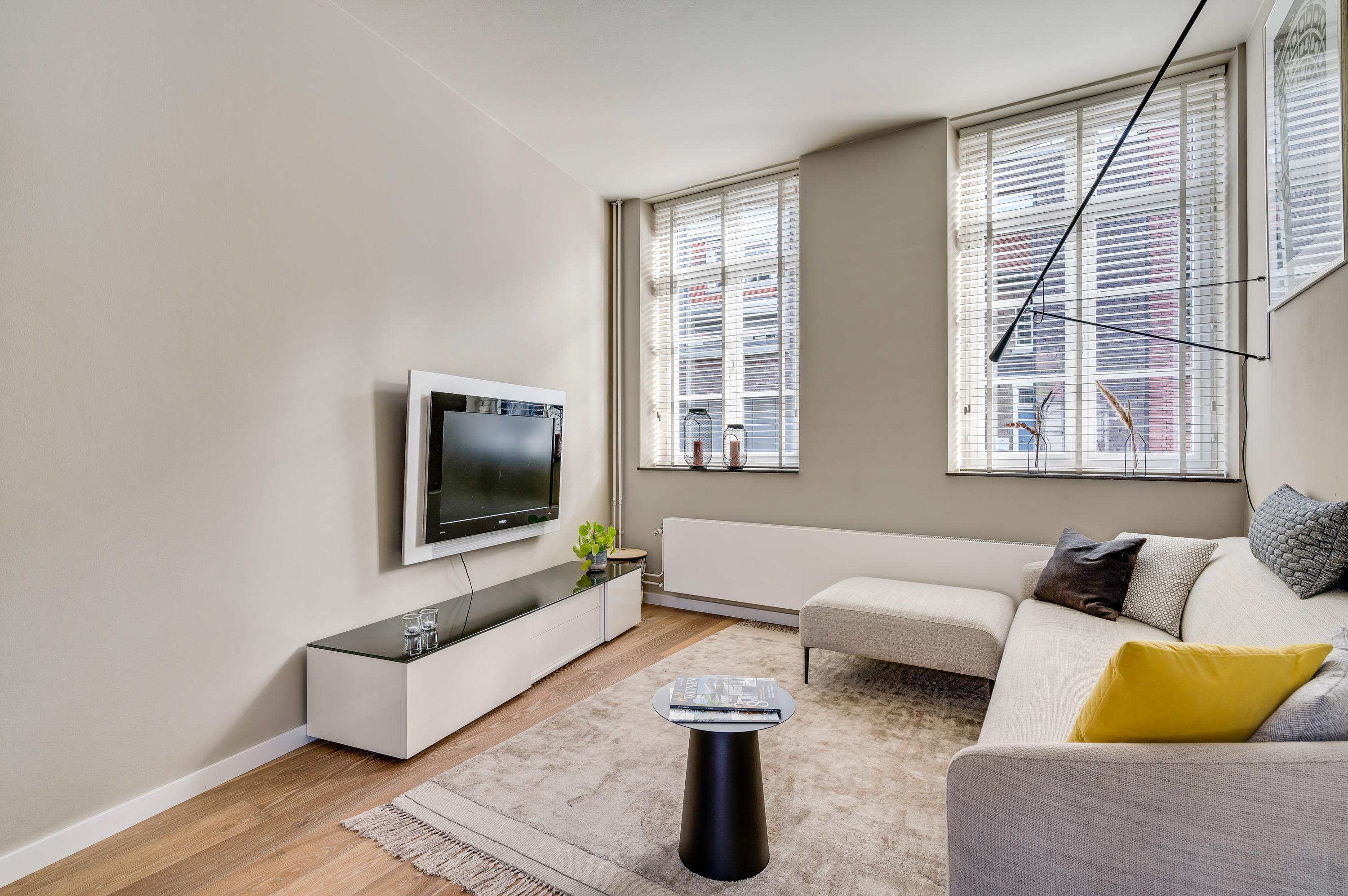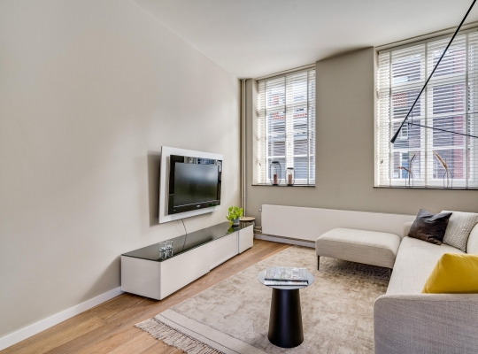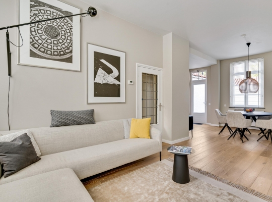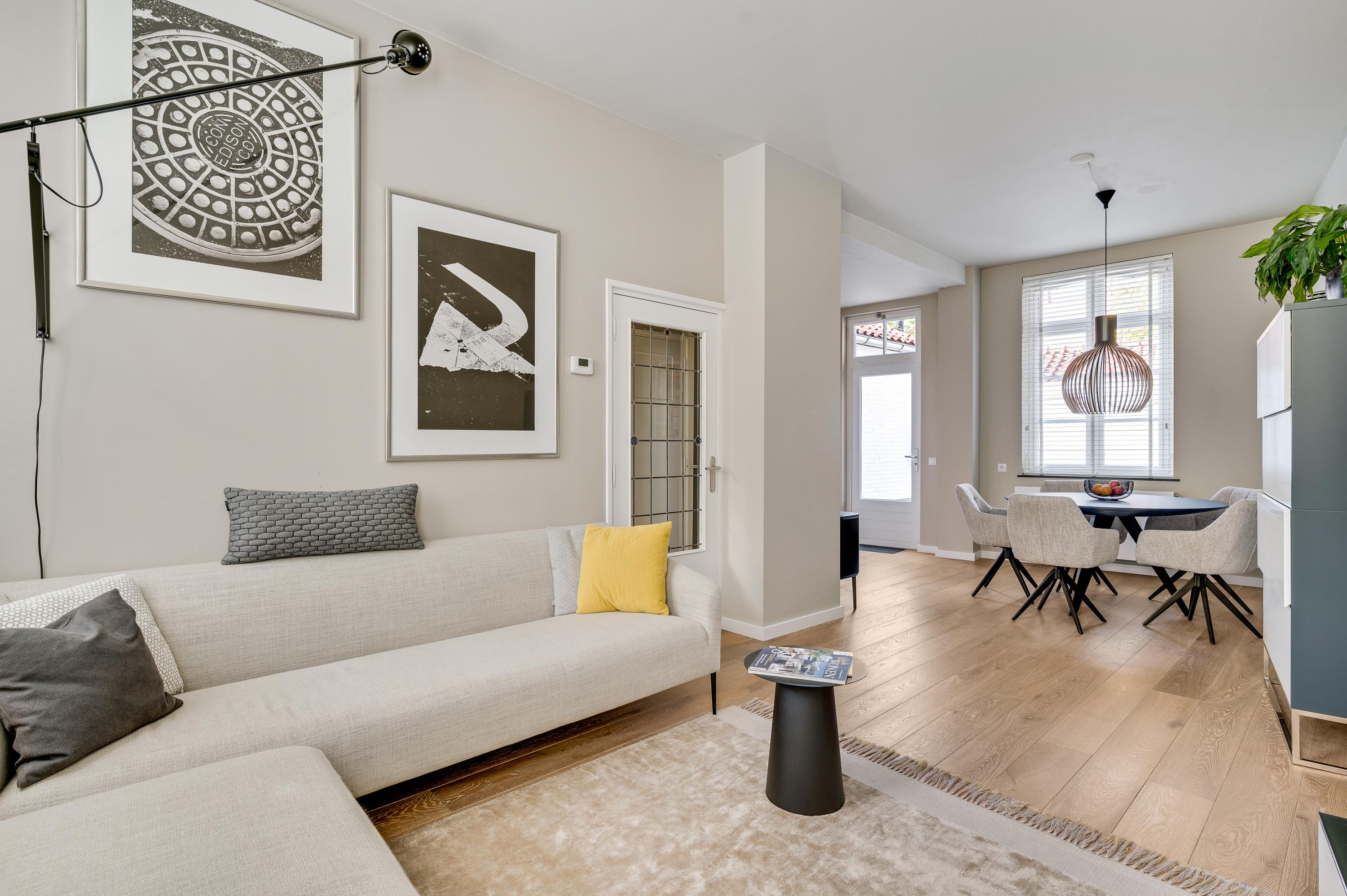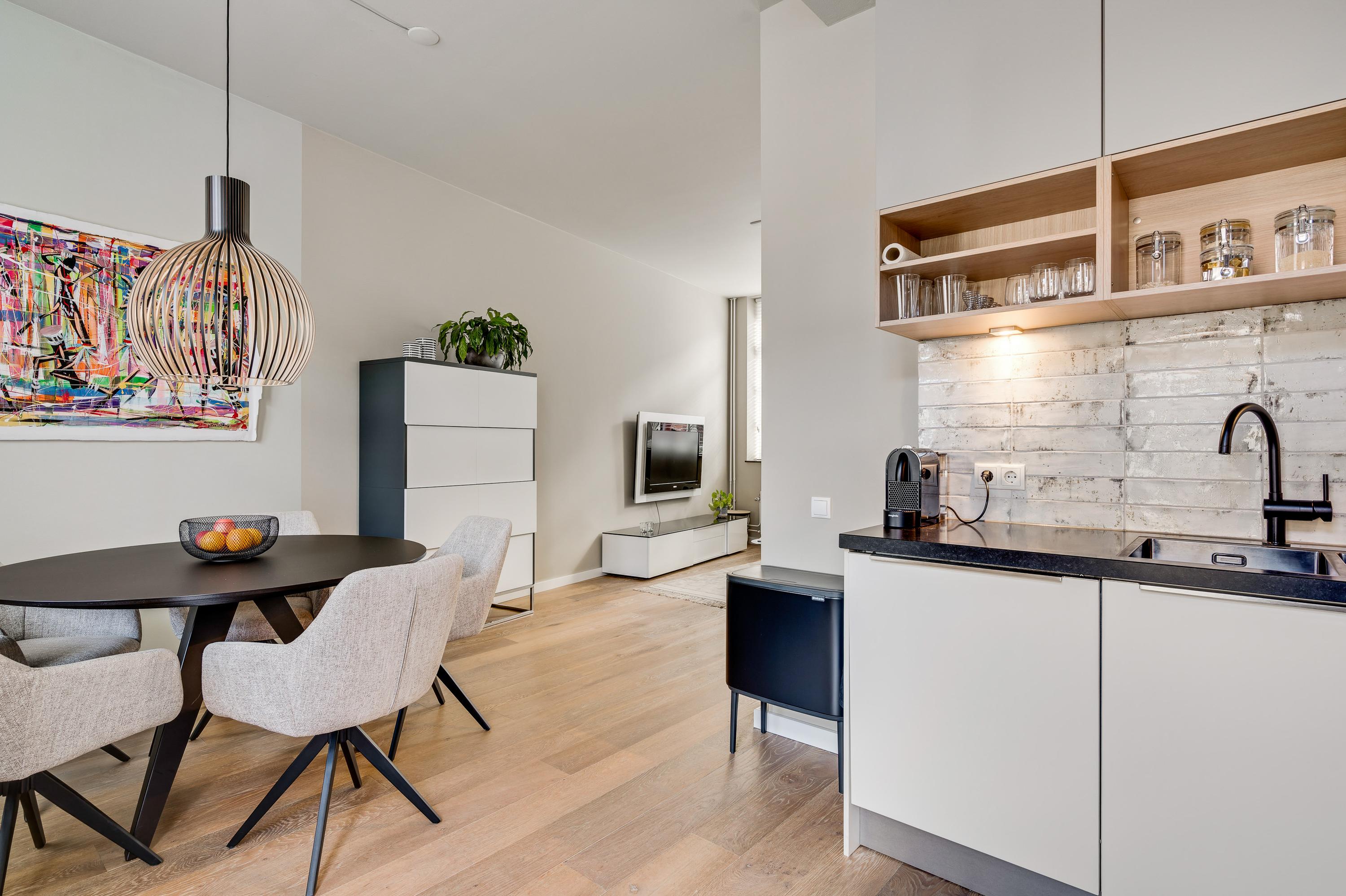 De woonkamer met open keuken oogt ruimtelijk. Het zitgedeelte is aan de voorzijde en het eetgedeelte is, net als de keuken, aan de achterzijde. Grote ramen zorgen voor veel lichtinval en de wanden zijn, net als het plafond, gestuct. Dit is een woonkamer met sfeer, klaar om in te richten naar eigen smaak.