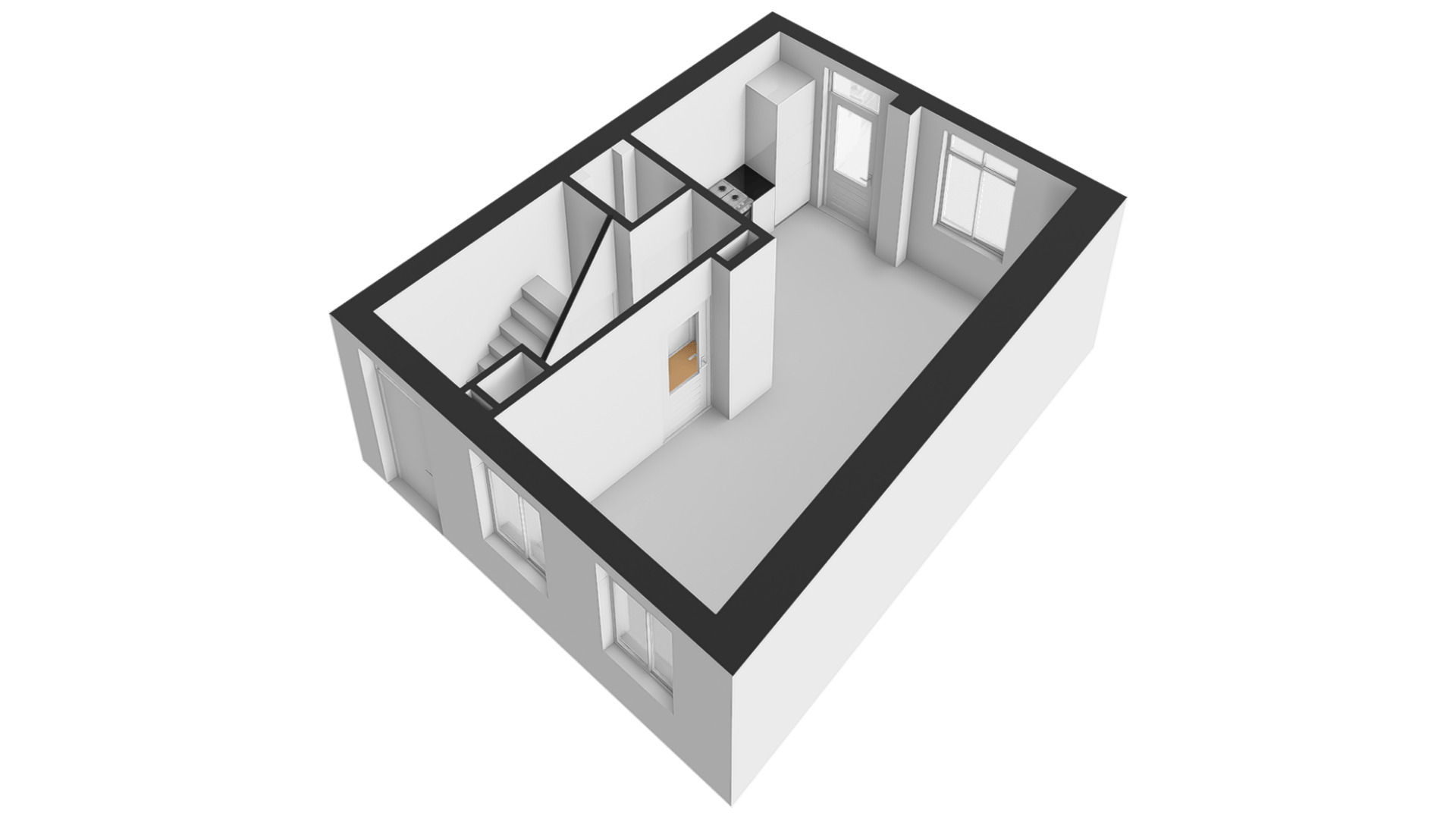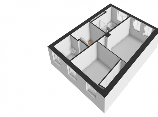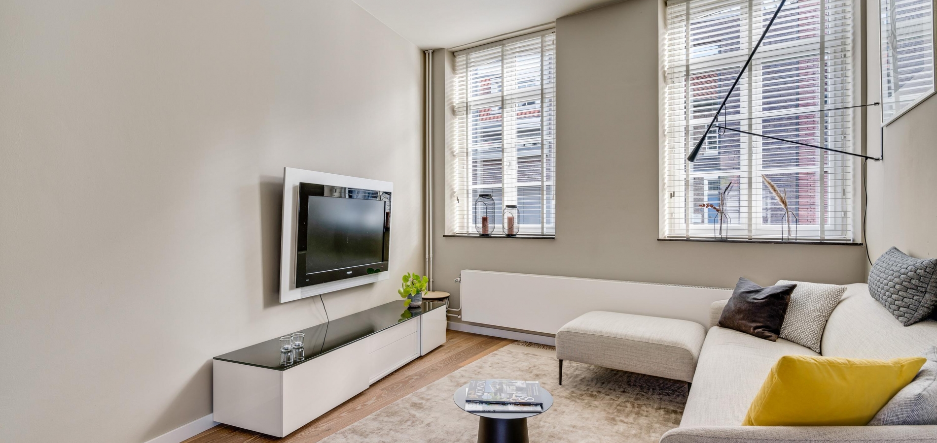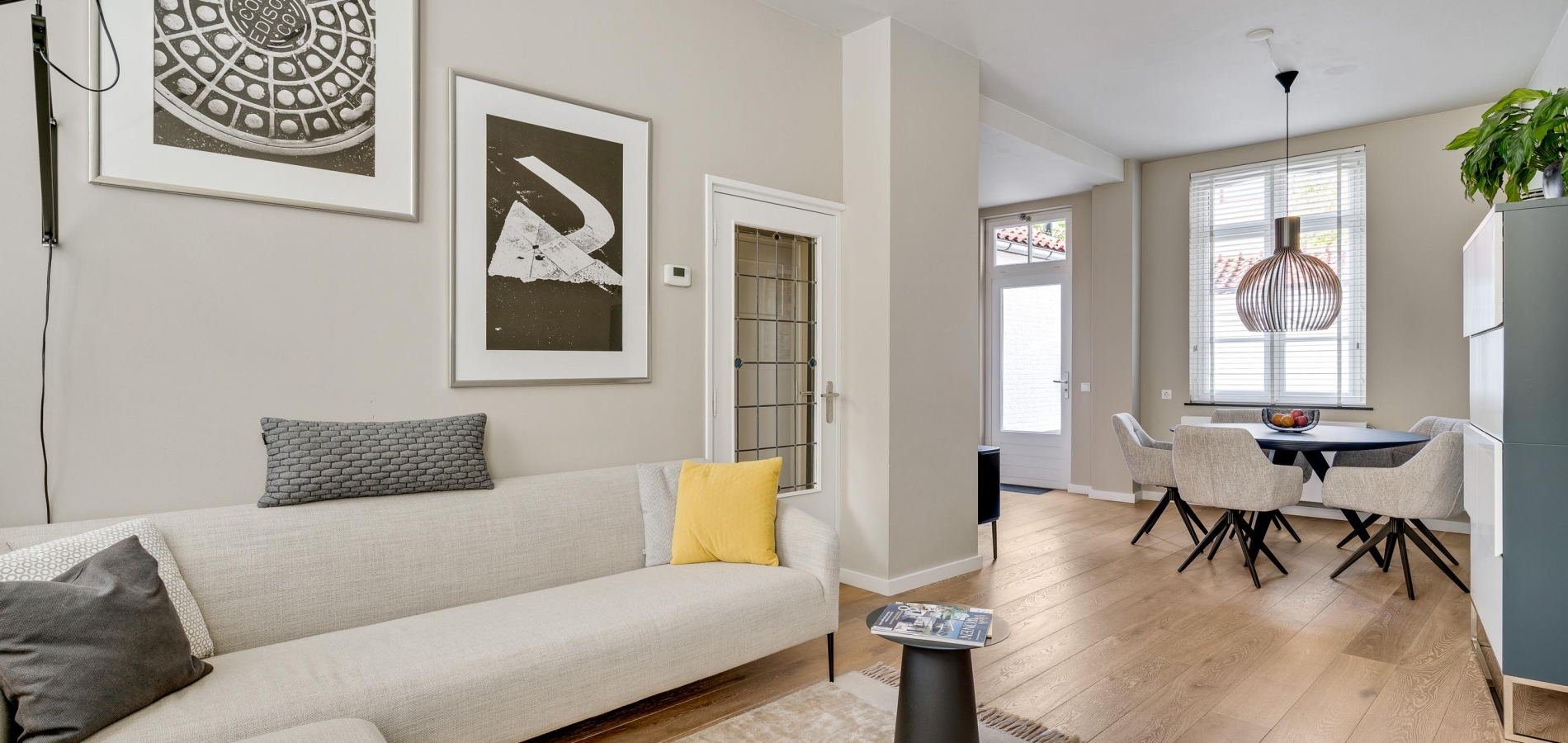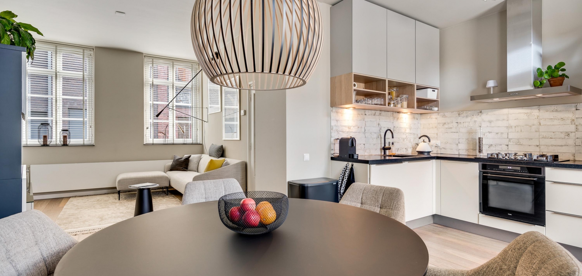 De woonkamer met open keuken oogt ruimtelijk. Het zitgedeelte is aan de voorzijde en het eetgedeelte is, net als de keuken, aan de achterzijde. Grote ramen zorgen voor veel lichtinval en de wanden zijn, net als het plafond, gestuct. Dit is een woonkamer met sfeer, klaar om in te richten naar eigen smaak.