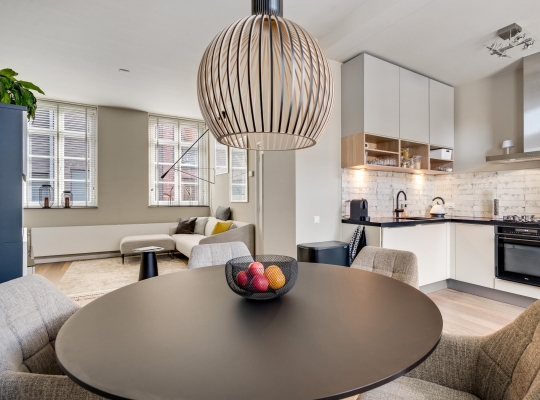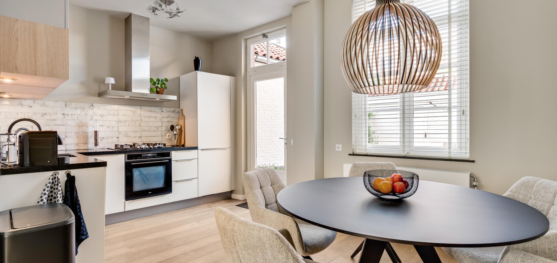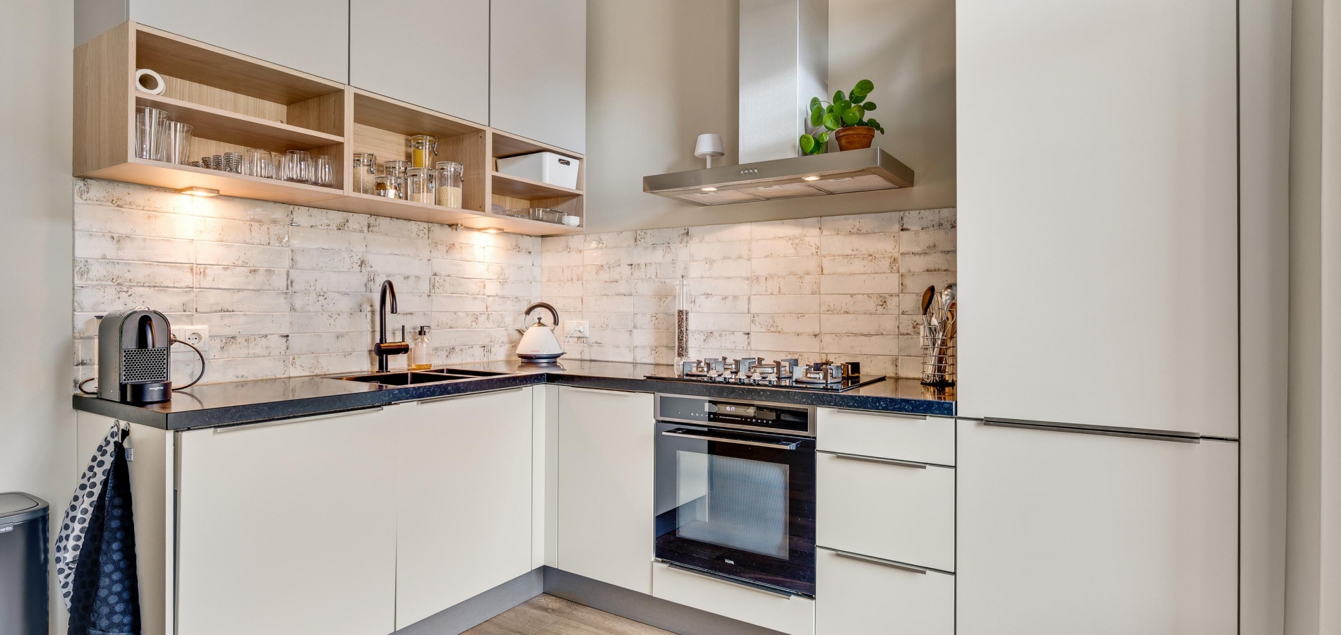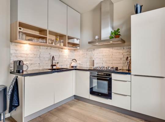In de keuken staat een lichte hoekopstelling, die in 2021 deels is vernieuwd. Het zwarte aanrecht is van stijlvol composiet en de lichte wandtegels passen perfect in het geheel. De 5-pits gaskookplaat, afzuigkap, koel-/vriescombinatie, vaatwasser en combi-oven zijn ingebouwd.